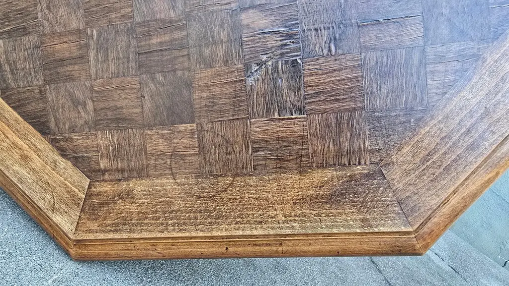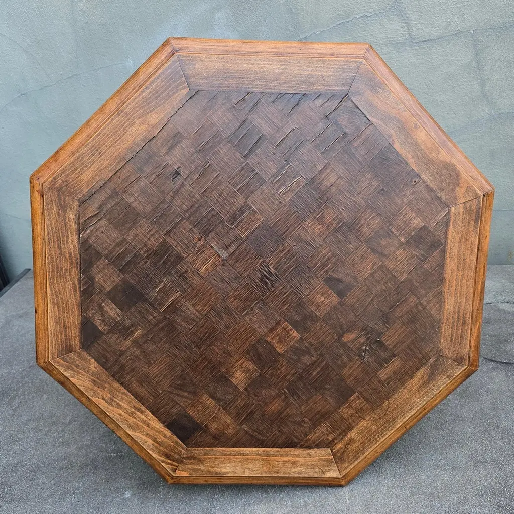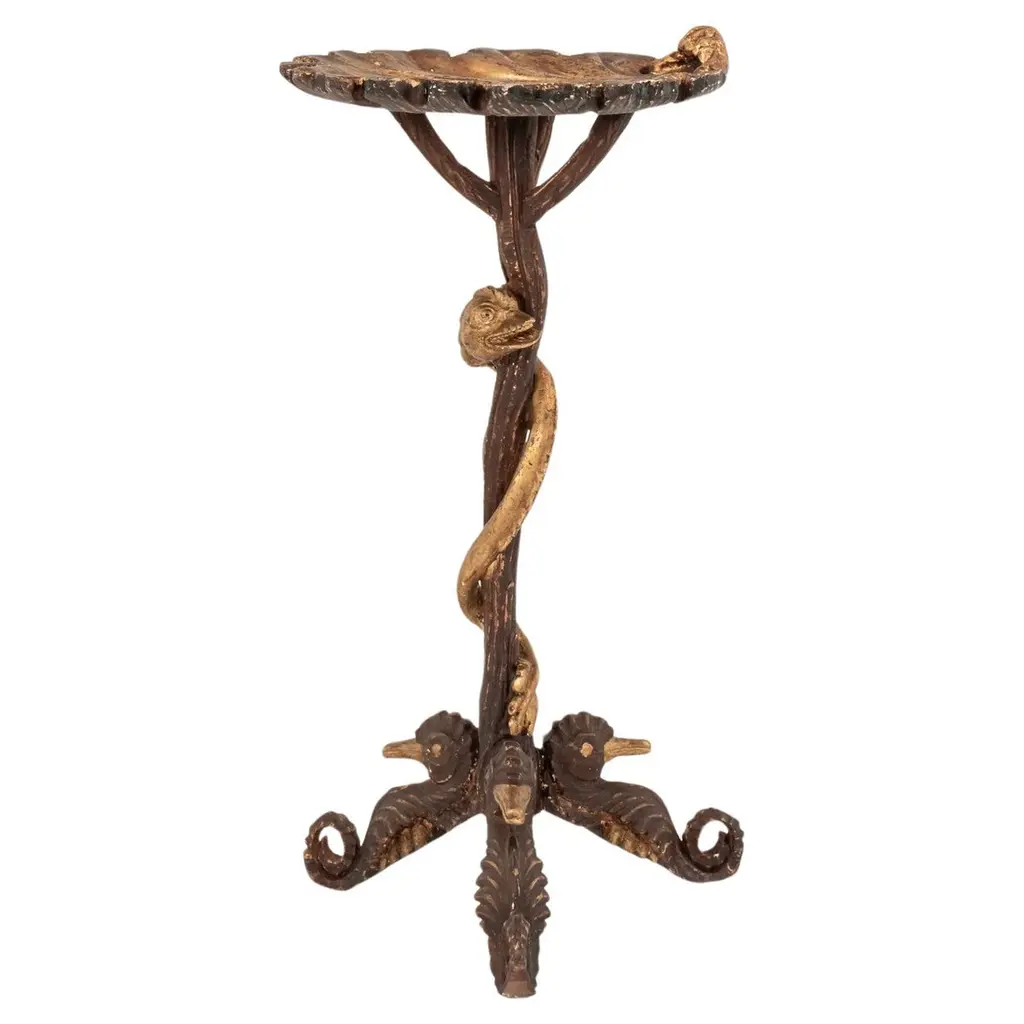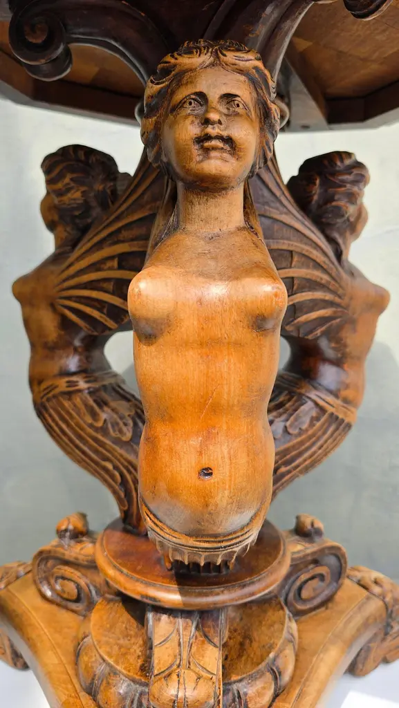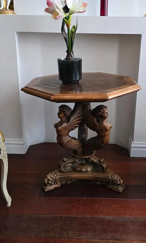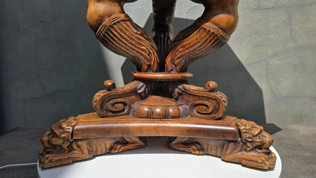 19th Century Italian Table with Carved Female Sphinxes and Lions – Octagonal TopA highly detailed hand-carved table from Italy, circa 1850–1880. This rare piece blends mythological iconography with masterful woodwork.The base features three female sphinxes — mythical creatures with a woman’s head and bust seamlessly merging into lion bodies. Their hair, faces, and feline limbs are beautifully sculpted with remarkable precision. Beneath them sit three fully carved lions, each rendered in the round with manes, paws, and expressive features.The octagonal tabletop is decorated with a fine checkerboard inlay of warm-toned wood veneer squares, framed by a shaped edge.Note: the top shows visible signs of wear, scratches, and some surface damage (see photos), consistent with age and use.Dimensions:Height: 74 cm (29 inches)Diameter: 70 cm (27.5 inches)Origin: ItalyPeriod: Mid to late 19th centuryMaterial: Solid carved walnutStyle: Neorenaissance / EclecticCondition:Structurally solidOriginal patina retainedSurface wear and marks on the top due to ageA rare statement piece for collectors of mythological design, fine European furniture, or neoclassical sculpture. Ideal as a center or accent table.