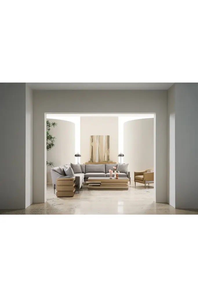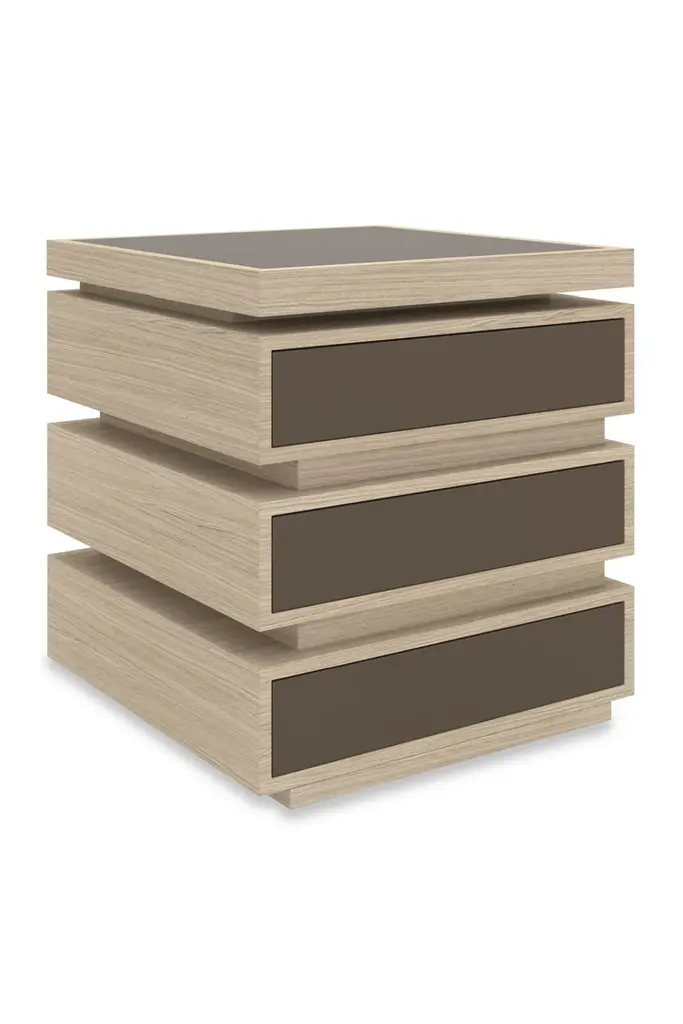 Perfectly sized as an end table, the architectural offset stacking of mixed materials makes this look memorable. The top frame showcases Koto wood finished in Dry Martini and inset with Smoked Bronze mirrored glass. The table tiers are Koto in Dry Martini with a Neutral Metallic finish. Two soft-close drawers are fronted with bronze mirrors. Features open center storage for displaying books and objects. The plinth base is finished in Neutral Metallic paint. Hidden casters are included for ease of movement.