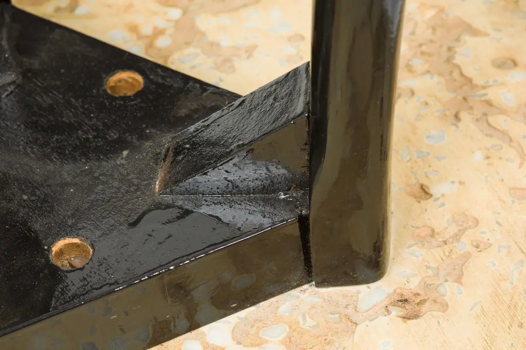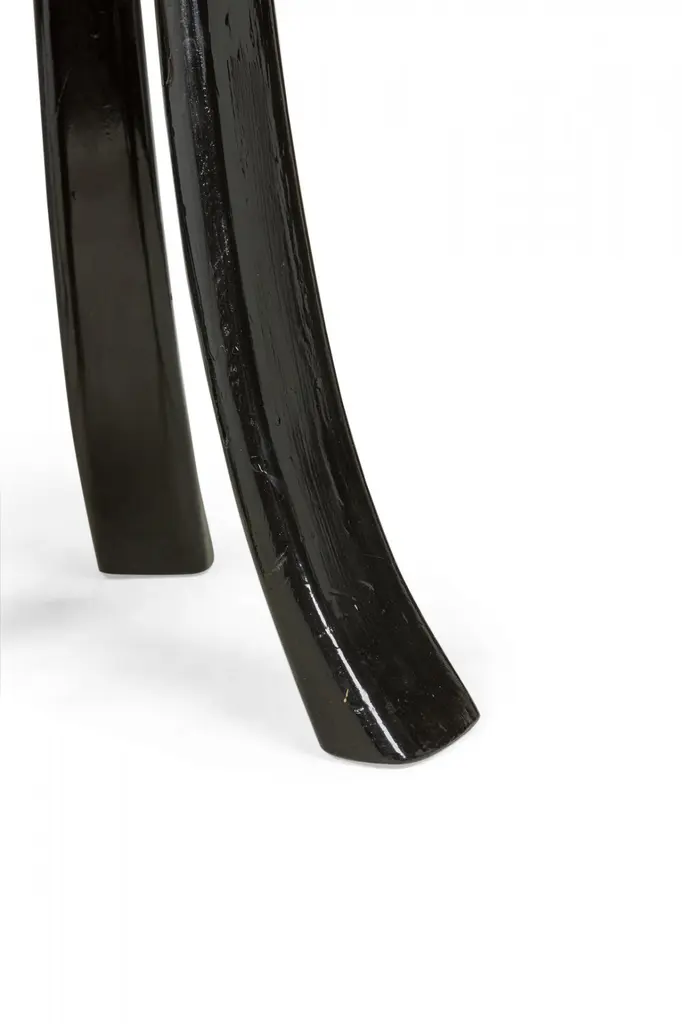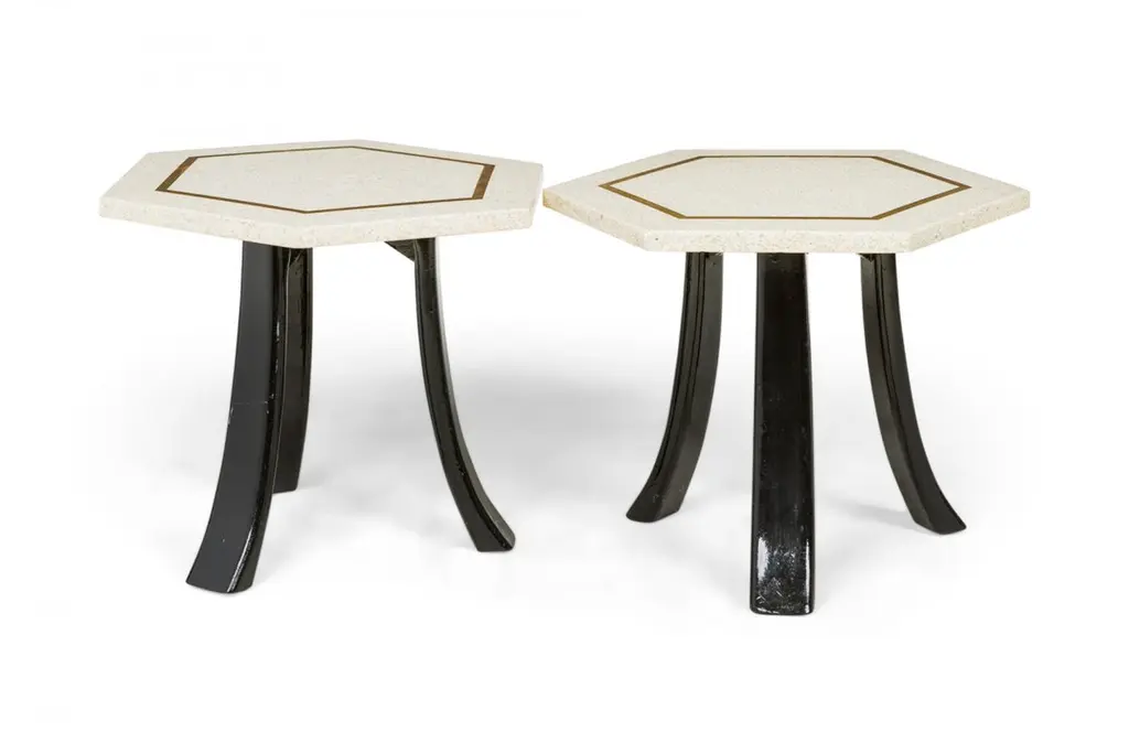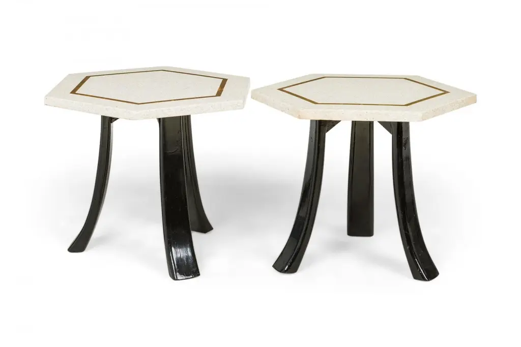 2 American mid-century end / side tables with hexagonal white terrazzo tops with a bronze inlaid hexagonal design supported on three curved black lacquered wooden legs. (Harvey Probber)(Priced Each).