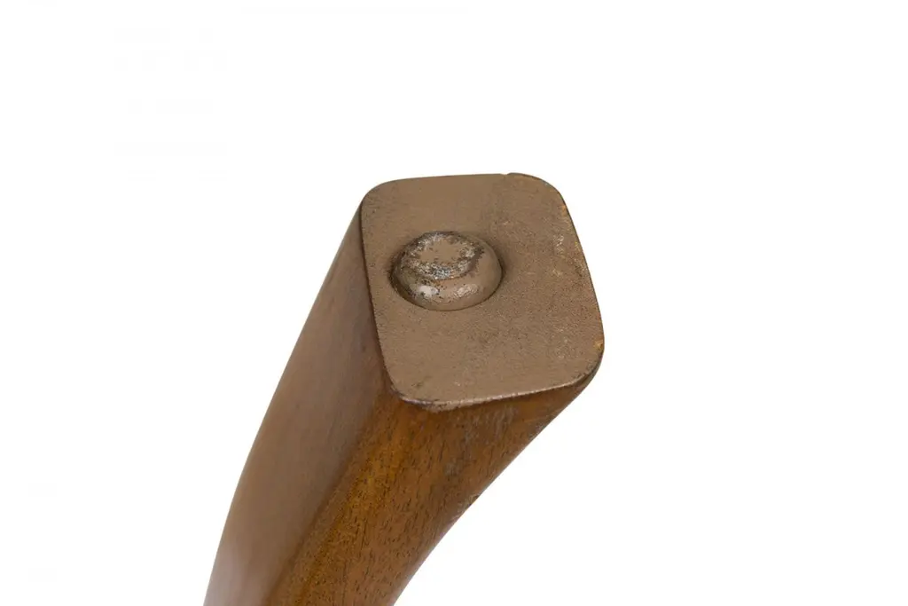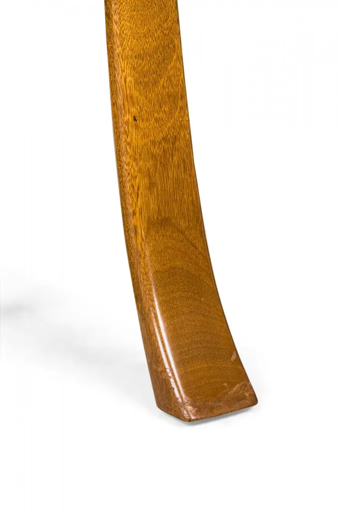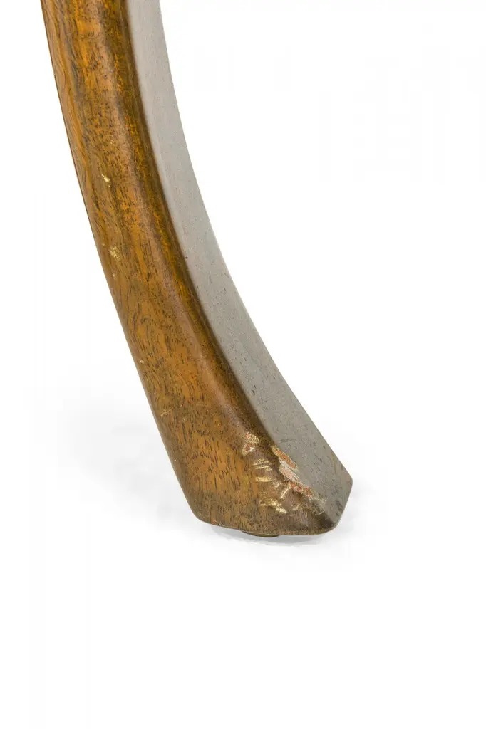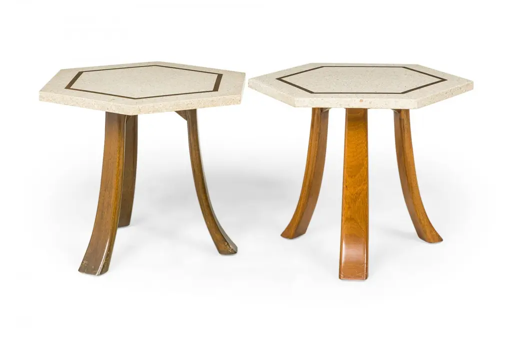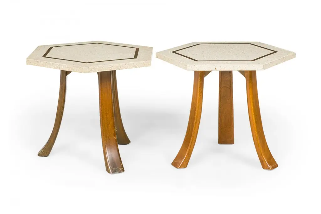 2 American Mid-Century end / side tables with hexagonal white terrazzo tops with a bronze inlaid hexagonal design supported on three curved wooden legs. (HARVEY PROBBER) (PRICED AS Pair)(Similar tables: DUF0356A-E) Slight difference in finish on wooden legs.