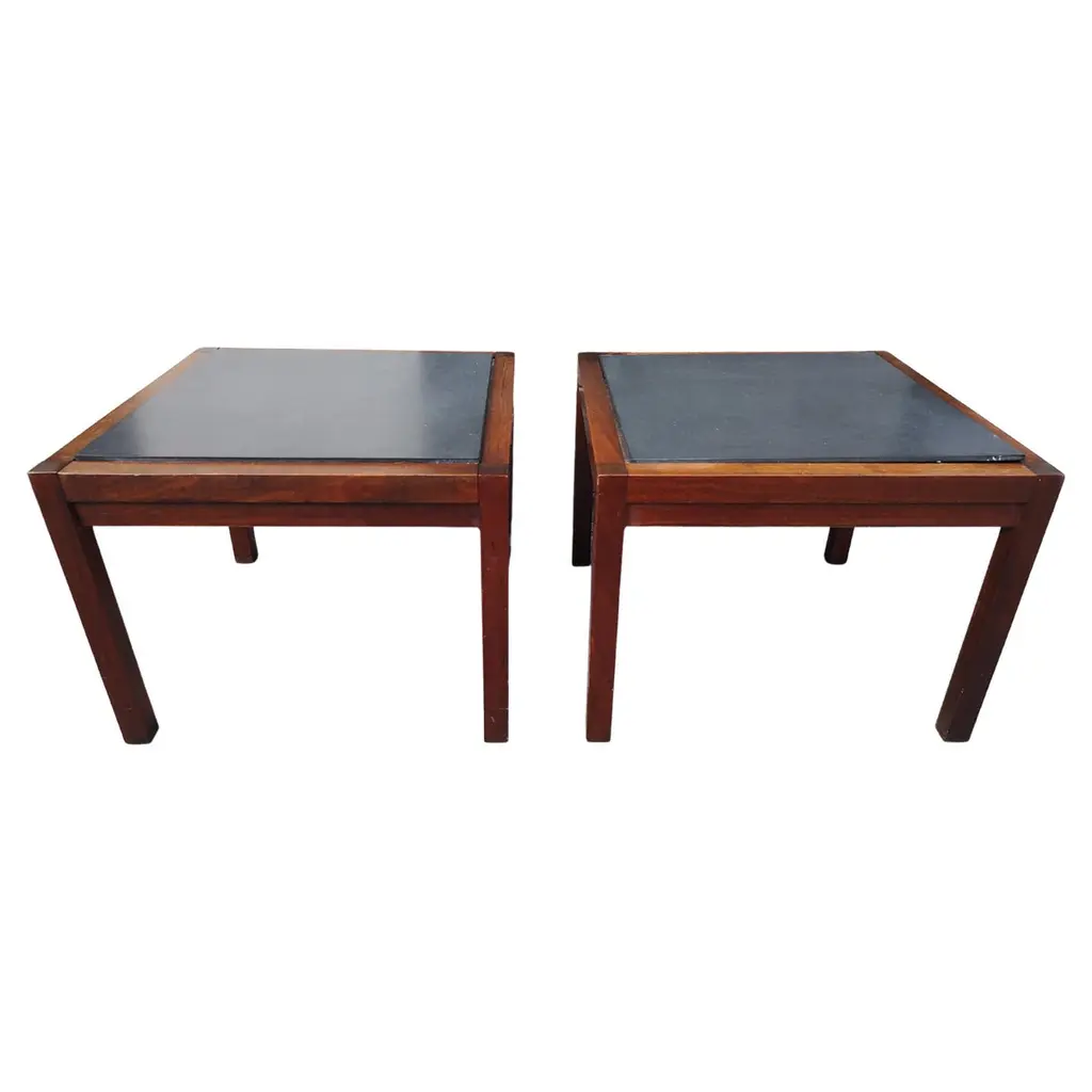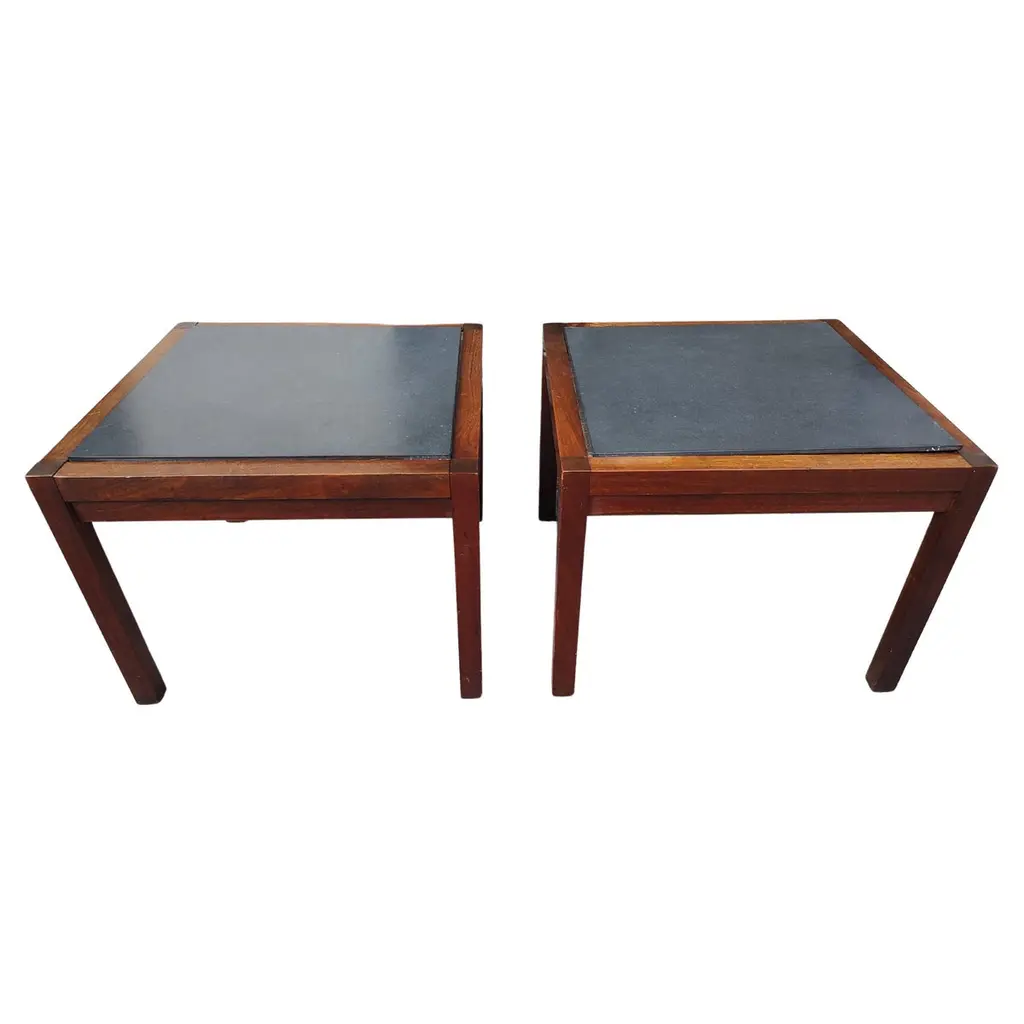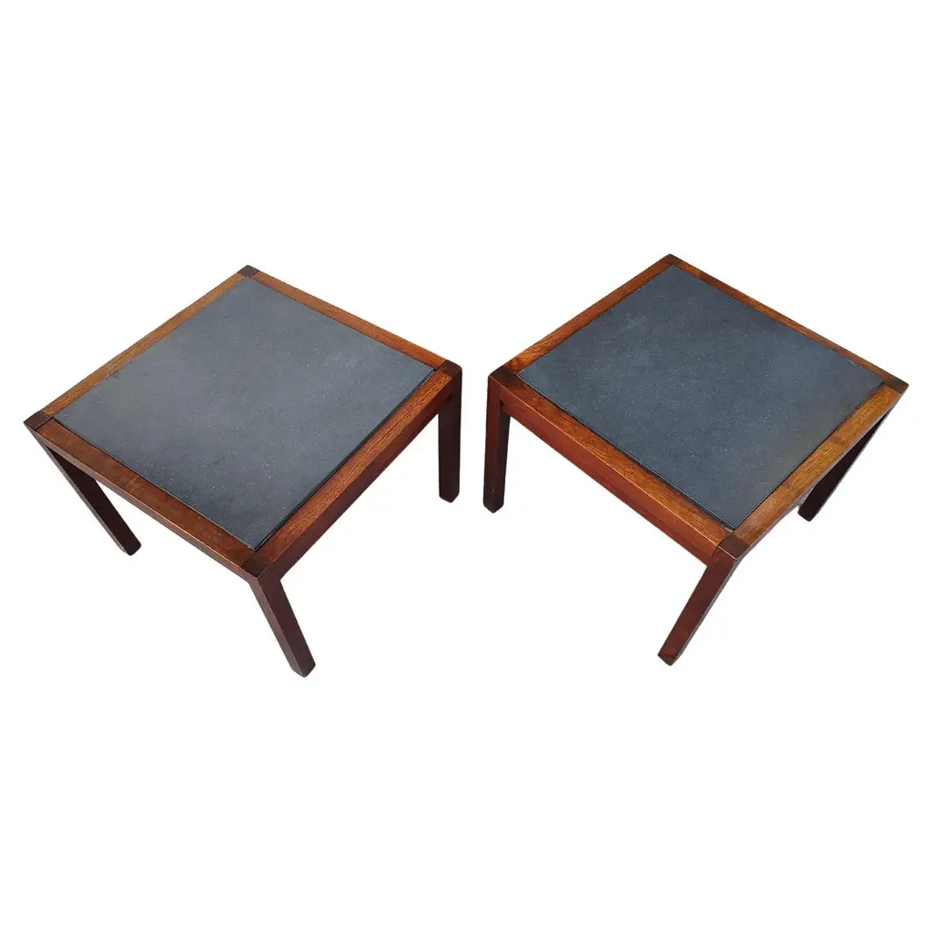 Fabulous pair of Mid-Century Modern Stone top end side tables. Black walnut with a composite stone insert. In excellent vintage condition with minimal wear. 2 pairs available. Sold and priced as a pair. Can be parcel posted.