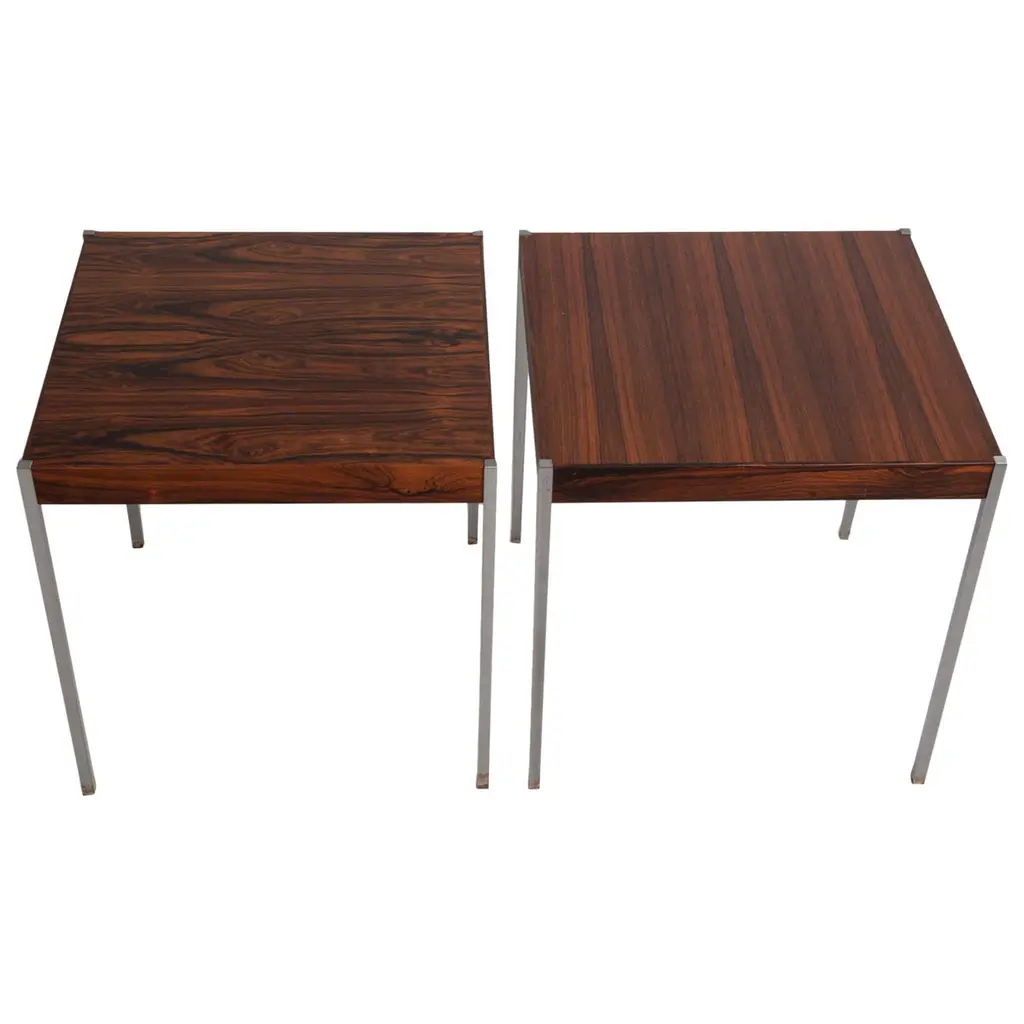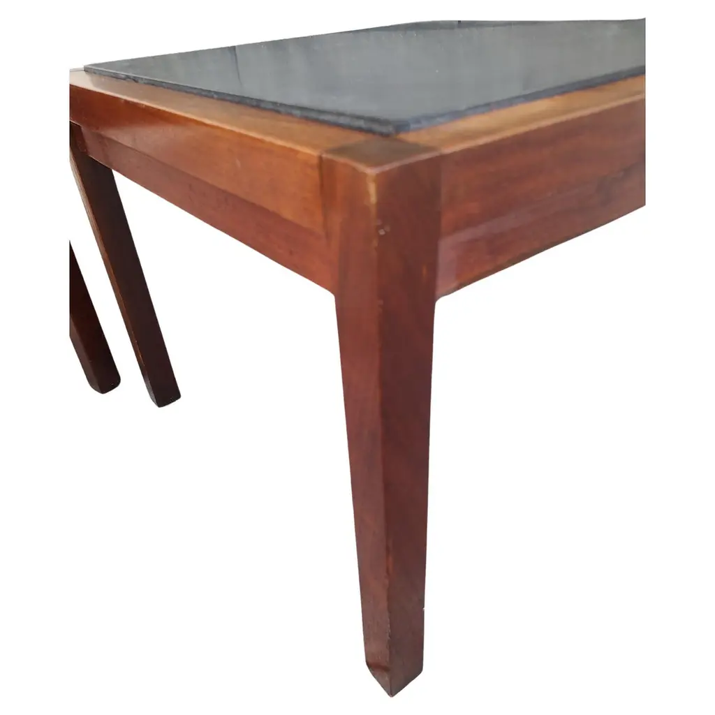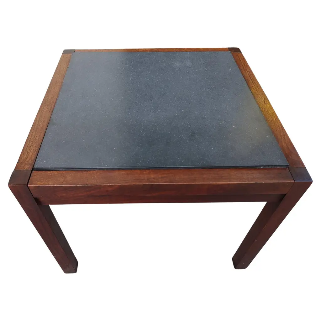 Fabulous pair of Mid-Century Modern Stone top end side tables. Black walnut with a composite stone insert. In excellent vintage condition with minimal wear. 2 pairs available. Sold and priced as a pair. Can be parcel posted.