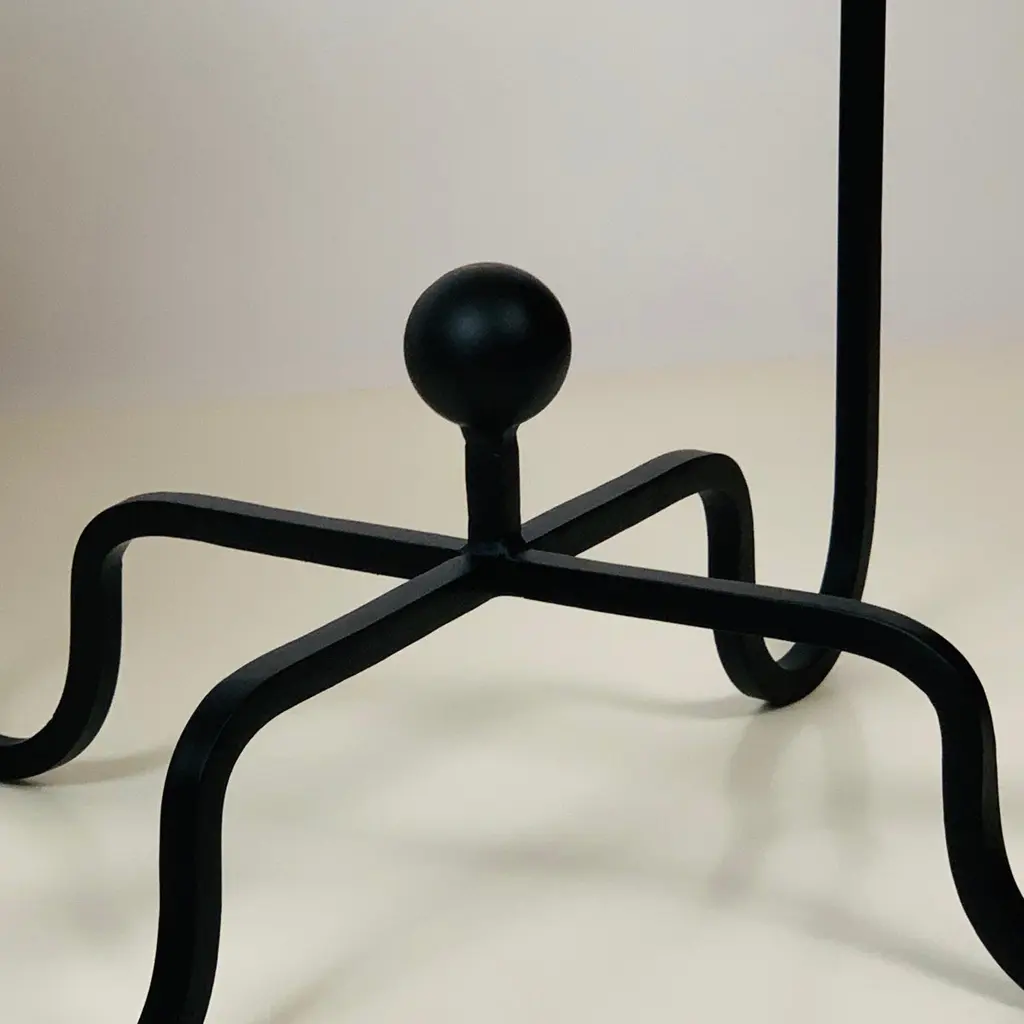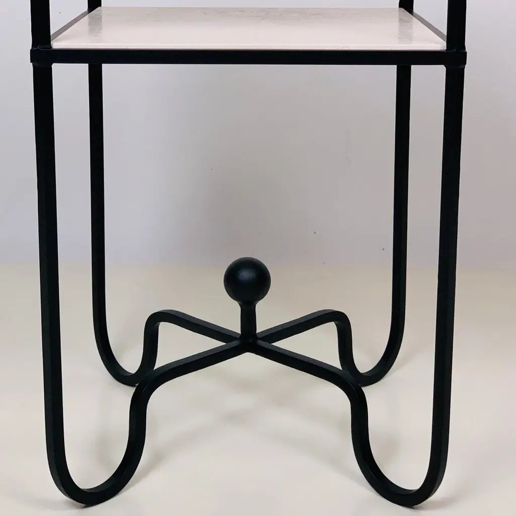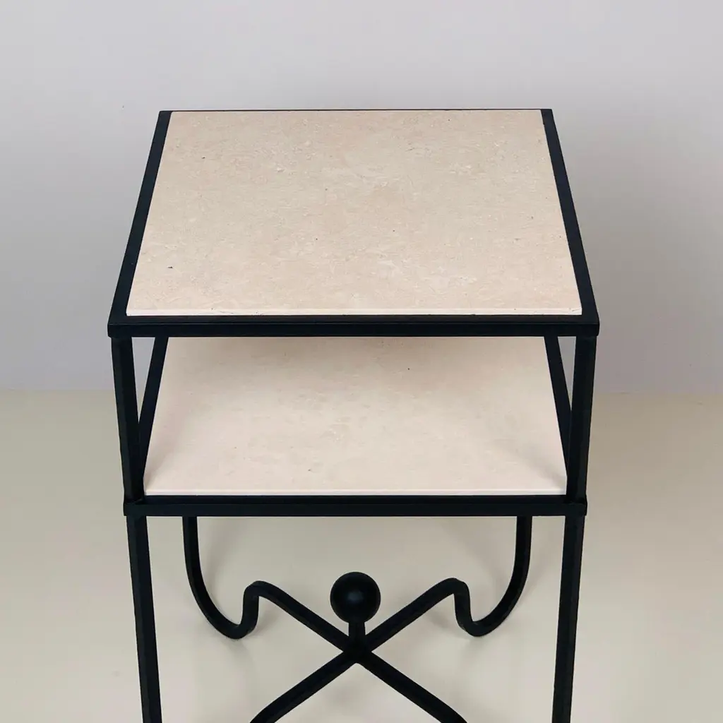 2-tier 'Entretoise' side table by Design Frères. Wrought iron base with 2 thin travertine shelves. Shelves are removable for secure shipping and cleaning.