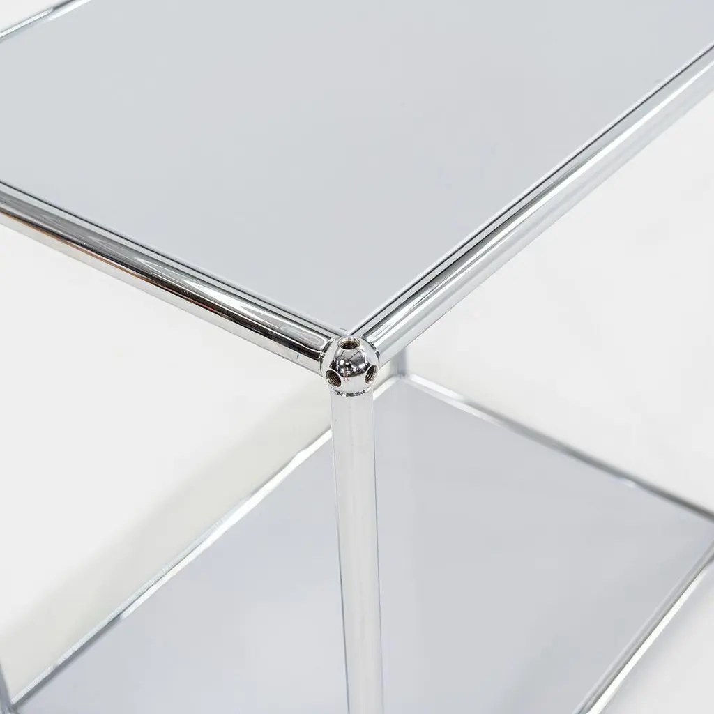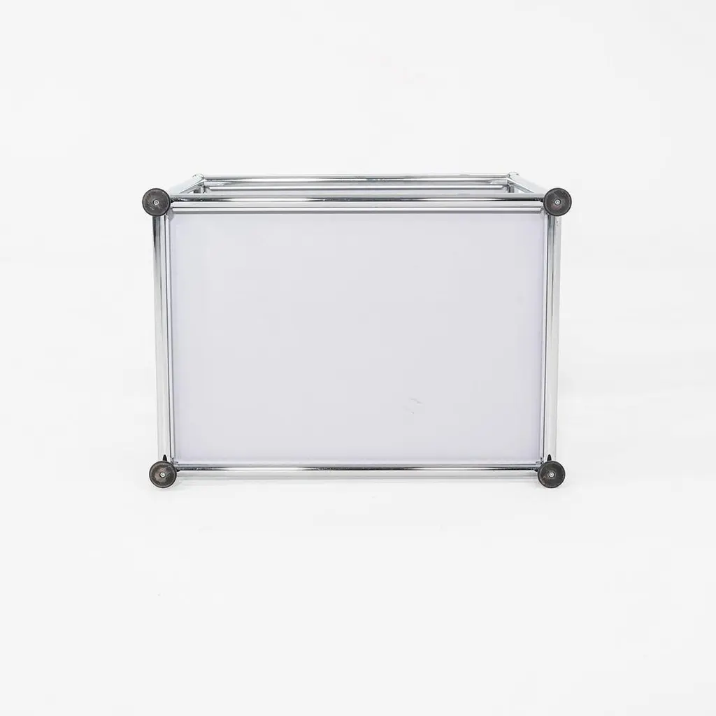 This is a USM Haller Side Table, originally designed by Fritz Haller and Paul Schaerer in 1963. This particular example was produced in the 2010s. The table is comprised of matte silver powder coated steel panels and a chromed steel frame. The listed price includes one side table and there multiples available for purchase. This table measures 20.75 inches deep, 14.75 inches wide, and 21 inches high. Overall, this piece shows minor signs of wear and is in very good to excellent condition. Please see photos.
