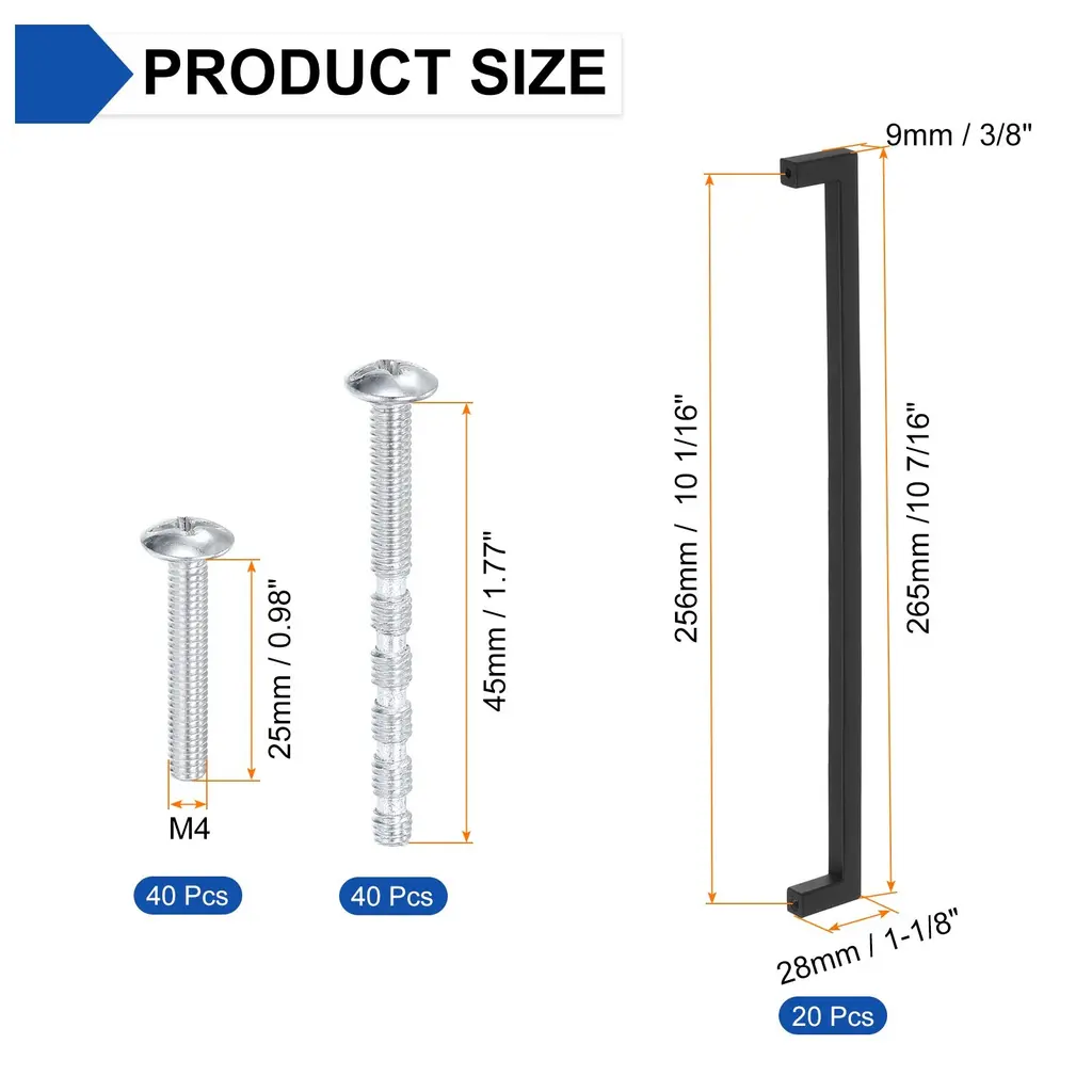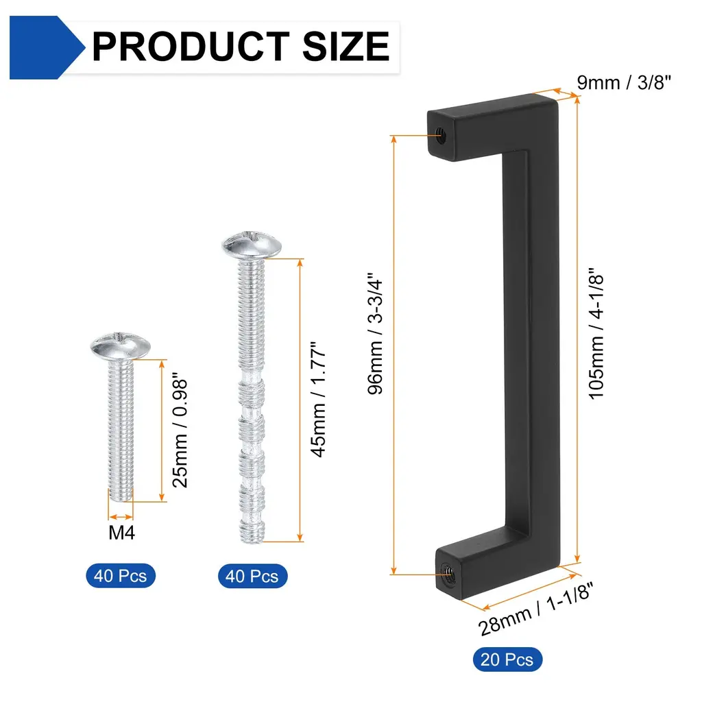 Description[Material] - Our drawer bar pulls are made of zinc alloy, they are solid tube structure, which is more robust, durable and corrosion-resistant, easy to use and has a long service life.[Slim Square Design] - The cabinets handle with a slim square appearance, its simple and modern design is suited for farmhouse, vintage, traditional and transitional styles. These handles will give your cabinets a clean and tidy look, easily enhancing the elegance of your cabinets doors and drawers.[Deep Hole Thread Design] - These square cabinets pulls have a thick solid base, which is not easy to break and deform. The deep threads allow the screws to bite more tightly, making the handle and the cabinets door heel fit together and not easy to fall off, making it easy to pull out the drawer.[Wide Application] - The Kitchen Cabinets Handles are great furniture hardware accessories, suitable for different styles of furniture and rooms. Such as kitchen cabinets, drawers, cupboards, wardrobes, bedside tables, etc.SpecificationMaterial: Zinc AlloyScrew-hole Center: 3 3/4 inch(96mm)Overall Length: 4 1/8 inch(105mm)Width: 3/8 inch(9mm)Height: 1 1/8 inch(28mm)Hole Thread Specifications: M4Color: BlackPackage Includes20pcs x Square Drawer Handles40pcs x 25mm Screws40pcs x 45mm Screws