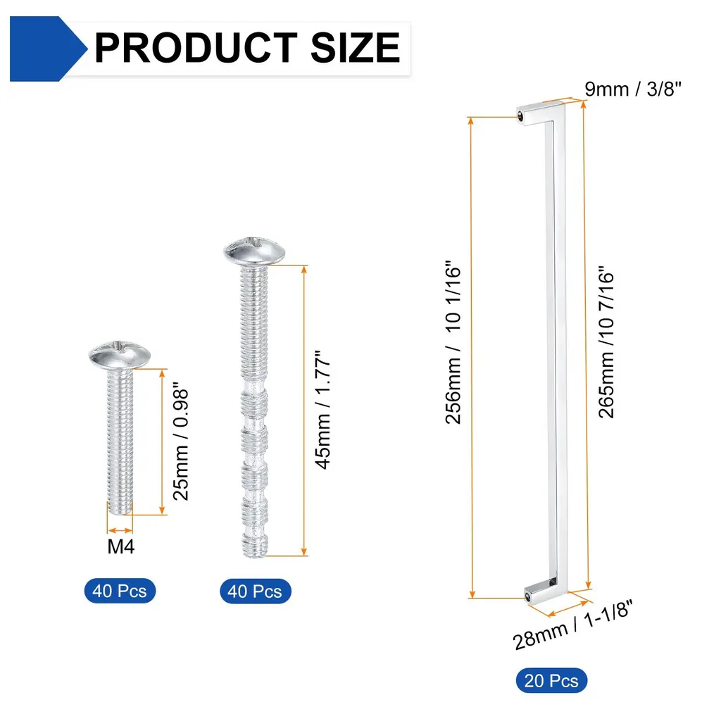 Description[Material] - Our drawer bar pulls are made of zinc alloy, they are solid tube structure, which is more robust, durable and corrosion-resistant, easy to use and has a long service life.[Slim Square Design] - The cabinets handle with a slim square appearance, its simple and modern design is suited for farmhouse, vintage, traditional and transitional styles. These handles will give your cabinets a clean and tidy look, easily enhancing the elegance of your cabinets doors and drawers.[Deep Hole Thread Design] - These square cabinets pulls have a thick solid base, which is not easy to break and deform. The deep threads allow the screws to bite more tightly, making the handle and the cabinets door heel fit together and not easy to fall off, making it easy to pull out the drawer.[Wide Application] - The Kitchen Cabinets Handles are great furniture hardware accessories, suitable for different styles of furniture and rooms. Such as kitchen cabinets, drawers, cupboards, wardrobes, bedside tables, etc.SpecificationMaterial: Zinc AlloyScrew-hole Center: 3 3/4 inch(96mm)Overall Length: 4 1/8 inch(105mm)Width: 3/8 inch(9mm)Height: 1 1/8 inch(28mm)Hole Thread Specifications: M4Color: BlackPackage Includes20pcs x Square Drawer Handles40pcs x 25mm Screws40pcs x 45mm Screws