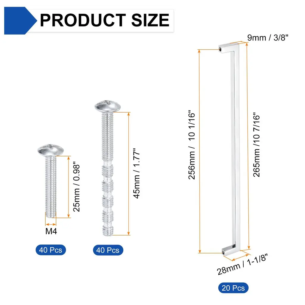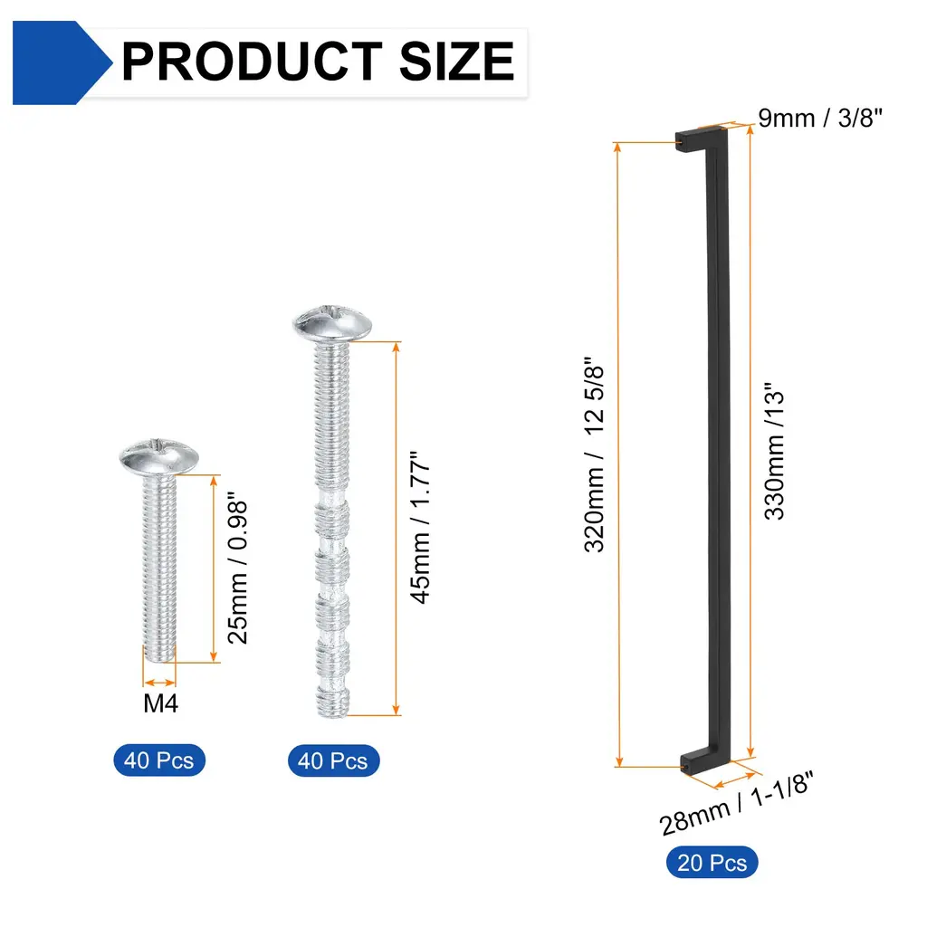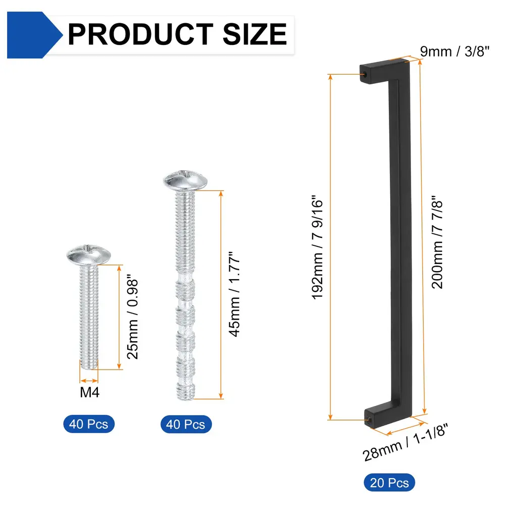 Description[Material] - Our drawer bar pulls are made of zinc alloy, they are solid tube structure, which is more robust, durable and corrosion-resistant, easy to use and has a long service life.[Slim Square Design] - The cabinets handle with a slim square appearance, its simple and modern design is suited for farmhouse, vintage, traditional and transitional styles. These handles will give your cabinets a clean and tidy look, easily enhancing the elegance of your cabinets doors and drawers.[Deep Hole Thread Design] - These square cabinets pulls have a thick solid base, which is not easy to break and deform. The deep threads allow the screws to bite more tightly, making the handle and the cabinets door heel fit together and not easy to fall off, making it easy to pull out the drawer.[Wide Application] - The Kitchen Cabinets Handles are great furniture hardware accessories, suitable for different styles of furniture and rooms. Such as kitchen cabinets, drawers, cupboards, wardrobes, bedside tables, etc.SpecificationMaterial: Zinc AlloyScrew-hole Center: 3 3/4 inch(96mm)Overall Length: 4 1/8 inch(105mm)Width: 3/8 inch(9mm)Height: 1 1/8 inch(28mm)Hole Thread Specifications: M4Color: BlackPackage Includes20pcs x Square Drawer Handles40pcs x 25mm Screws40pcs x 45mm Screws