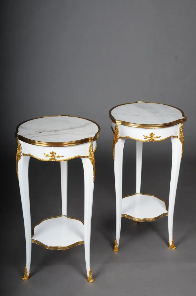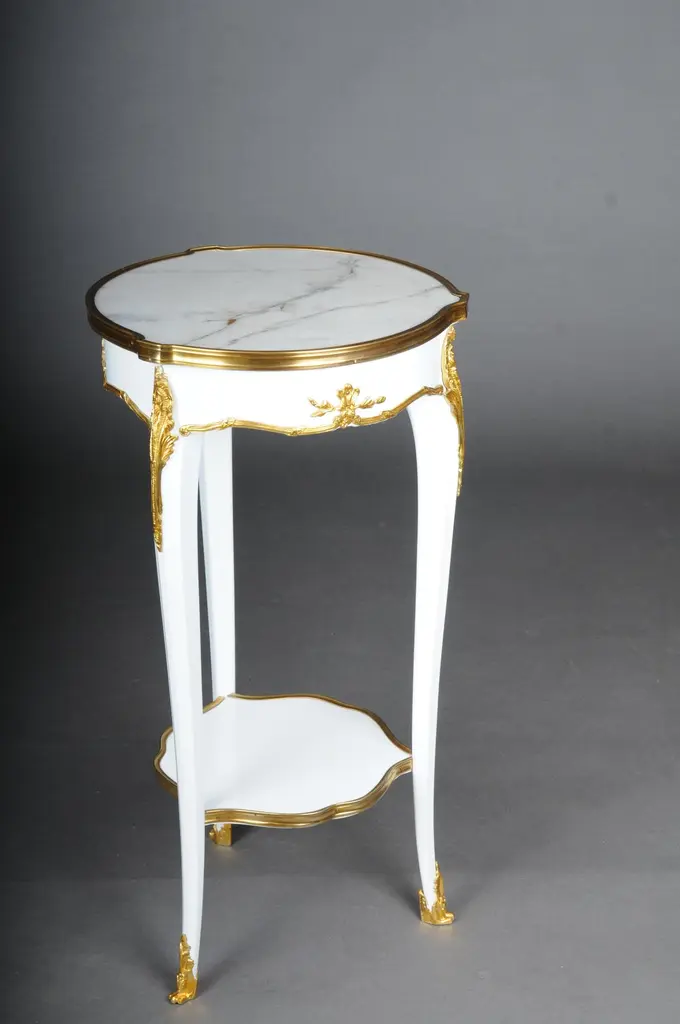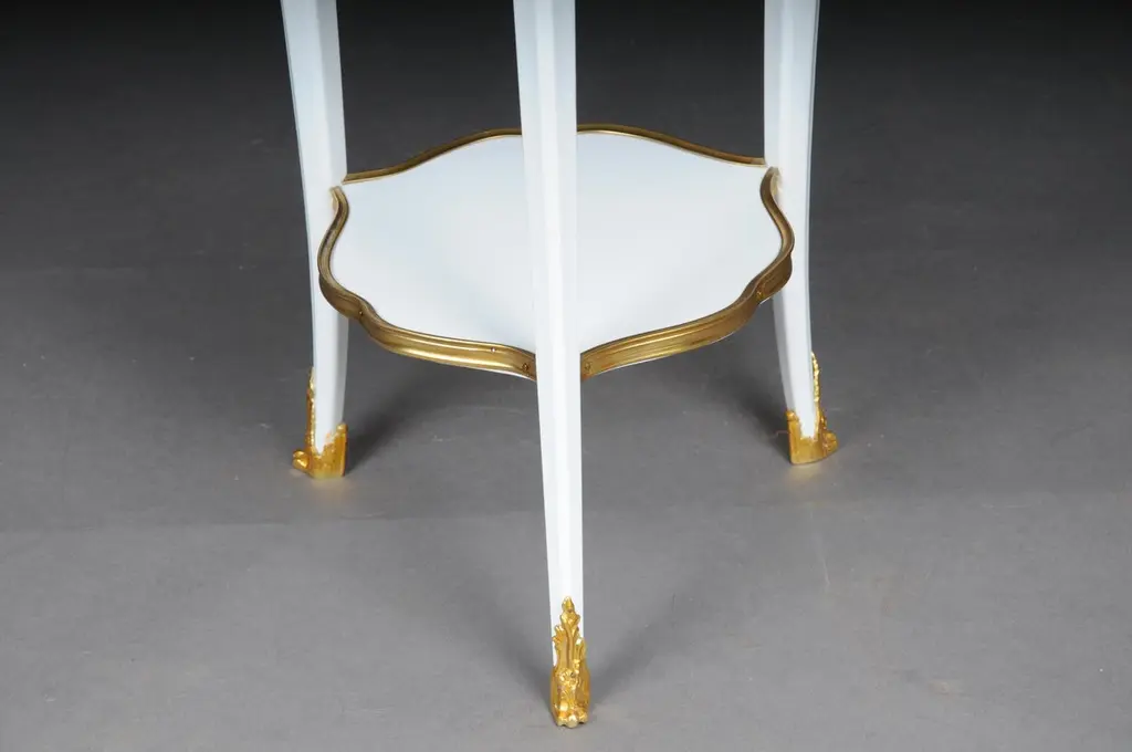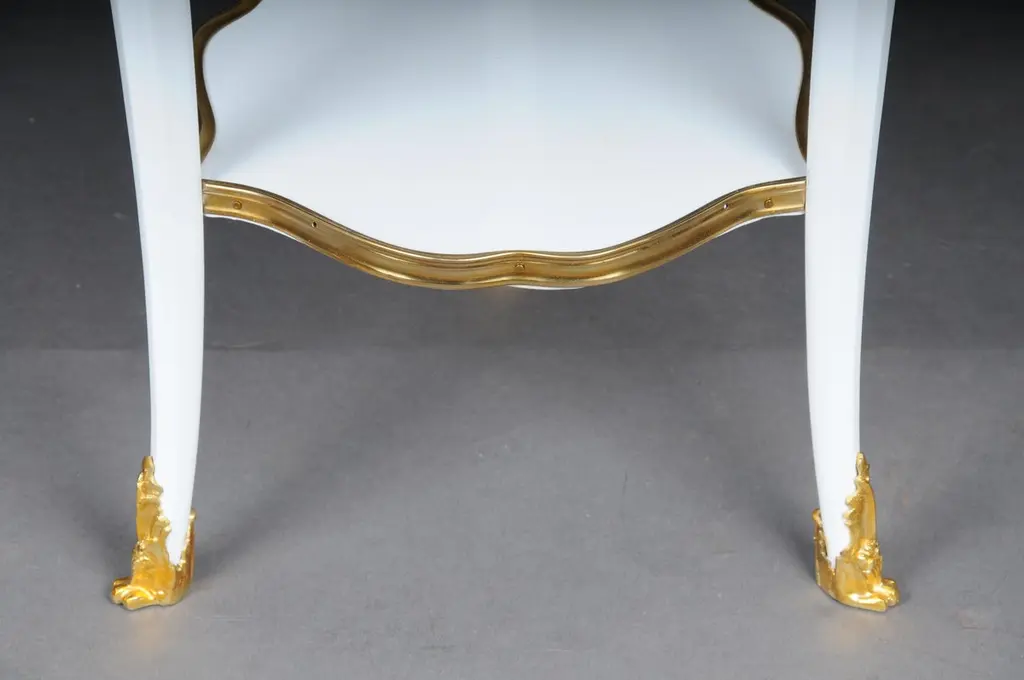 20th century French Salon Side Table in Louis XV after F. Linke, whiteSolid wood side table in Louis XV. Slightly convex and concave, carcass, flanked by solid corner glaciers on high, elegantly curved legs, connected below by a curly brass frame framed by an intermediate shelf, ending with bronze fittings in sabots.