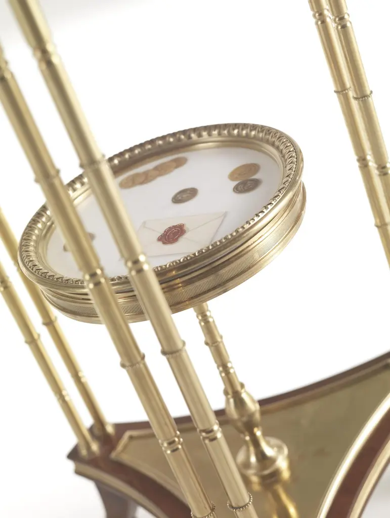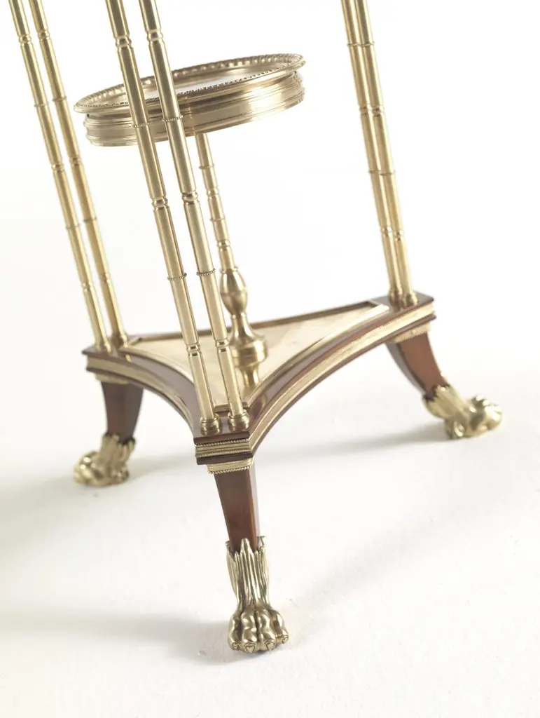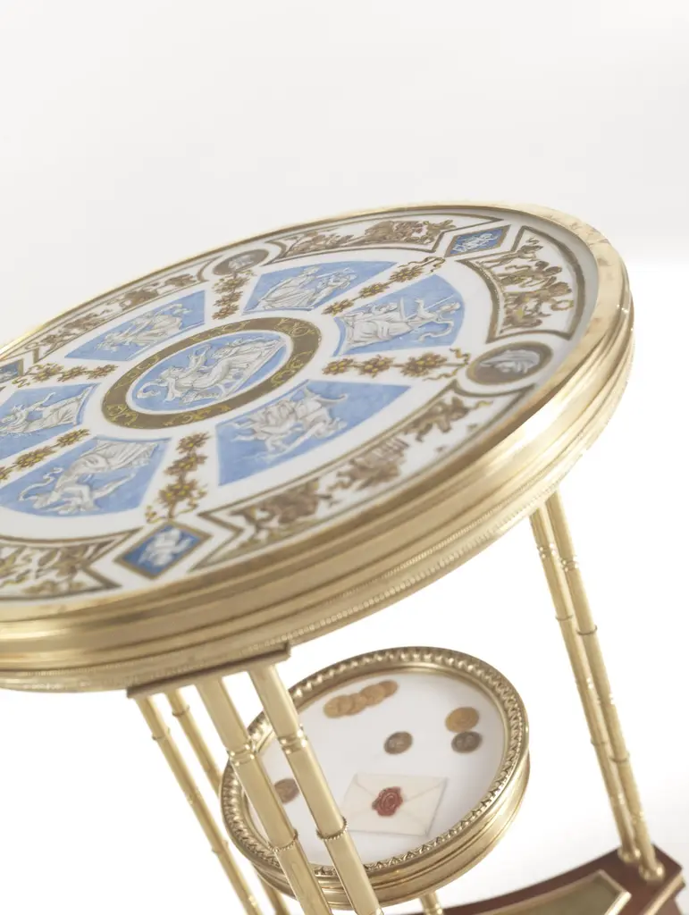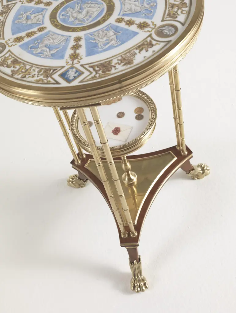Refined and precious, Antibes is a French-style coffee table characterized by an elaborate mahogany structure with decorative elements in cast brass and a hand-decorated marble top. The presence of an additional support surface adds a decorative and functional element.Antibes Side table with structure in mahogany. Lost-wax cast brass decorative elements. Top in white marble with hand-made decorations.