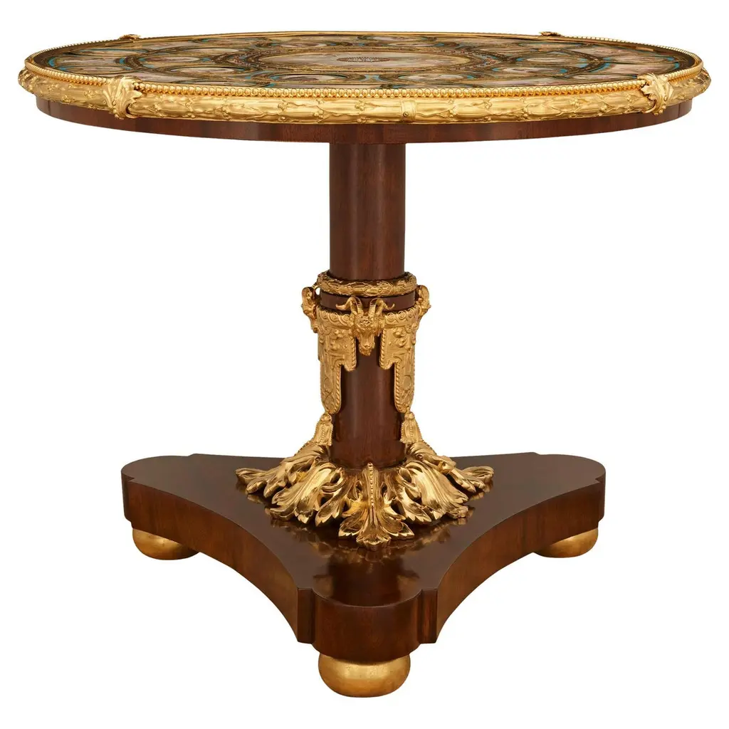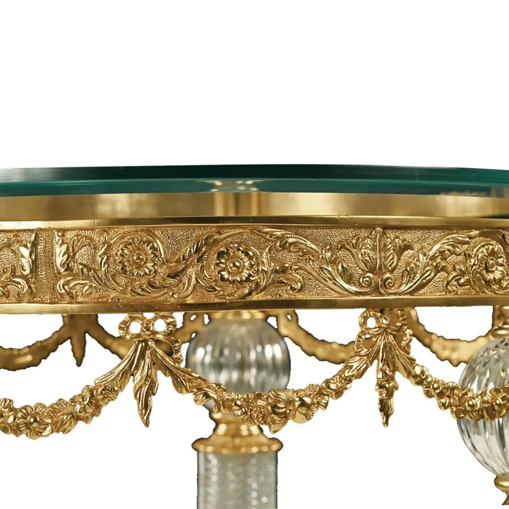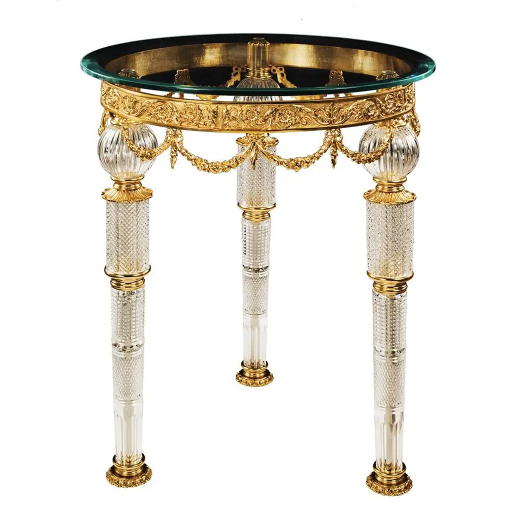 Clear crystal and French gold bronze side table with three legs and the temperated glass top. The parts in crystal are hand-carved. Each object is handcrafted and the care for every detail makes each item unique in its kind. The style of this side table is a modern reinterpretation of table from the second half of the 18th century in France. This items was made entirely in Italy. At the customer's request, this item can be customized, can be made in different metal finishing: french gold, patinated silver, burnished and dark burnished and the color of crystal.Also Oggetti d'Arte will follow with the same passion the request of the most qualified studies of interior architecture from around the world, helping them in achievement of their most ambitious projects.