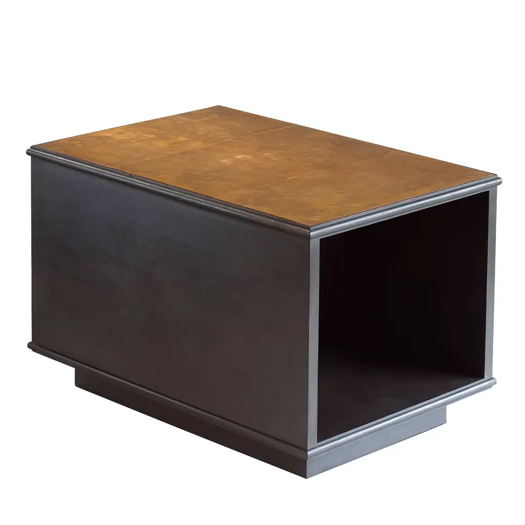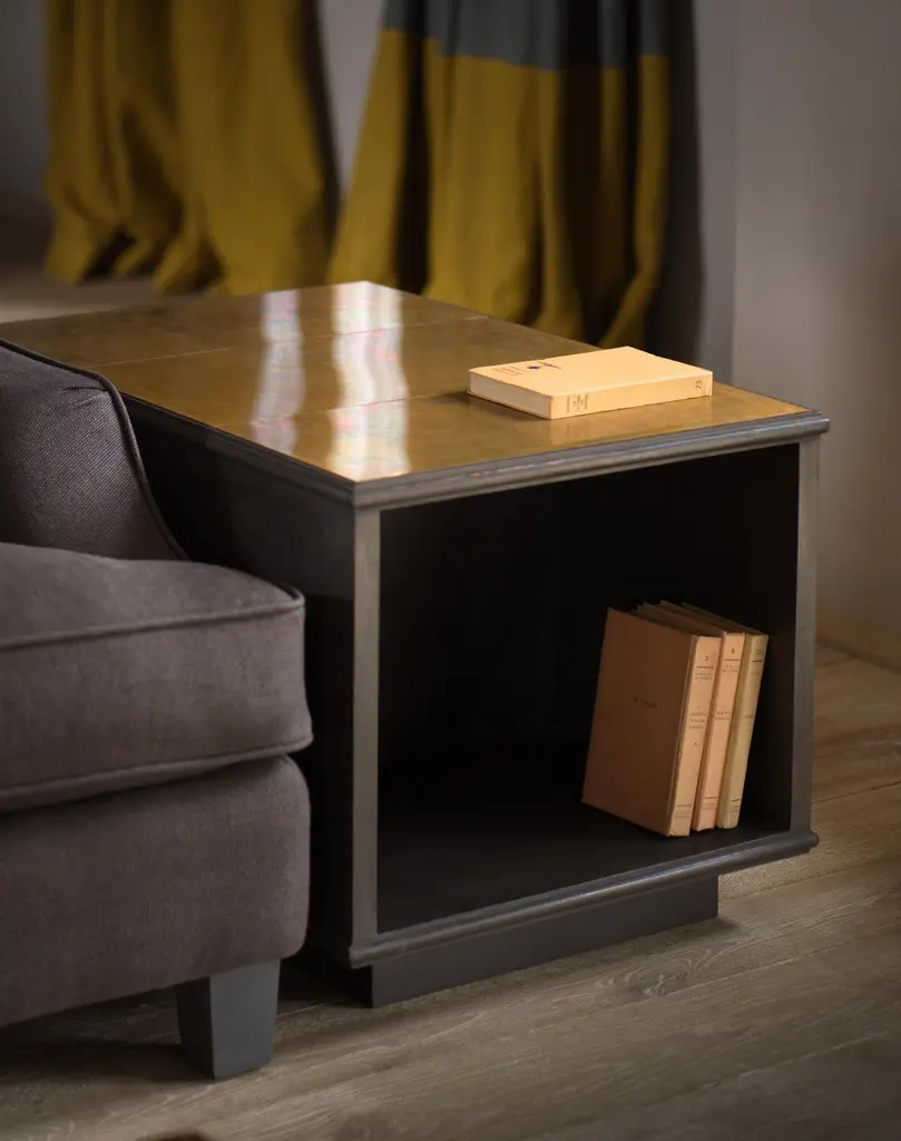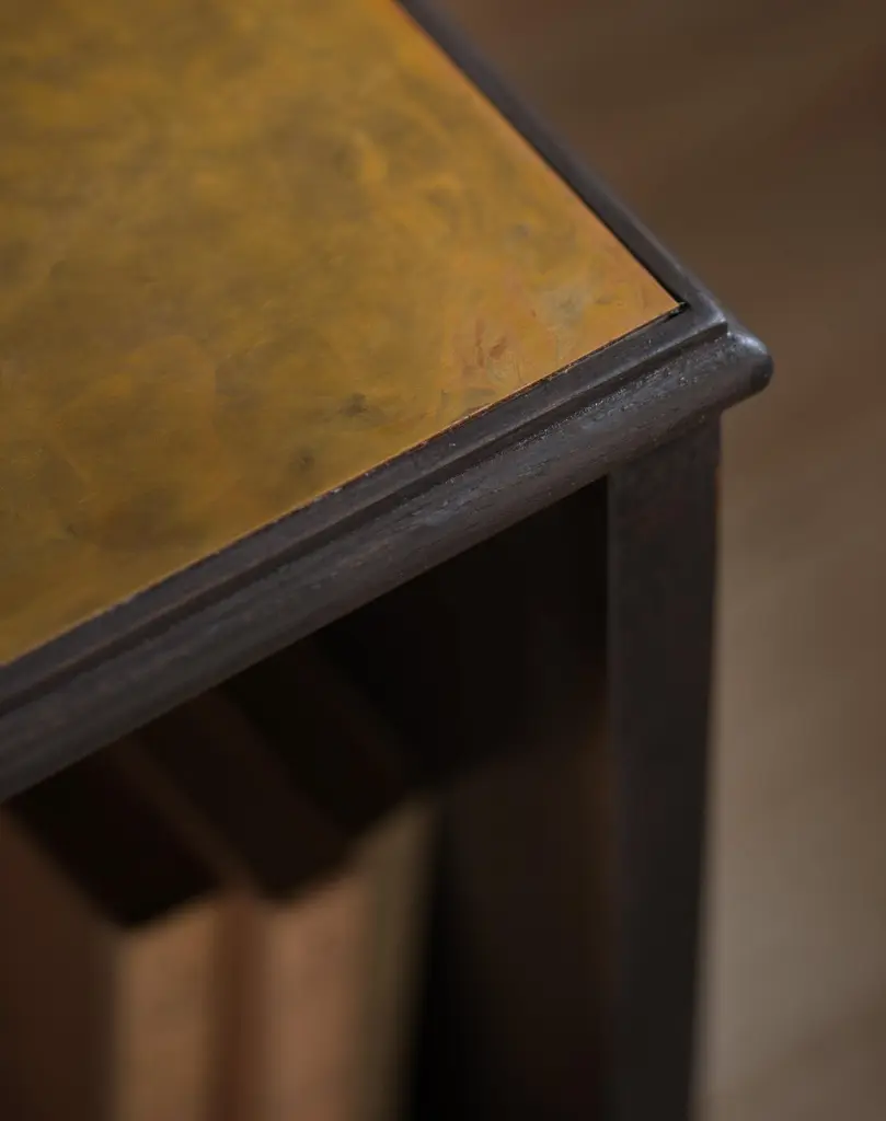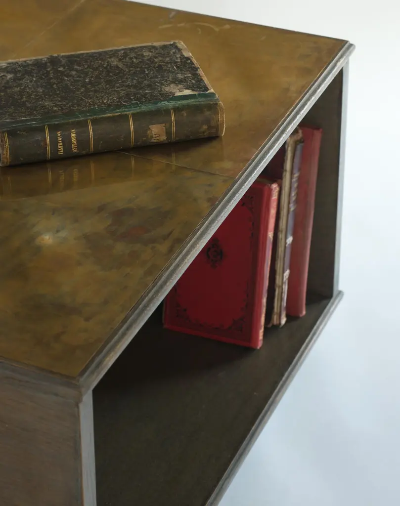 The modernist lamp table, an ebonized oak and patinated bronze mounted lamp table / bookcaseB.B. - lamp tables are always a bit of a nightmare. I find combining it with a bookcase often solves the problem. Constructed from solid oak, not a veneer.Specifications: oak construction with patinated bronze topMade to order and therefore made to measurement.
