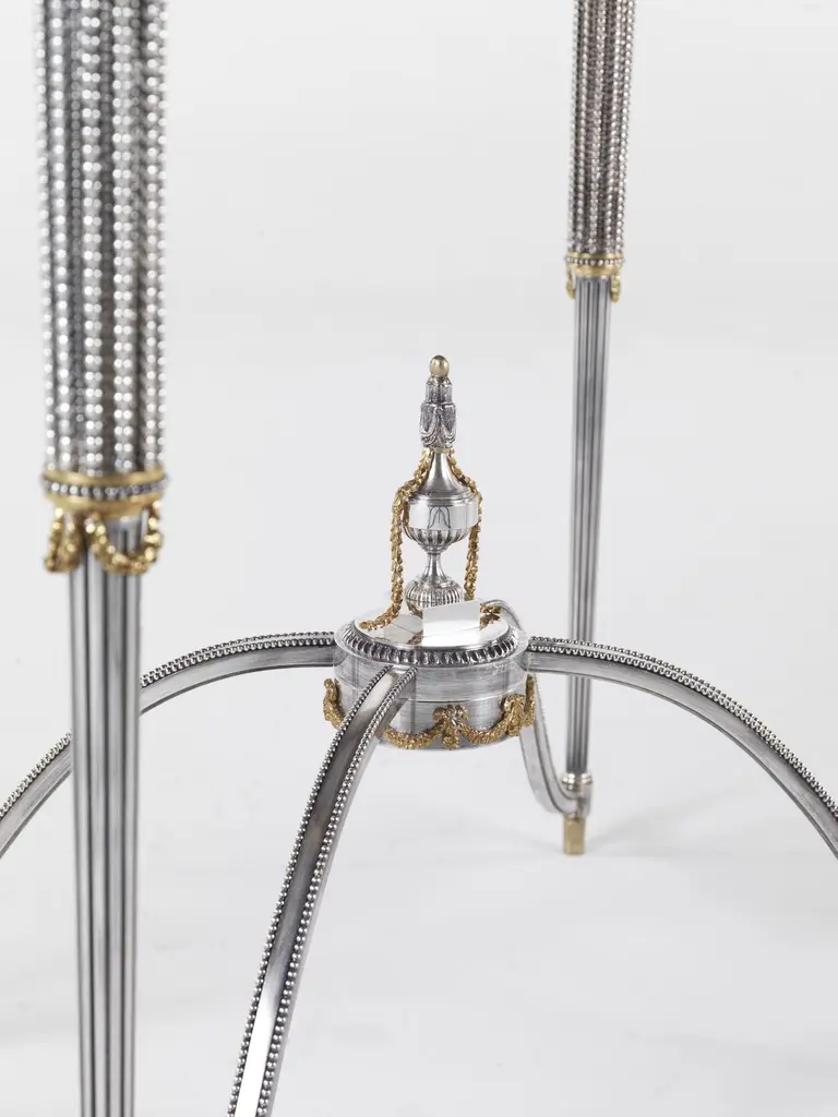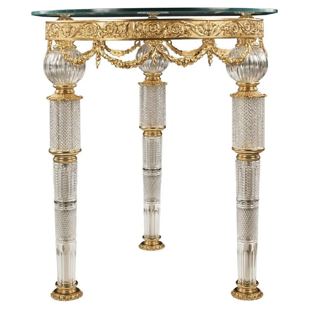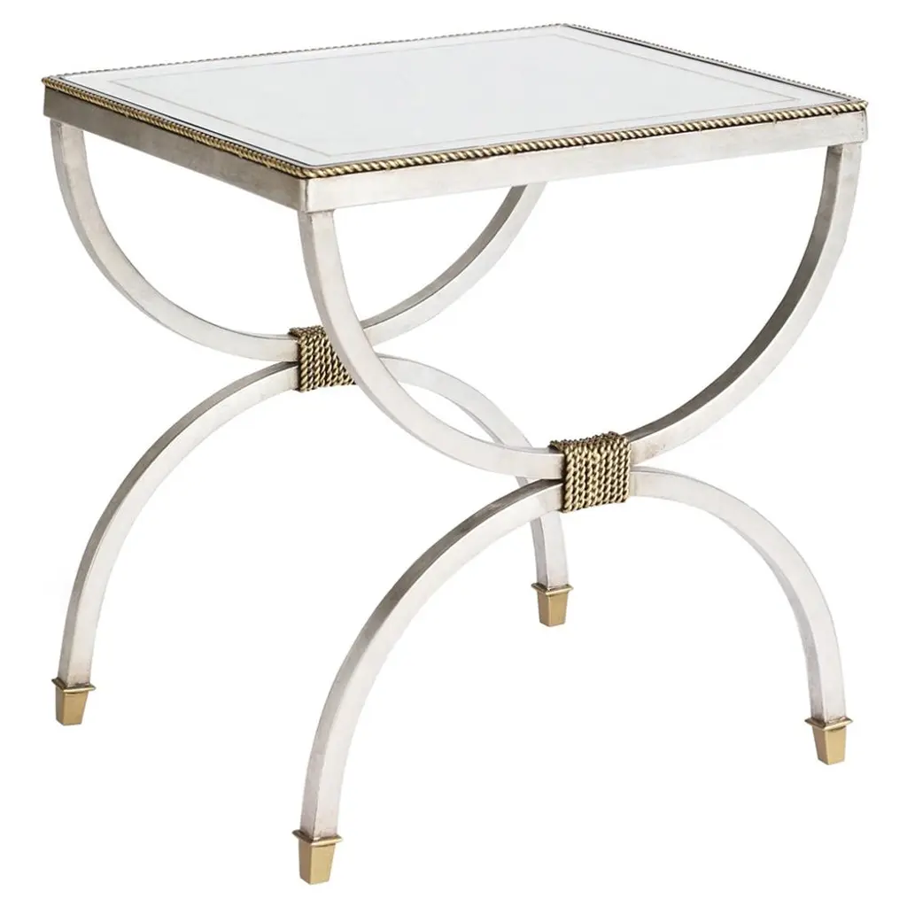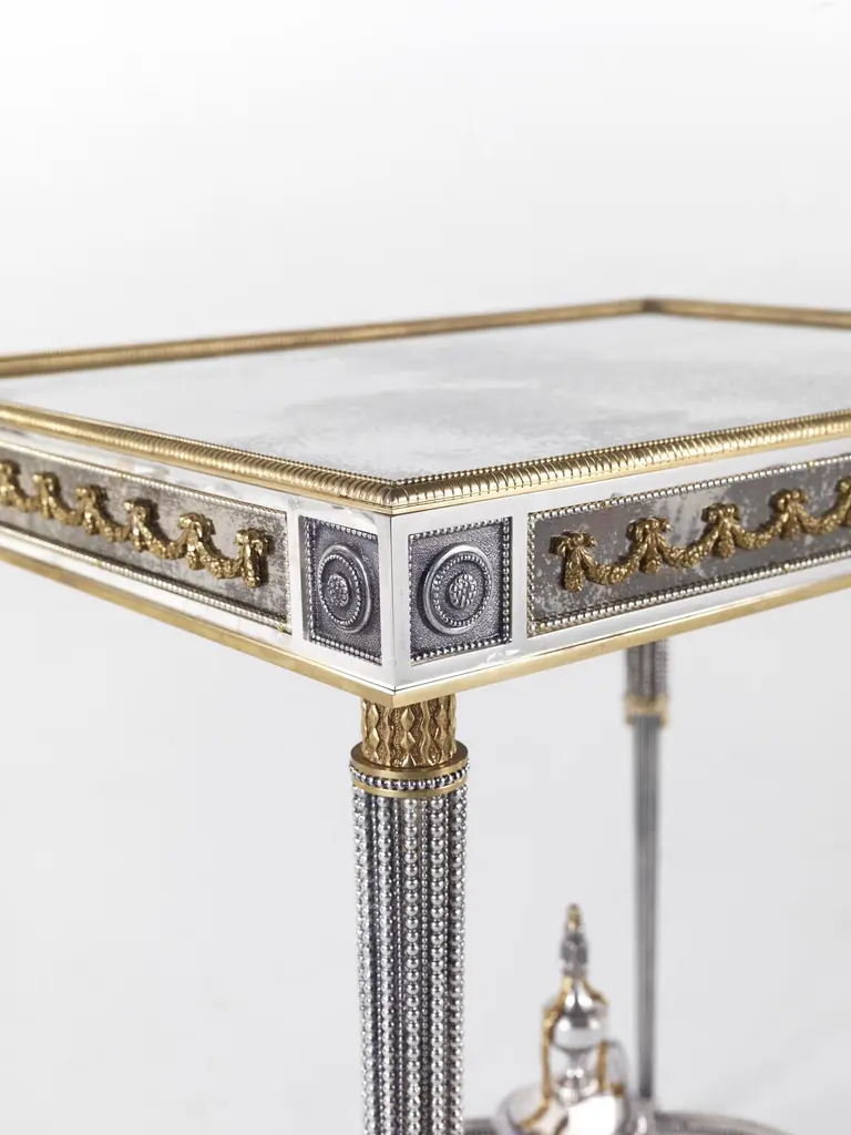 An elegant and luxurious baroque style for Eos coffee table. Characterized by a brass structure with decorative lost-wax cast elements finished in antiqued brass and silver, this coffee table is a precious piece of furniture, able to enhance settings with a timeless classic appeal.Eos side table with structure in brass. Lost-wax cast brass decorative elements finished in antique brass and silver. Top in brass finished in antique silver.