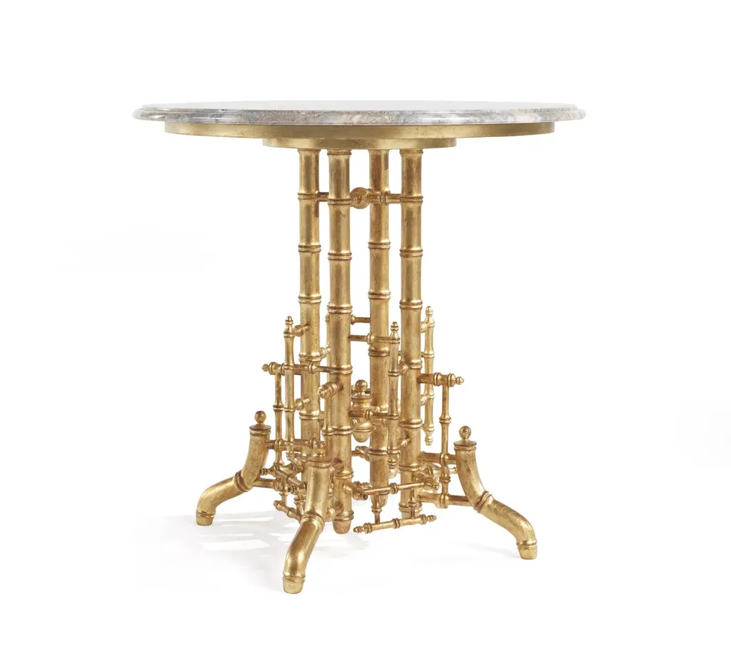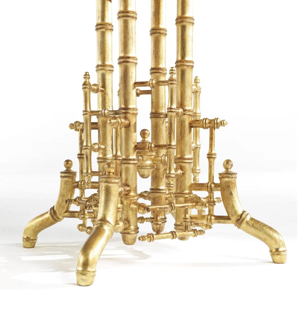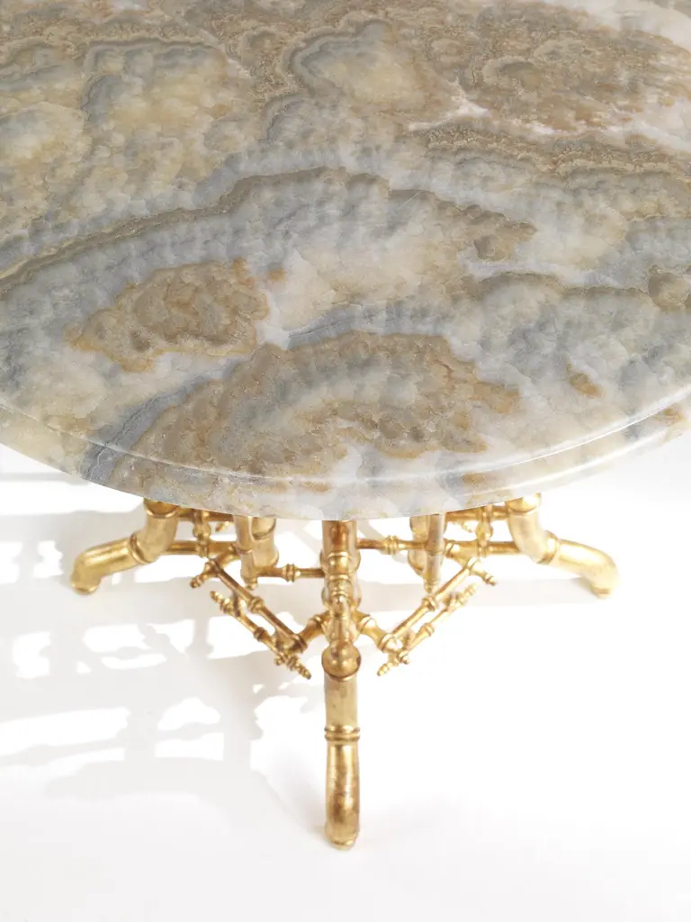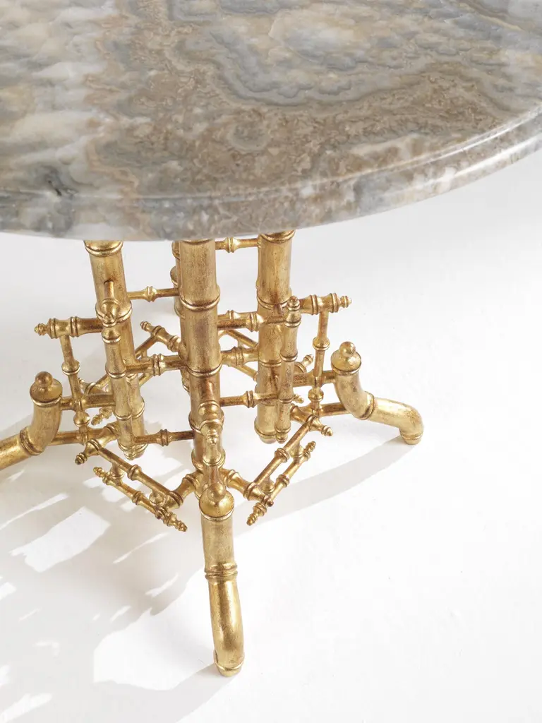 A precious base characterized by elaborate workmanship, with a golden finish and oriental-inspired decorative tips that recall bamboo, is the main feature of the Hiroko line. An elegant and refined collection: the perfect complement for an environment with a timeless classic style.Hiroko side table with structure in solid beechwood finished in antique gold with patina J291O. Top in Cloudy Onyx.