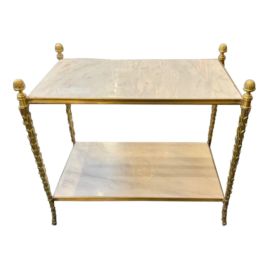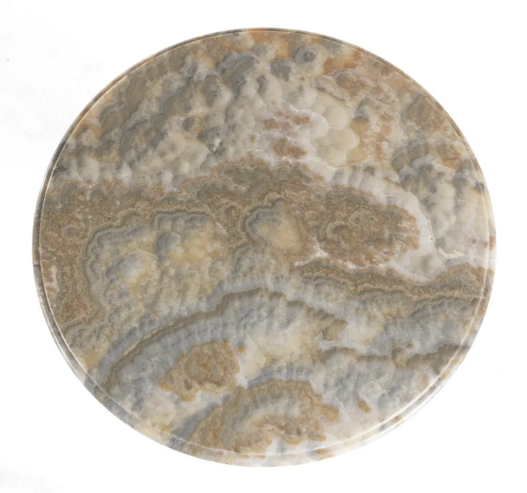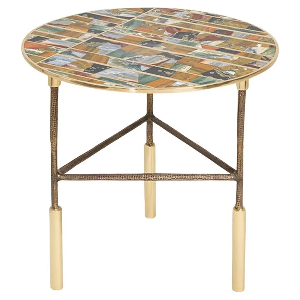 A precious base characterized by elaborate workmanship, with a golden finish and oriental-inspired decorative tips that recall bamboo, is the main feature of the Hiroko line. An elegant and refined collection: the perfect complement for an environment with a timeless classic style.Hiroko side table with structure in solid beechwood finished in antique gold with patina J291O. Top in Cloudy Onyx.