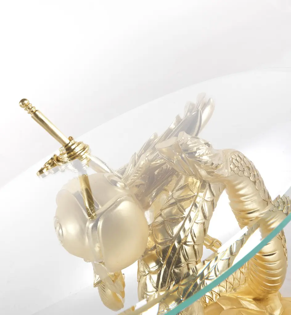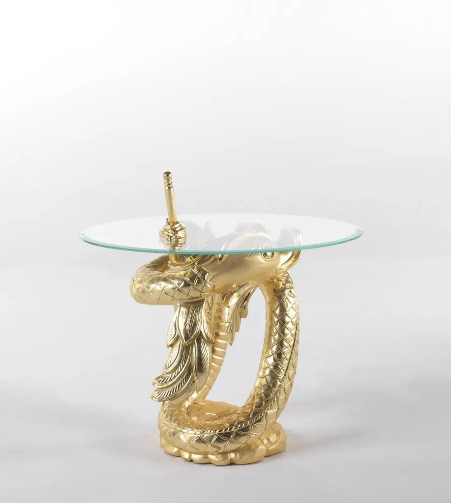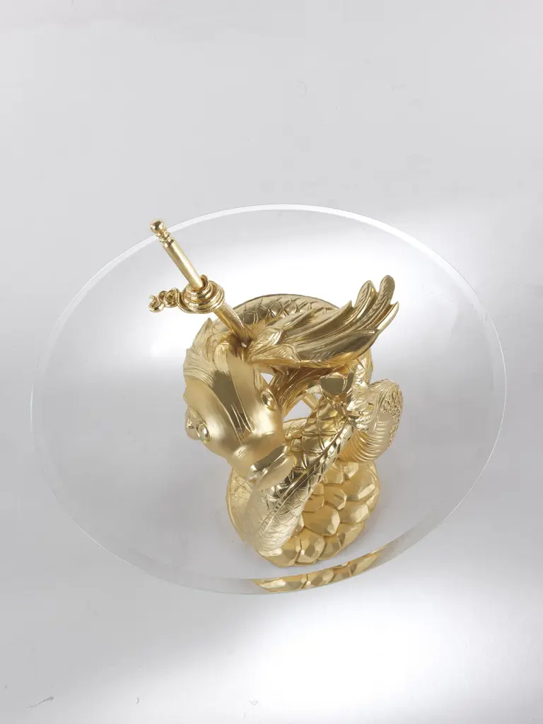 Between mythology and classicism, Idra coffee table is characterized by a masterfully hand-carved base that depicts the infamous legendary creature. The marble top lightens the creation, lending the piece a sophisticated and luxurious elegance.Idra Side table with structure in hand-carved beechwood finished in glossy and matte gold J2870. Top in clear glass.