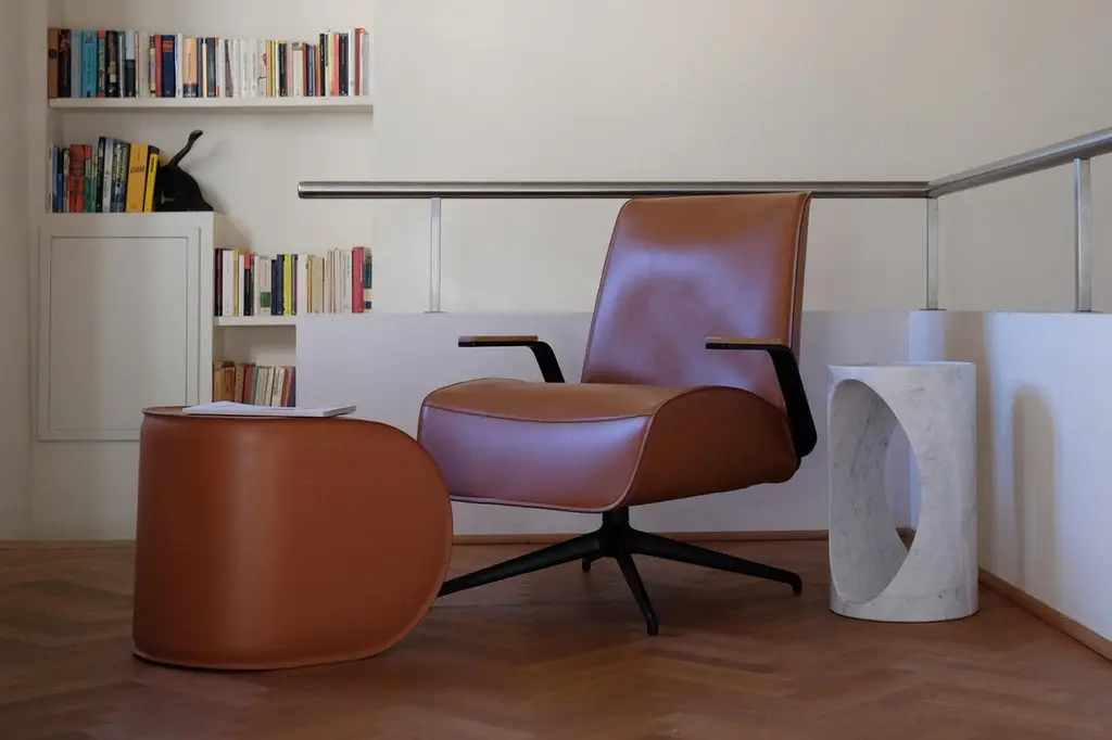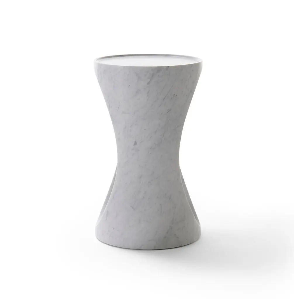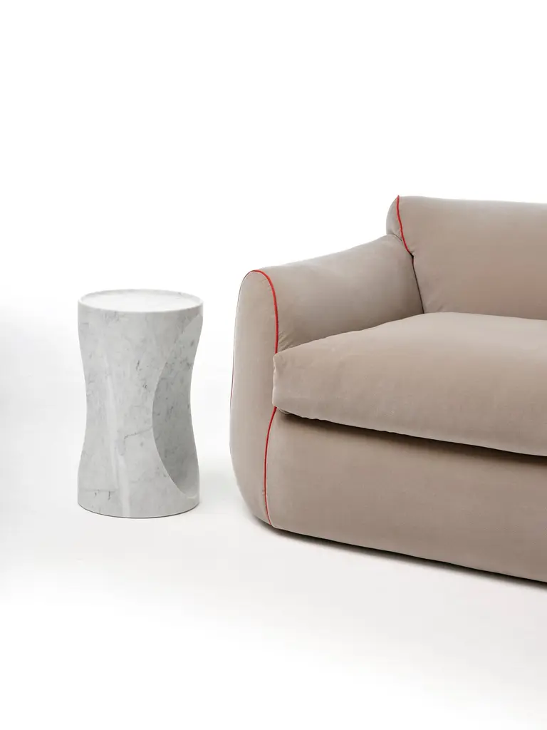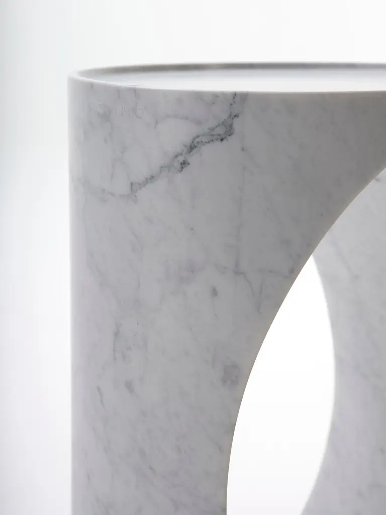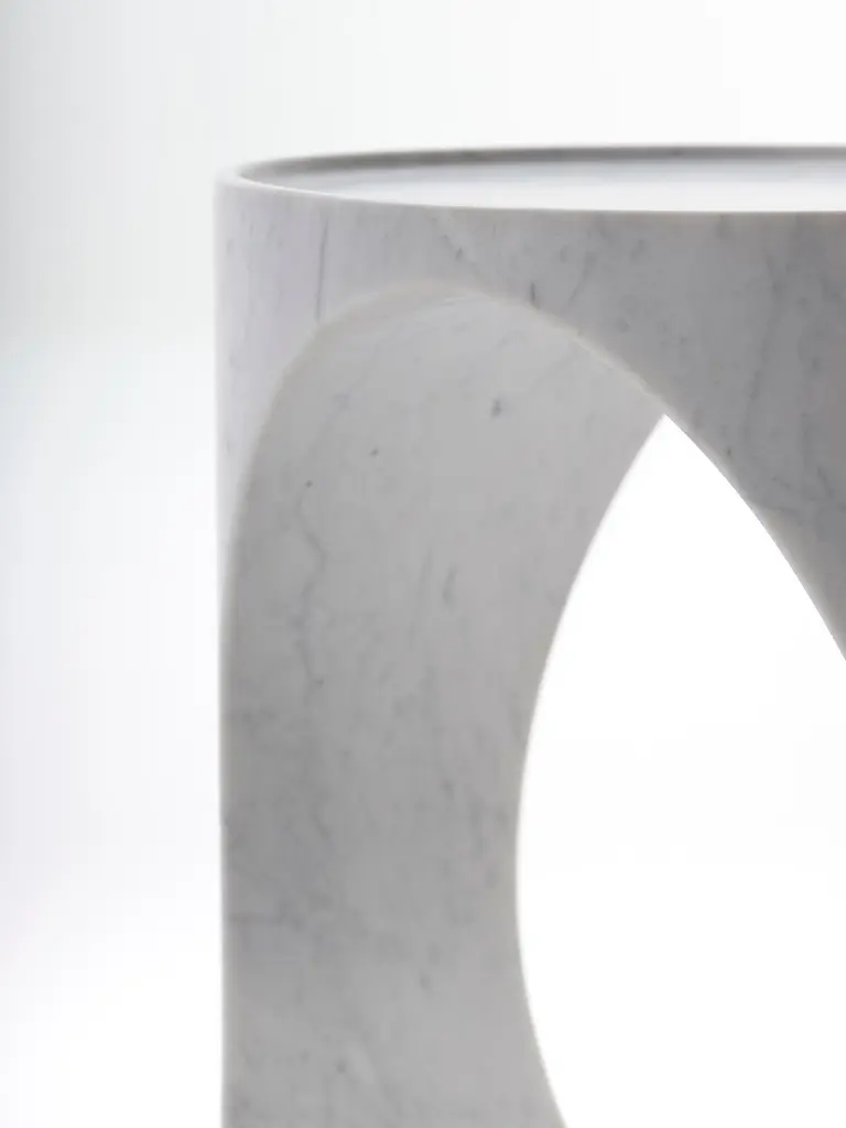 Our Roll side table is obtained from the “waste” material that is generated in the manufacturing process of our larger dining table: when we produce it we core out the base by extracting two identical cylinders: with these we produce as many Roll side tables. They are in fact identical scaled-down copies of the dining table but instead of supporting a glass-top they feature a carved lip on the top surface to safely prevent objects from falling or sliding off.New Saint Laurent or Carrara marble. Other stones are available upon request.