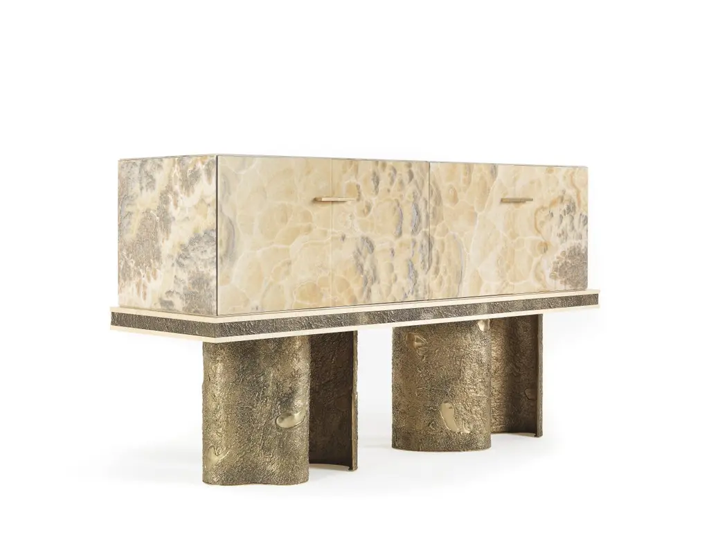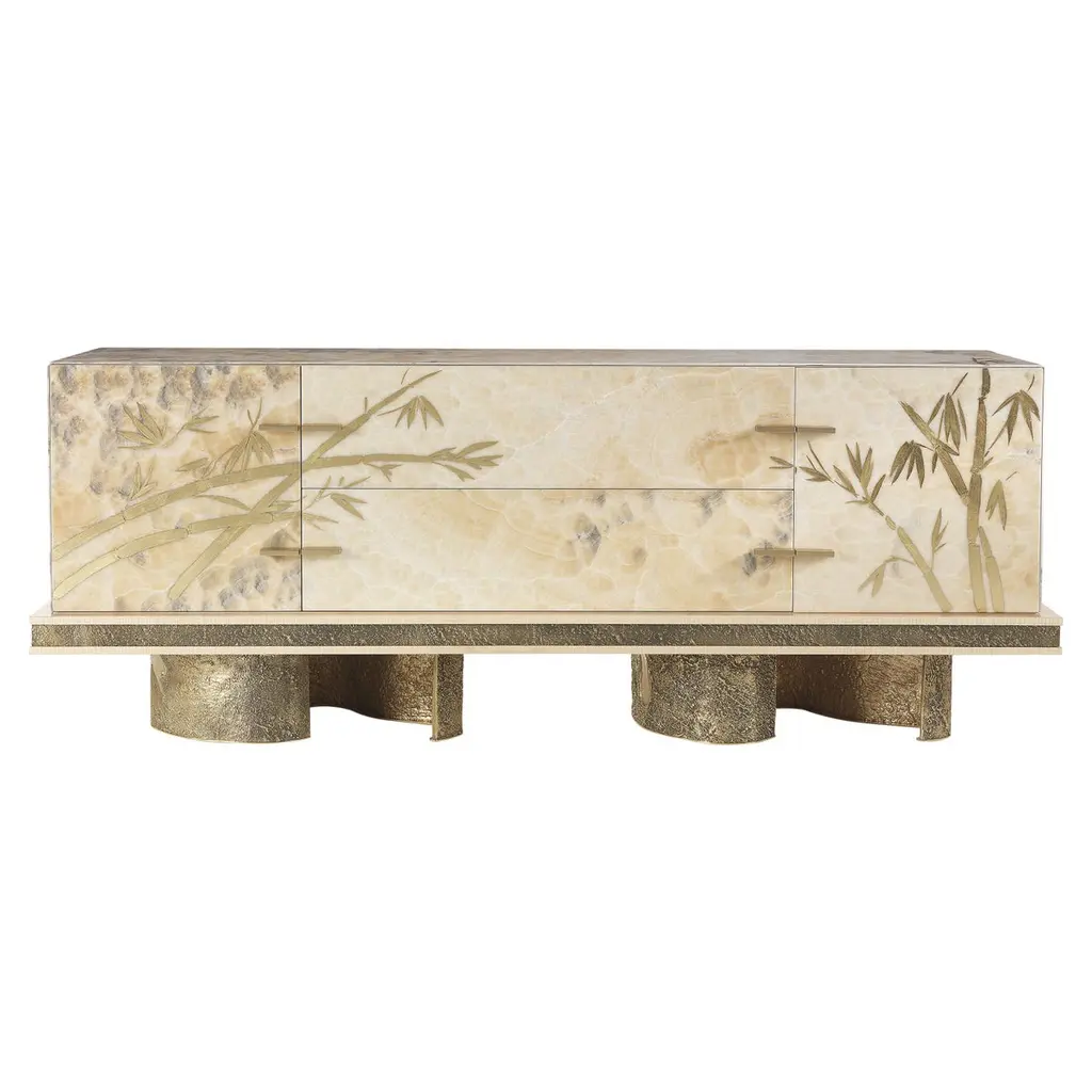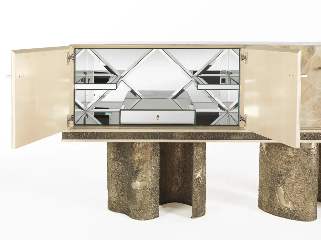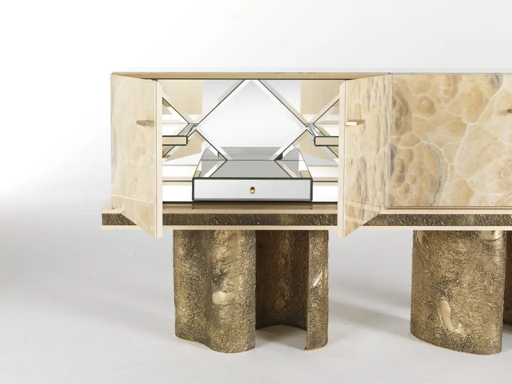 The exotic fascinations and the Zen mood express their full potential in the Shinto line, in which the influence of the Japanese animist spirituality is expressed in tables, sideboards and consoles with sculptural forms, in which the rough base in brass casting with antique bronze finish contrasts with the shine of the upper component in cloudy onyx, created thanks to an innovative technique in the processing of the marble and enriched by refined decoration in gold leaf linked to the theme of bamboo.Shinto bar cabinet with structure in maple, covered in Cloudy Onyx with gold leaf decorations. Interior covered in mirror, with shelves and one drawer. Inserts in cast brass. Sculptural bases in lost-wax cast brass with antique bronze finishing.
