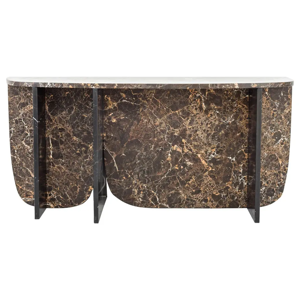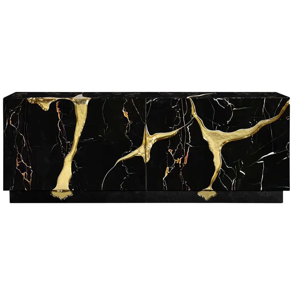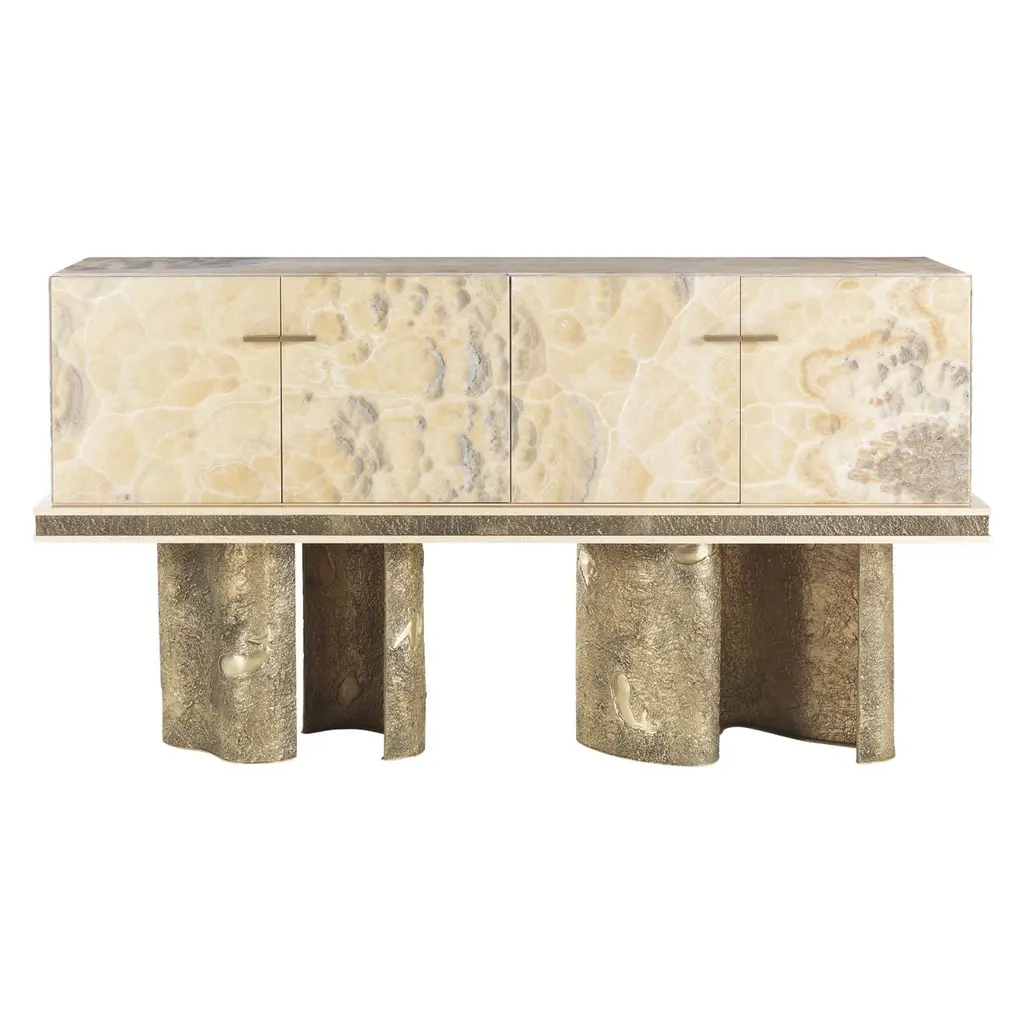The exotic fascinations and the Zen mood express their full potential in the Shinto line, in which the influence of the Japanese animist spirituality is expressed in tables, sideboards and consoles with sculptural forms, in which the rough base in brass casting with antique bronze finish contrasts with the shine of the upper component in cloudy onyx, created thanks to an innovative technique in the processing of the marble and enriched by refined decoration in gold leaf linked to the theme of bamboo.Shinto bar cabinet with structure in maple, covered in Cloudy Onyx with gold leaf decorations. Interior covered in mirror, with shelves and one drawer. Inserts in cast brass. Sculptural bases in lost-wax cast brass with antique bronze finishing.