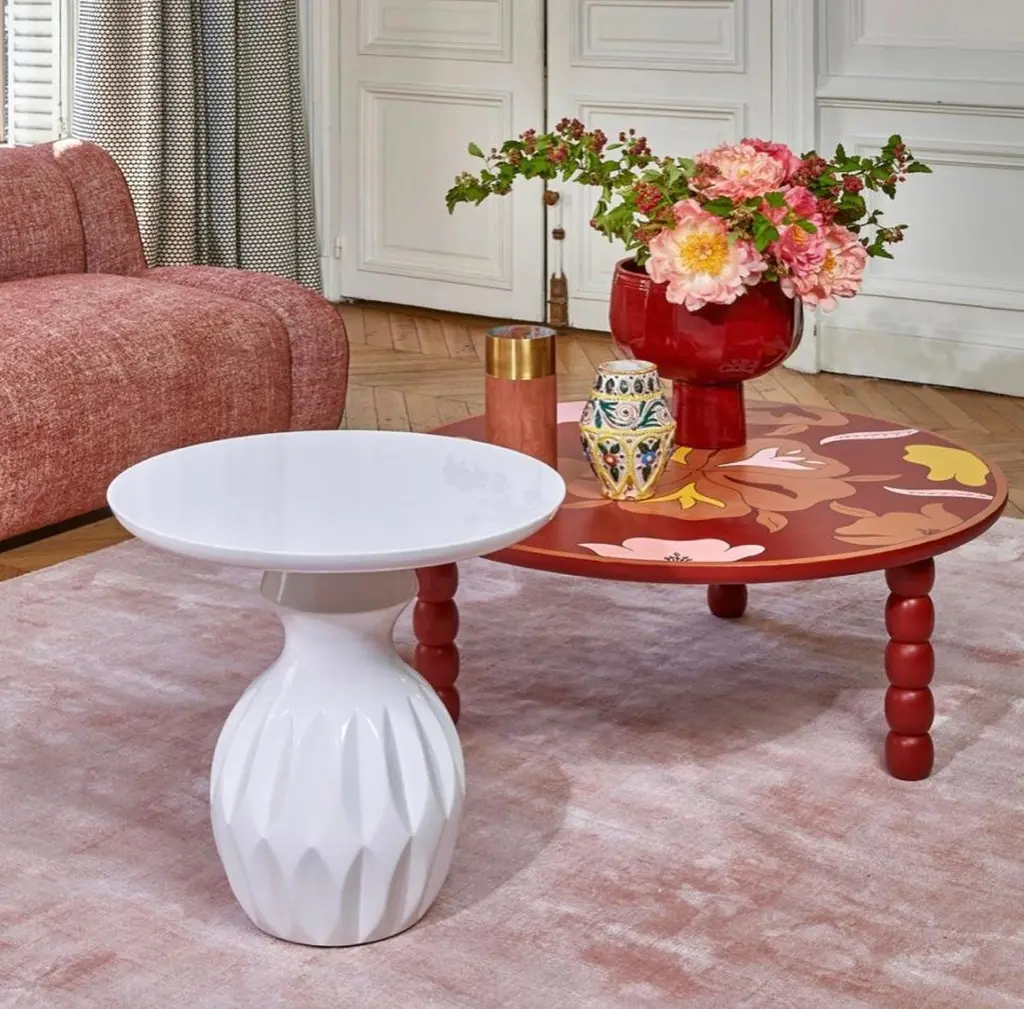 The Talia is a table inspired by antique cut crystal glass. Its name is evocative of elegance and refinement, which is definitely reflected in the product itself. It sits in your living space like a jewel, adding a touch that is colourful or unusual, but always elegant. It is complete with exquisite facets that show off its shiny lacquer.Glossy lacquer, available in green, pink, white, yellow, terracotta. We recommend daily cleaning with a soft, damp cloth. Do not use abrasive, caustic cleaners or cleaning agents, as they may affect the varnish and colour.Measures: Diameter : 52 cmHeight : 50 cm.