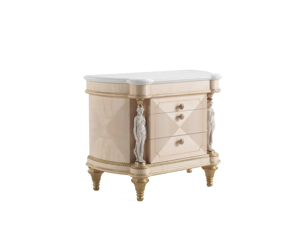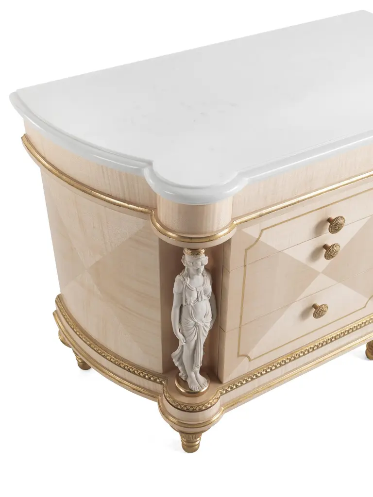 Toulouse night table with structure in multilayer maple. Three drawers. Profile and details are finished in antique gold with patina JG294. Decorative elements in metal are finished in gold. Statues with biscuit finishing as columns. Top in multilayer maple with white Statuario marble insert.