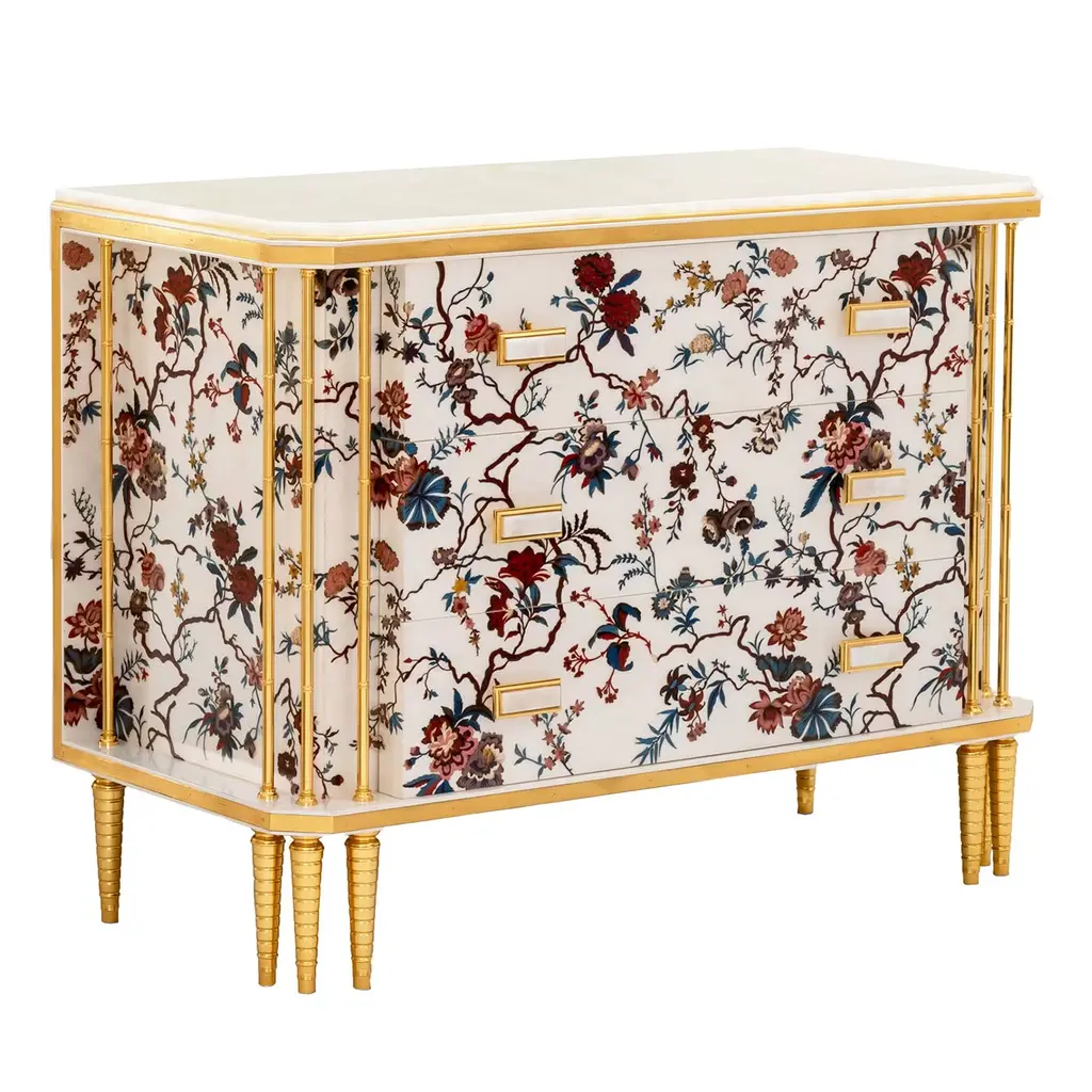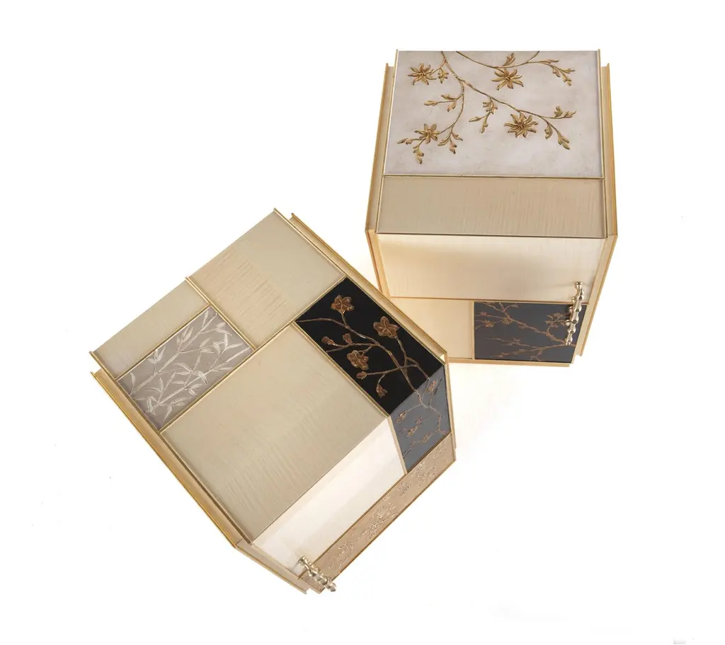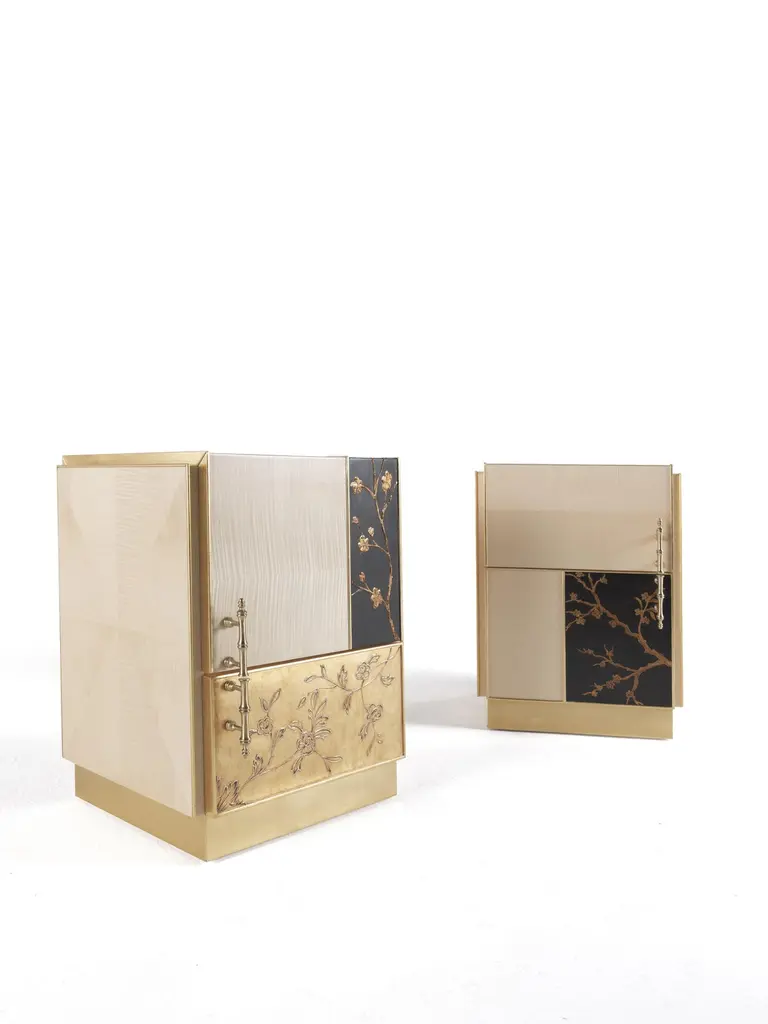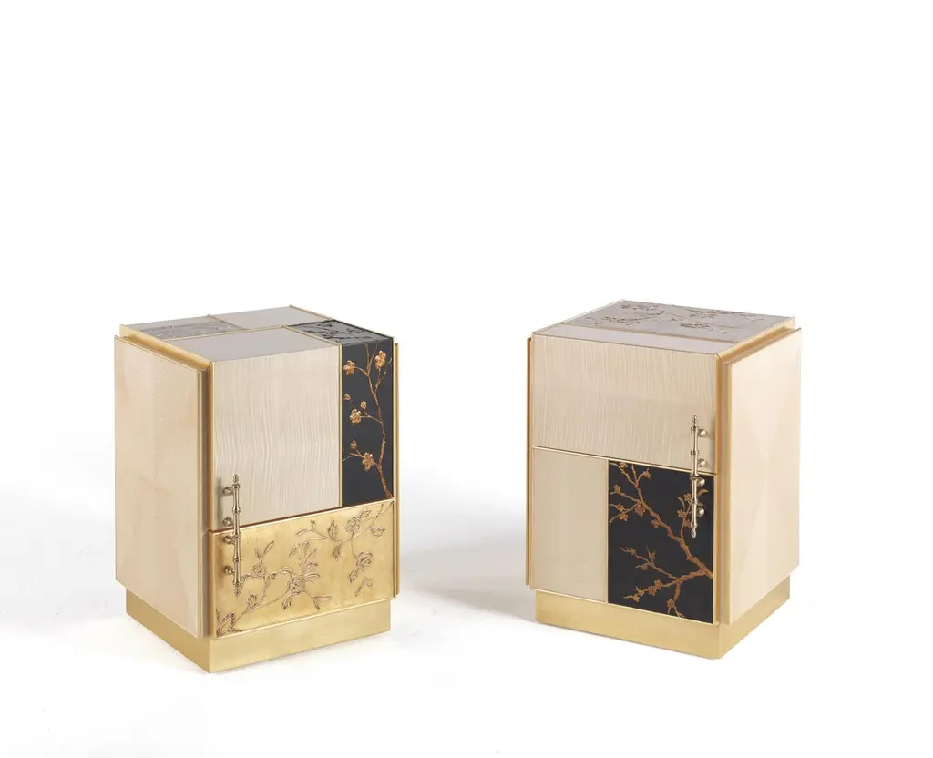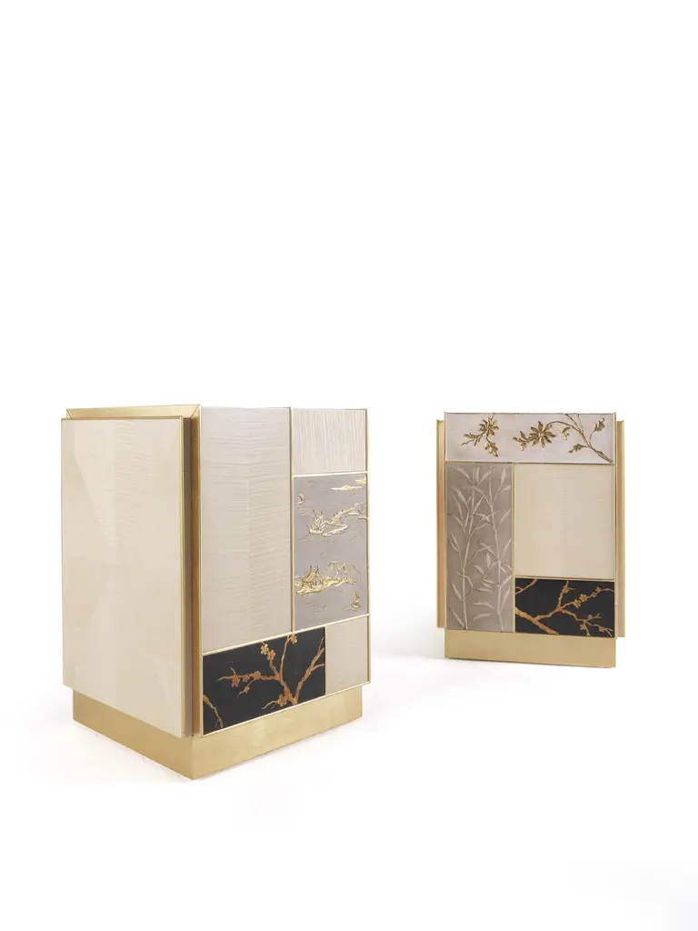"Ukiyo” is an evocative name recalling the “images from the floating world” of the famous traditional Japanese prints. The furniture line includes sideboard, central and side table and is characterized by a peculiar composition that alternates elements veneered in frisé maple with tiles decorated using gypsum as a support, in relief or engraved, and subsequent chromatic decoration, as in the famous traditional Chinese lacquers, applied in this case to contemporary forms.Ukiyo side table with structure in multilayer maple. Panels decorated in relief plaster. One door and one drawer. Base finished in glossy gold JG297.