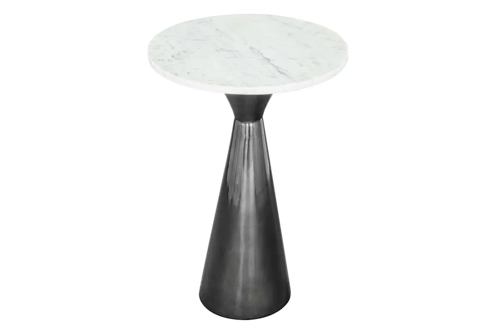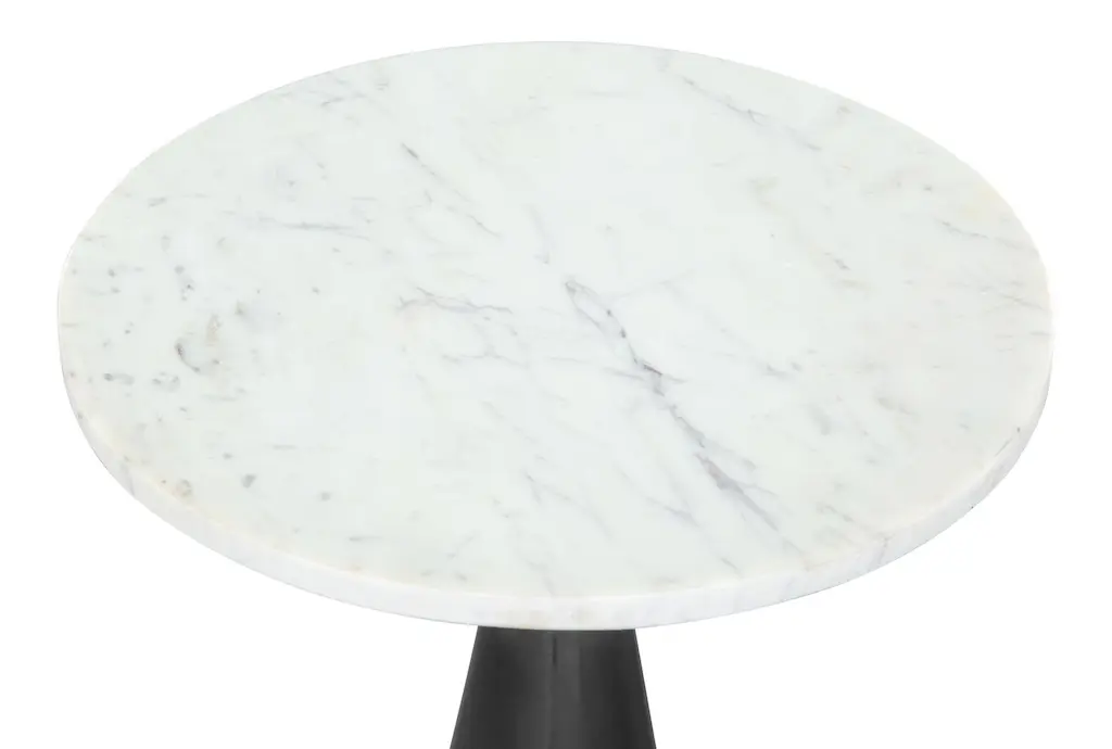 This modern White & Black Marble Top Pedestal End Table is made of metal with a white finish and features a striking marble top. The table is made of iron, marble, MDF, and laminater, and requires assembly. It is available in both a white and black color and does not require any hanging method.