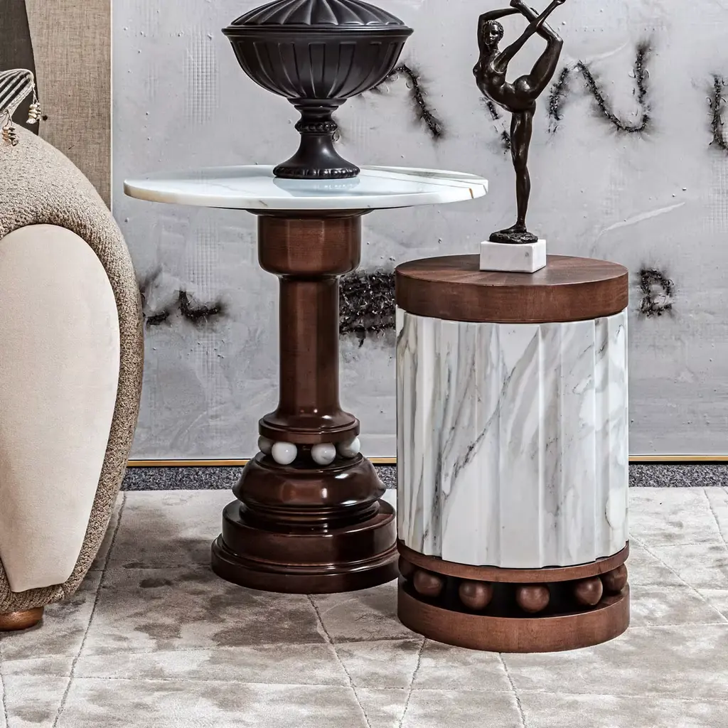 This sculptural coffee table features clean and elegant lines with its structure made of a column segment of Borghini Calacatta marble. The top and the base are handcrafted using precious stained maple.