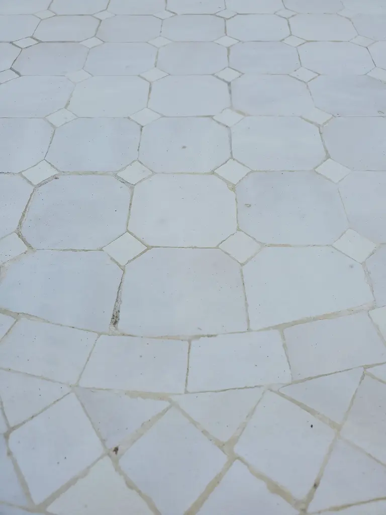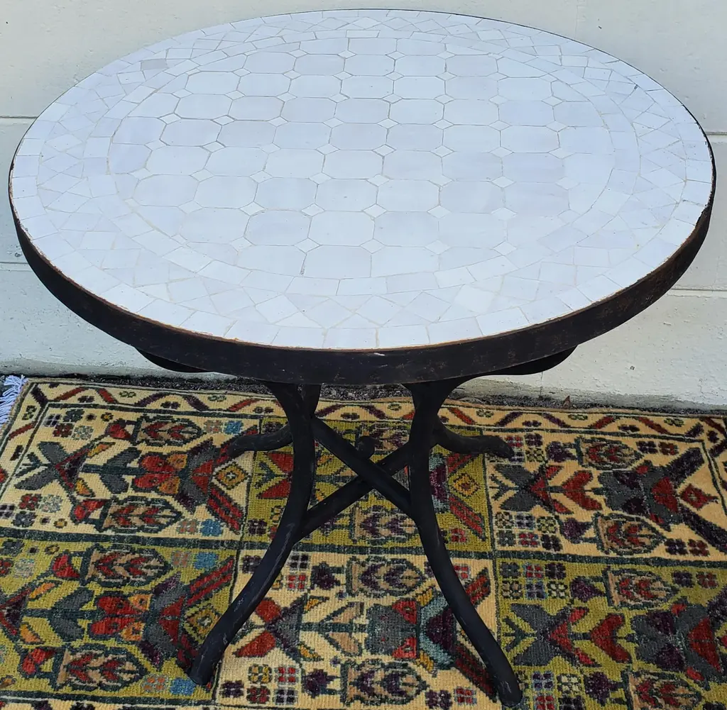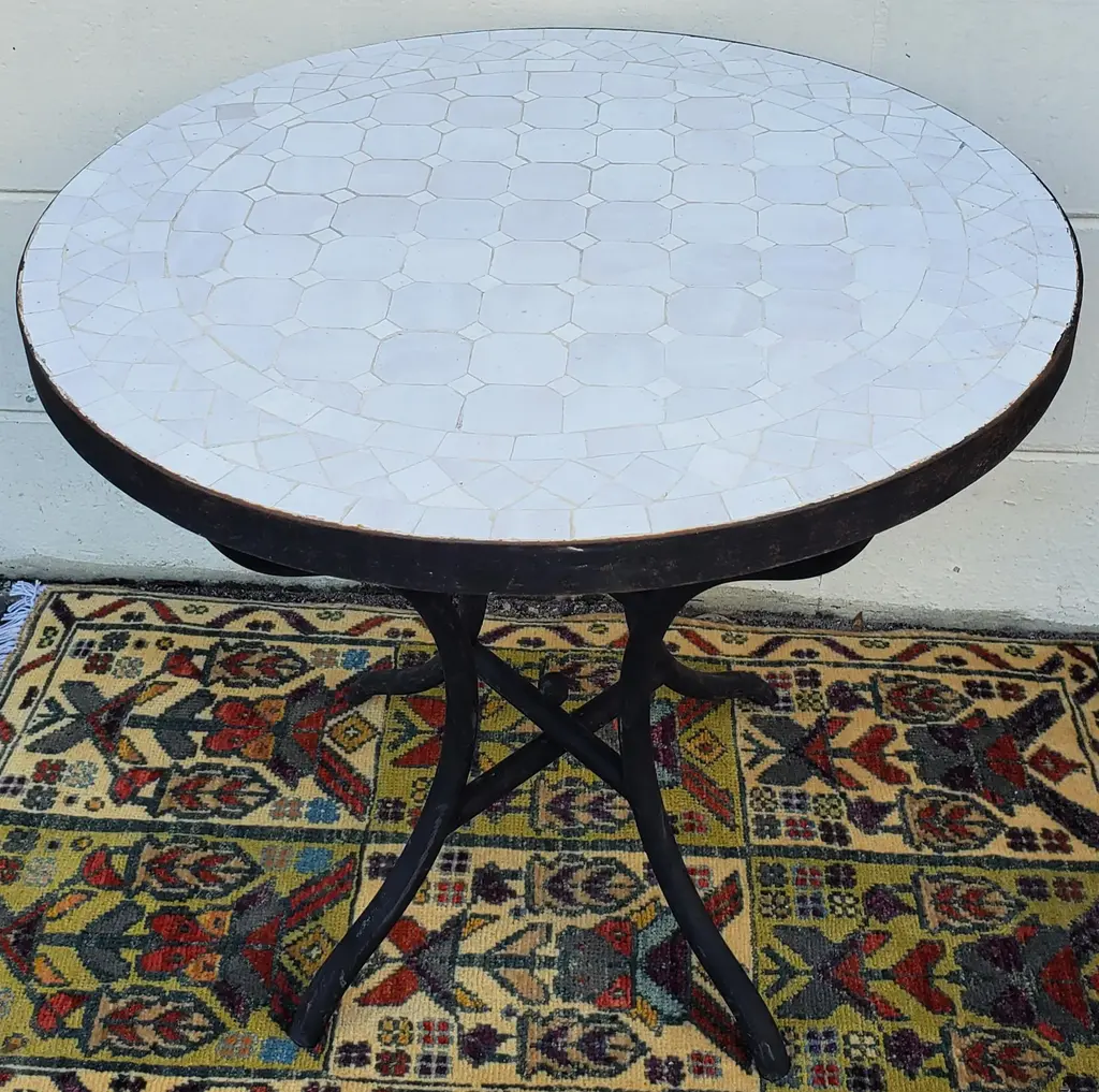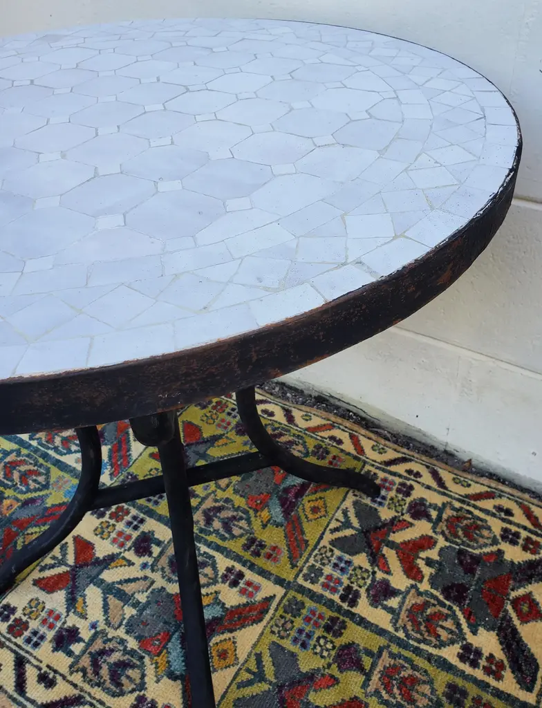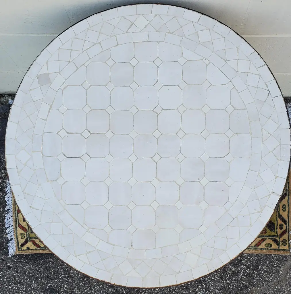 100 % glazed. Round Moroccan mosaic table measuring approximately 24" in diameter and 19" in height, with white tiles. For both indoors and outdoors. Great as a cocktail table. Vibrant color. Intricate patterns. Included in the price is a wrought iron folding base. 29" height base is available. Mosaic tables and Mosaic fountains are our specialty. We have many to choose from. Different sizes, shapes, and colors are available in stock. Please contact us if you don't see what you are looking for. The subtle variations and small flaws in a handmade item are what give it a unique personality and undeniable charm.
