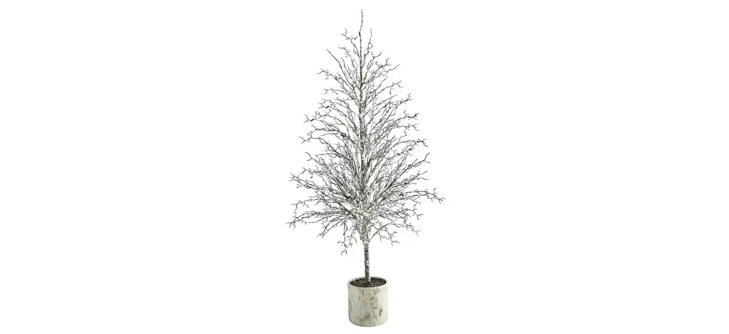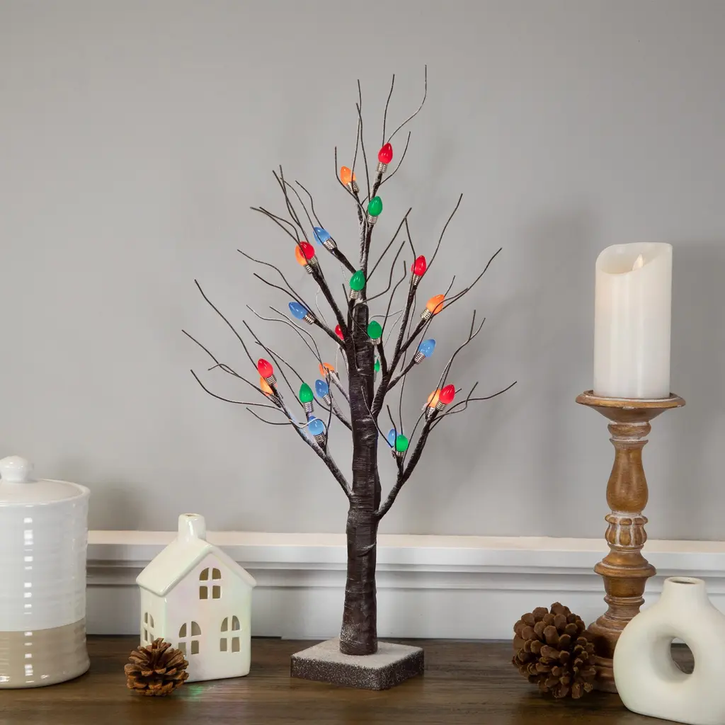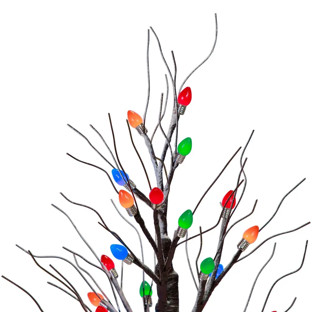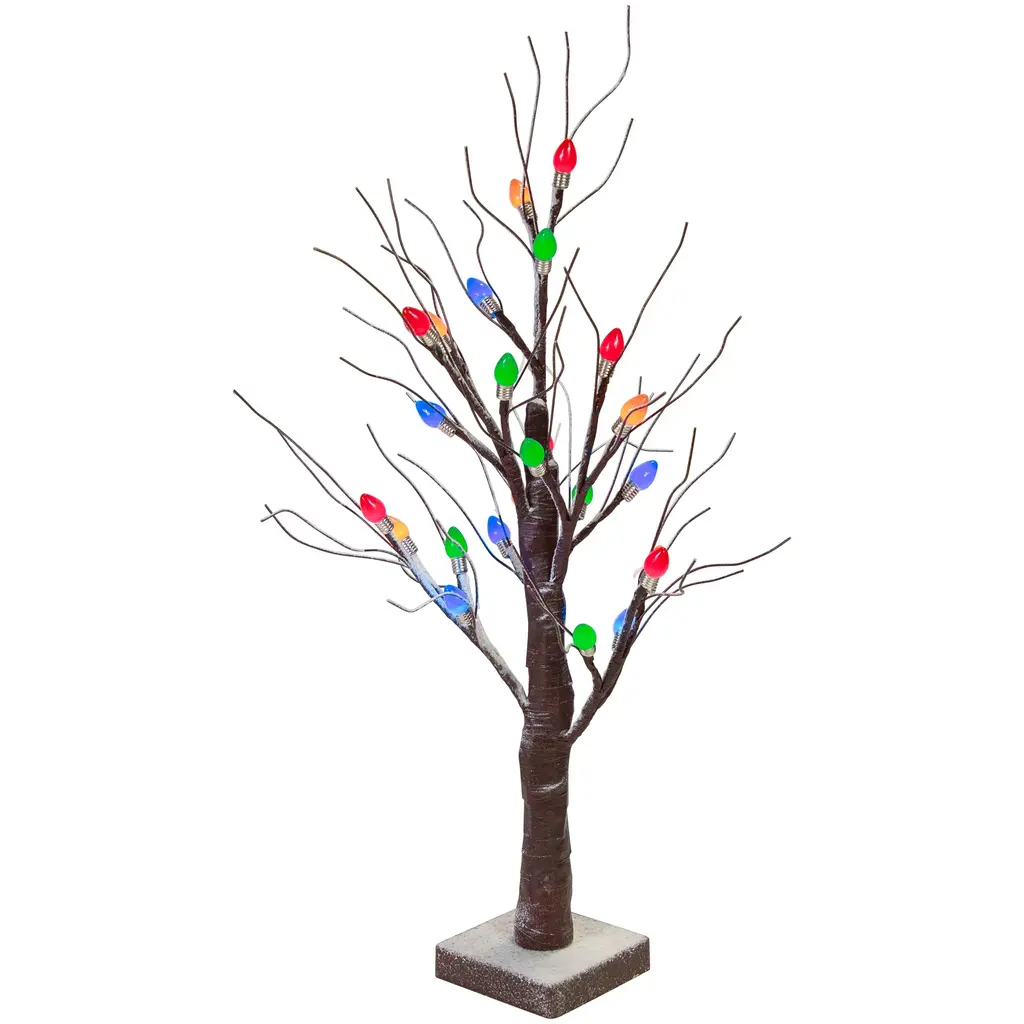 This sweet, snowy Christmas tree adds the perfect amount of light and color. The mini retro bulbs are a throw back to Christmases past. Ideal for smaller spaces such as mantles or side tables. Product Features: Pre-lit with 24 LED lights Bulb color: multi - blue, green, orange, red Bulb size: mini retro C7 Hand wrapped branches and trunk Lightly frosted Includes an attached tree stand Branches are bendable to help accommodate your decorating needs Battery operated - requires 3 AA batteries - not included Recommended for indoor use only Dimensions: 24"H x 15"W x 15"D Stand: 4"H x 4"W x 1"D Material(s): metal/plastic/wire