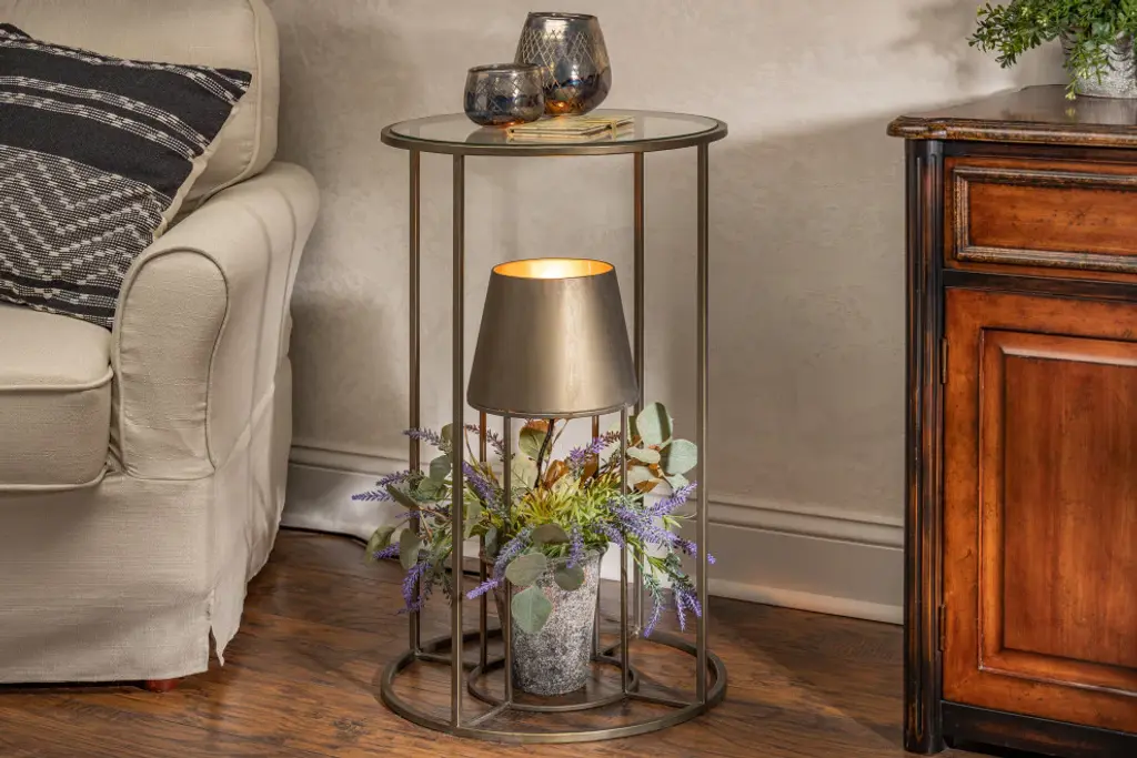 27.55" Round Metal Accent Table, Glass Top And Built, Electric Lamp