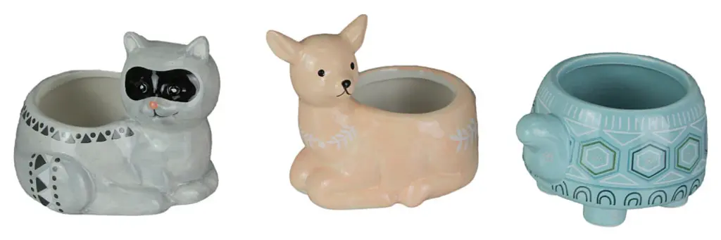 OVERALL SIZE - Each Planter Measures Approximately 3.75 Inches High, 4.25 Inches Long, 3.75 Inches WideDURABLE MATERIAL - Made of Non-Porous Dolomite CeramicUNIQUE FINISH - Glossy Glazed Single Color FinishesCREATIVE DECOR - Great for Use with Air Plants, Succulents and HerbsPERFECT GIFT - For Yourself or Your Nature Loving Friends or FamilyThis awesome set of 3 adorable Forest Critters tortoise, raccoon, and deer mini planters adds a whimsical accent to any decor. Crafted of non-porous dolomite ceramic, the planters are perfect for windowsills and chairside tables, indoors or outdoors. Each planter measures approximately 3.5 inches high, 4.25 inches long, and 3.75 inches wide, with a 2.5-inch diameter, and 2.5-inch deep interior planting area. They are great for potting small succulents, herbs, and cacti.