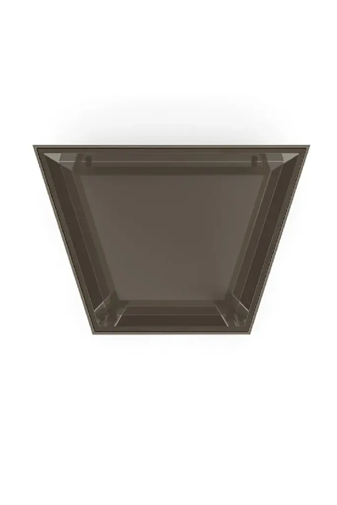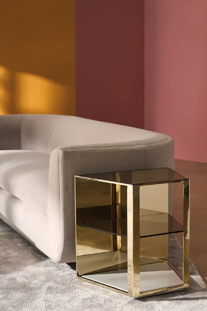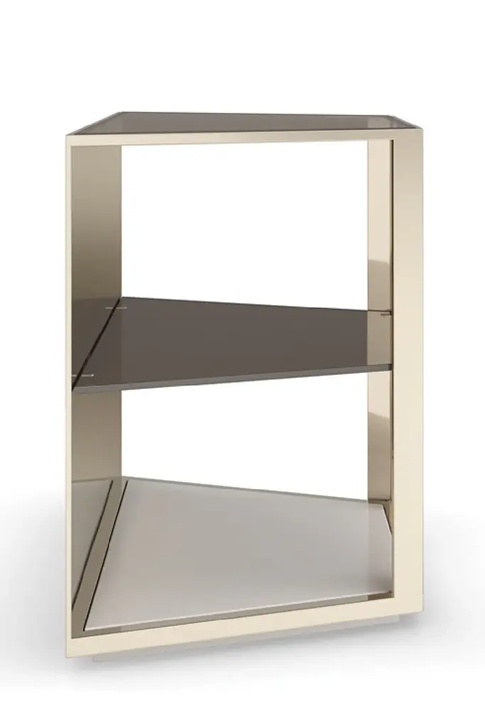 Reflect your mood and the room with this uniquely shaped end table. Features a Smoked Bronze glass top and shelf, framed in a Whisper of Gold for added shimmer. Its airy and open design offers ample space for storage and display, adding a note of luxe without imposing. Pairs perfectly with our Refraction cocktail table.