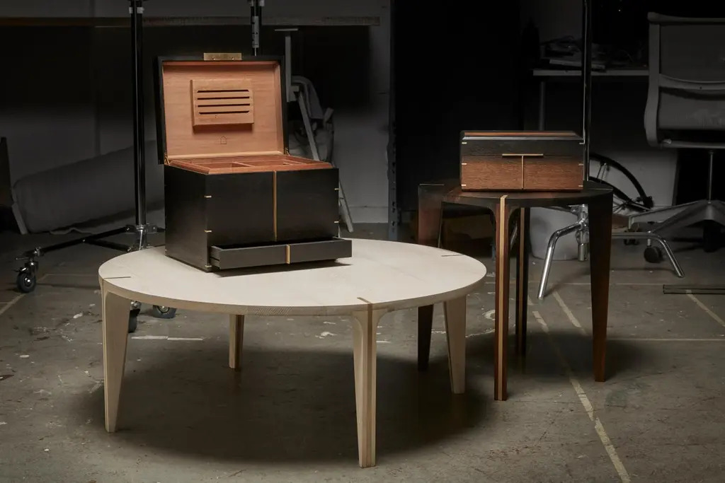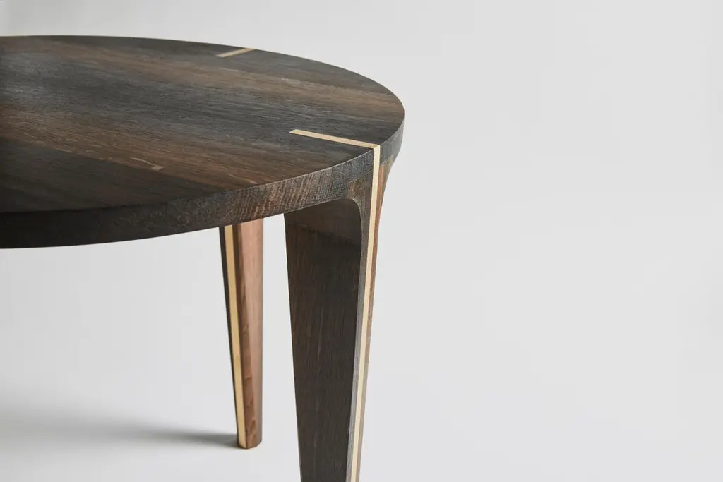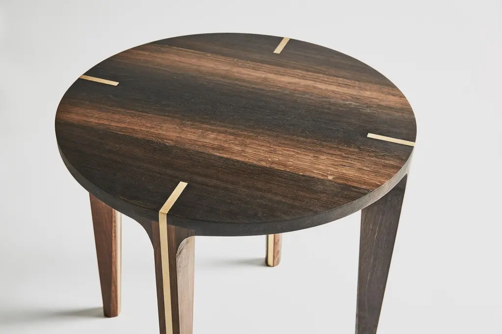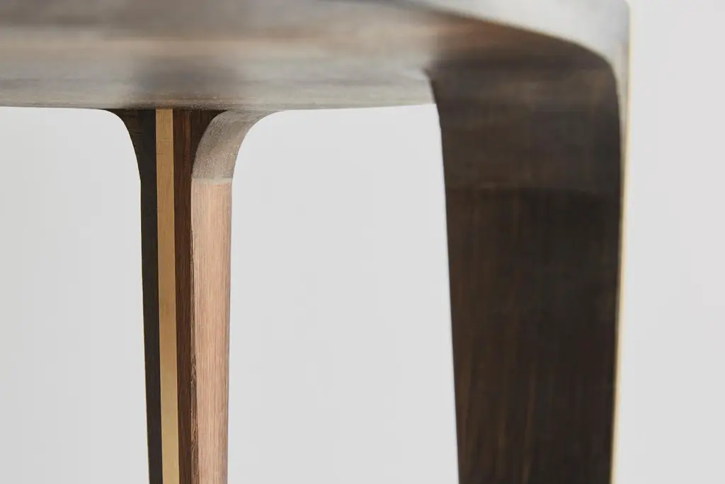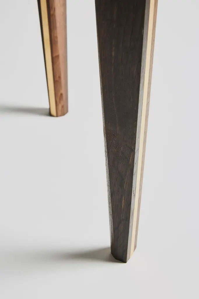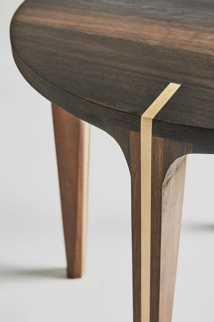 Dovedale Design Studio specialises in producing products from thousands-year-old black bog-oak. These logs are found preserved beneath the surface, undisturbed in an anaerobic acidic bog condition, in the fens of Cambridgeshire. This area within the United Kingdom was where entire forests fell due to flooding. With the drying of the soil, whole logs have risen back up. We have had samples from our supplier carbonated from 3000 to 5000 years old. As old as some of the first written words. This side table, made from solid brass and bog oak, has a unique and minimalist design inspired by Japanese and Scandinavian styles. The solid thousands-year-old bog oak is a natural material, varying in colour and grain. Not one of our designs will ever be the same due to this gradient of grain found within this material. It is available for a bespoke order. Please be aware of the variety of colouring found in bog oak.