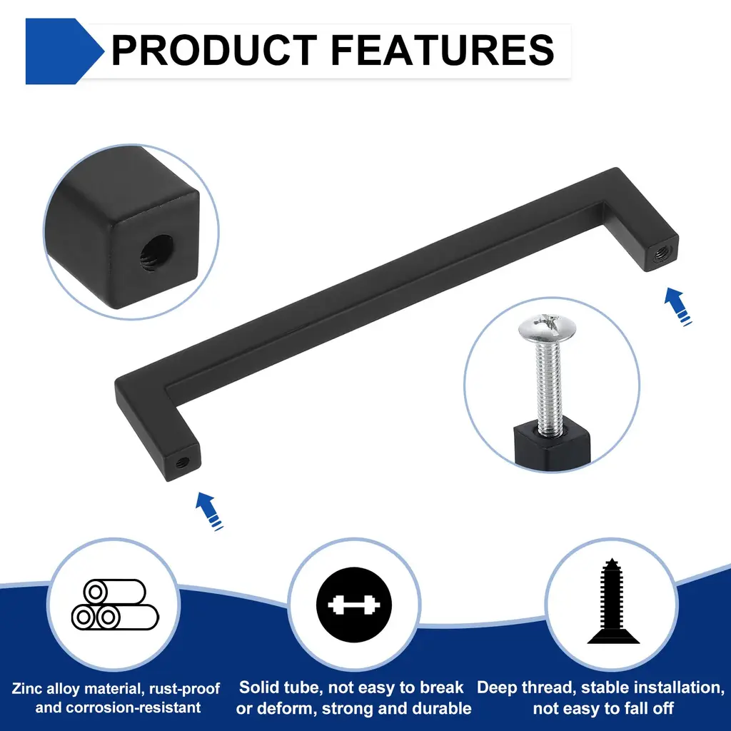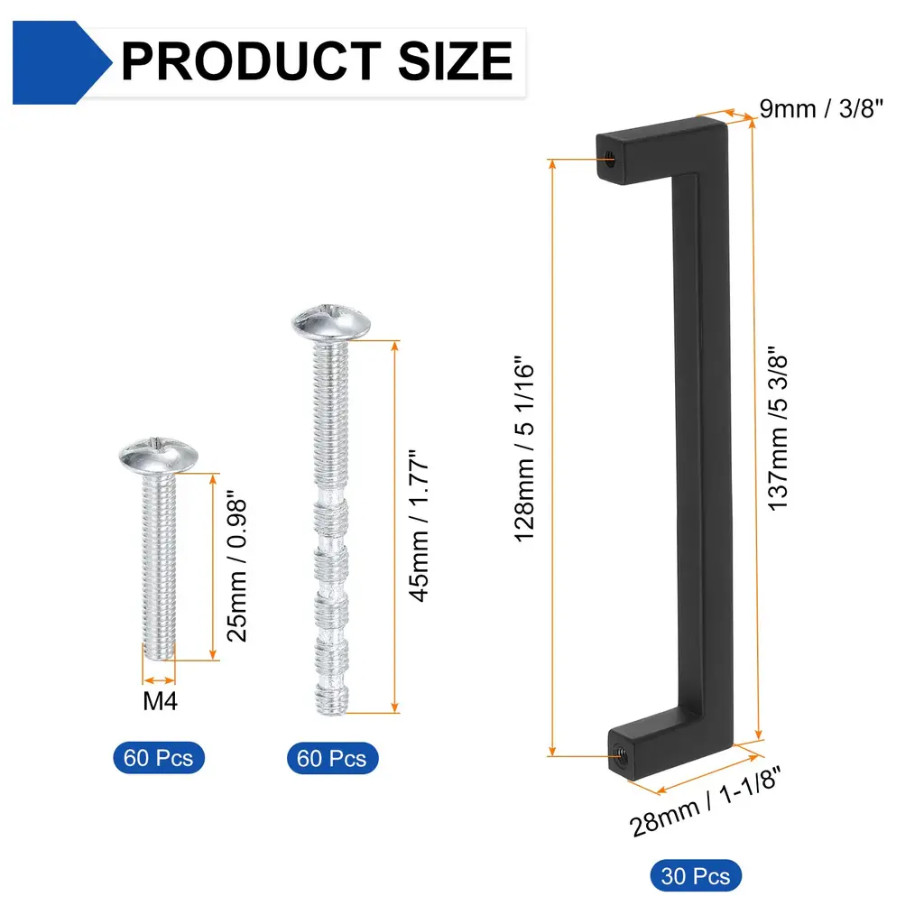 Description[Material] - Our drawer bar pulls are made of zinc alloy, they are solid tube structure, which is more robust, durable and corrosion-resistant, easy to use and has a long service life.[Slim Square Design] - The cabinets handle with a slim square appearance, its simple and modern design is suited for farmhouse, vintage, traditional and transitional styles. These handles will give your cabinets a clean and tidy look, easily enhancing the elegance of your cabinets doors and drawers.[Deep Hole Thread Design] - These square cabinets pulls have a thick solid base, which is not easy to break and deform. The deep threads allow the screws to bite more tightly, making the handle and the cabinets door heel fit together and not easy to fall off, making it easy to pull out the drawer.[Wide Application] - The Kitchen Cabinets Handles are great furniture hardware accessories, suitable for different styles of furniture and rooms. Such as kitchen cabinets, drawers, cupboards, wardrobes, bedside tables, etc.SpecificationMaterial: Zinc AlloyScrew-hole Center: 5 1/16 inch(128mm)Overall Length: 5 3/8 inch(137mm)Width: 3/8 inch(9mm)Height: 1 1/8 inch(28mm)Hole Thread Specifications: M4Color: BlackPackage Includes30pcs x Square Drawer Handles60pcs x 25mm Screws60pcs x 45mm Screws