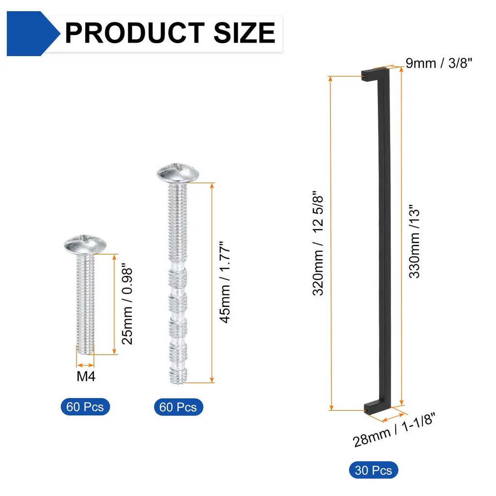 Description[Material] - Our drawer bar pulls are made of zinc alloy, they are solid tube structure, which is more robust, durable and corrosion-resistant, easy to use and has a long service life.[Slim Square Design] - The cabinets handle with a slim square appearance, its simple and modern design is suited for farmhouse, vintage, traditional and transitional styles. These handles will give your cabinets a clean and tidy look, easily enhancing the elegance of your cabinets doors and drawers.[Deep Hole Thread Design] - These square cabinets pulls have a thick solid base, which is not easy to break and deform. The deep threads allow the screws to bite more tightly, making the handle and the cabinets door heel fit together and not easy to fall off, making it easy to pull out the drawer.[Wide Application] - The Kitchen Cabinets Handles are great furniture hardware accessories, suitable for different styles of furniture and rooms. Such as kitchen cabinets, drawers, cupboards, wardrobes, bedside tables, etc.SpecificationMaterial: Zinc AlloyScrew-hole Center: 5 1/16 inch(128mm)Overall Length: 5 3/8 inch(137mm)Width: 3/8 inch(9mm)Height: 1 1/8 inch(28mm)Hole Thread Specifications: M4Color: BlackPackage Includes30pcs x Square Drawer Handles60pcs x 25mm Screws60pcs x 45mm Screws