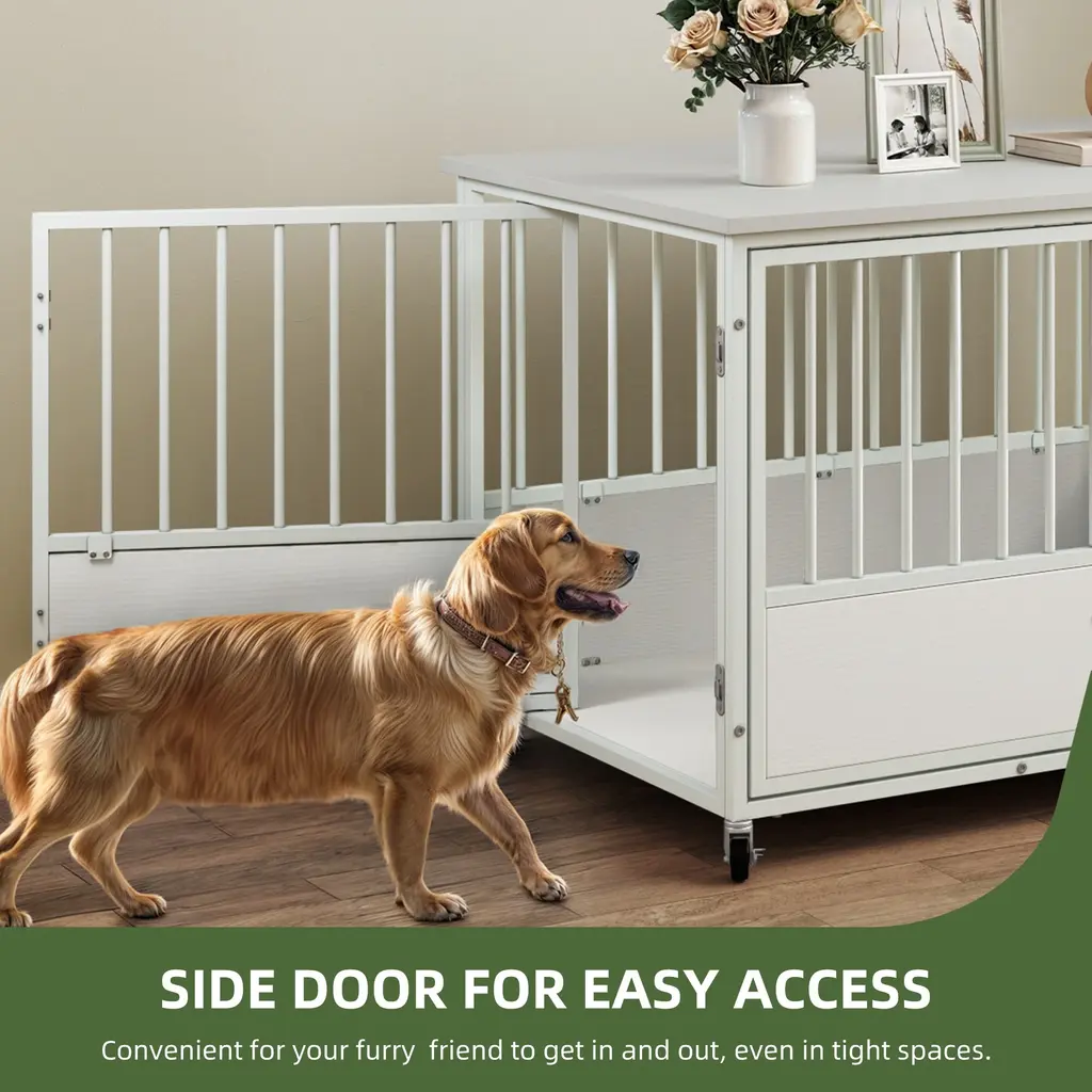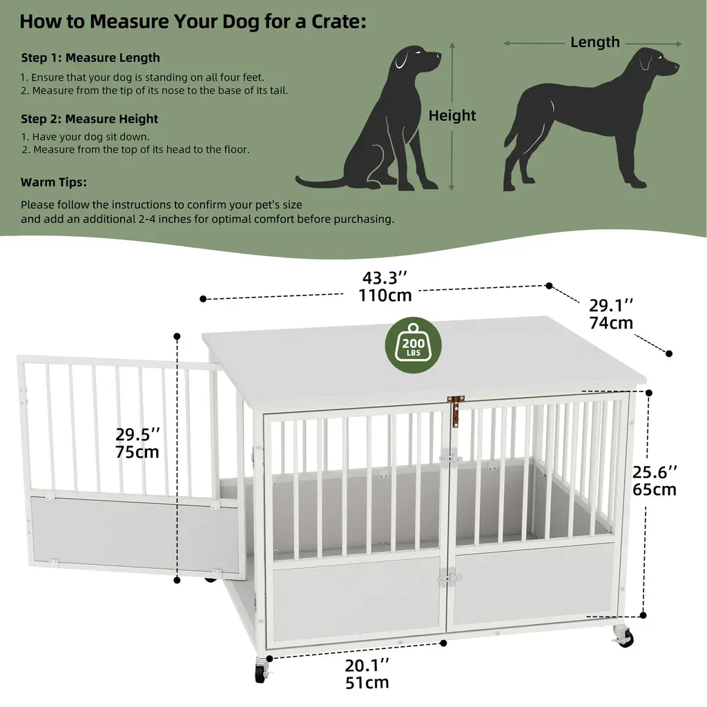Upgrade your home with the Multi-Purpose Dog Haven, a secure and stylish dog crate that doubles as an end table or bedside cabinet. This heavy-duty crate is crafted from 0.6-inch diameter corrosion-resistant steel, making it ideal for powerful and aggressive dogs. With its multi-layered, non-toxic coating, it ensures your pet's health even if they bite or lick the frame. The crate's 360° lockable wheels provide easy mobility, and the resistant doors design offers flexibility for any space. The top panel, capable of holding up to 200 lbs, can be adorned with decor to match your home's aesthetic. Features: Product Information: