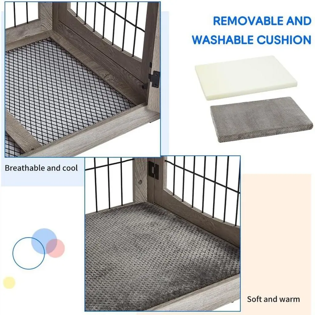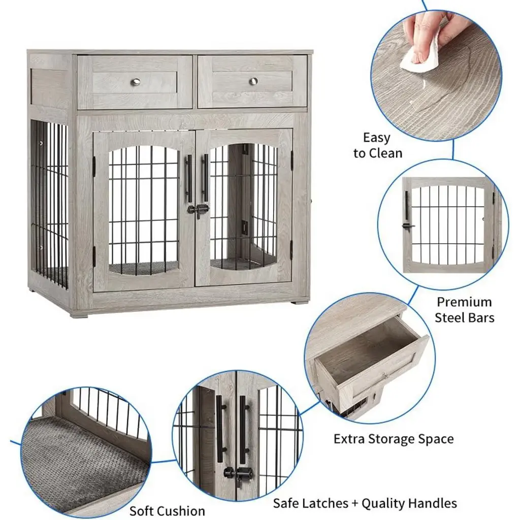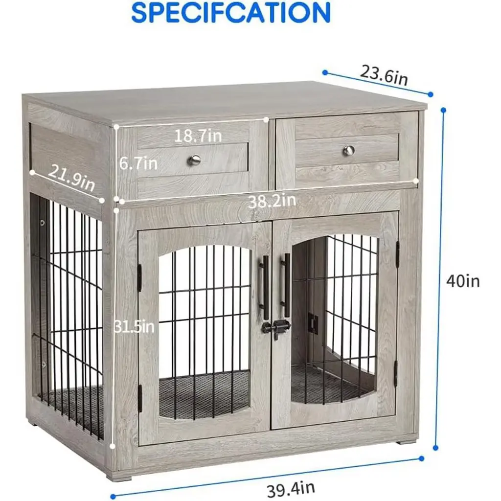 39.4" Large Dog Crate Furniture, Wooden Indoor Dog Kennel With 3 Doors, 2 Drawers & Cushion, End Table Style Pet House For Medium/large Dogs, Gray