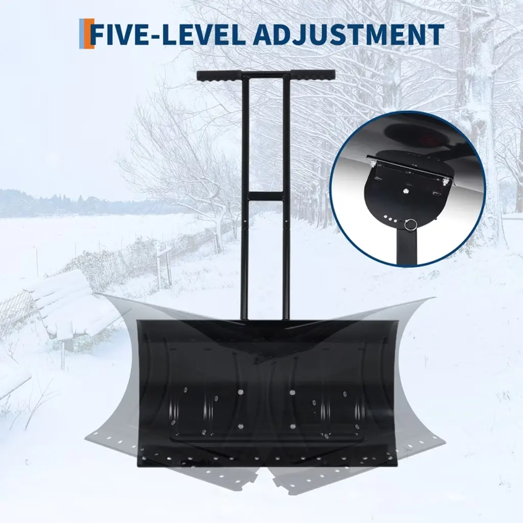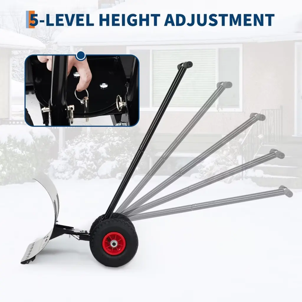 This wide snow pusher features a metal blade spanning over 39 inches, allowing efficient clearing of large areas with each pass. Its 7-position adjustable head offers flexible movement for directing snow in multiple directions, while the blade securely locks into five different angles to accommodate varying snow depths and surface types. The handle can be set to five height levels—ranging from 15.74 to 45.67 inches—enabling users of different statures to work comfortably. Built with a coated metal frame, the tool resists rust and maintains structural integrity through repeated use in snowy or icy conditions. Two 10-inch non-slip rubber wheels provide stability on slippery surfaces, and the unit assembles easily with included instructions. When not in use, the snow pusher stores compactly, making it a practical choice for seasonal snow removal.