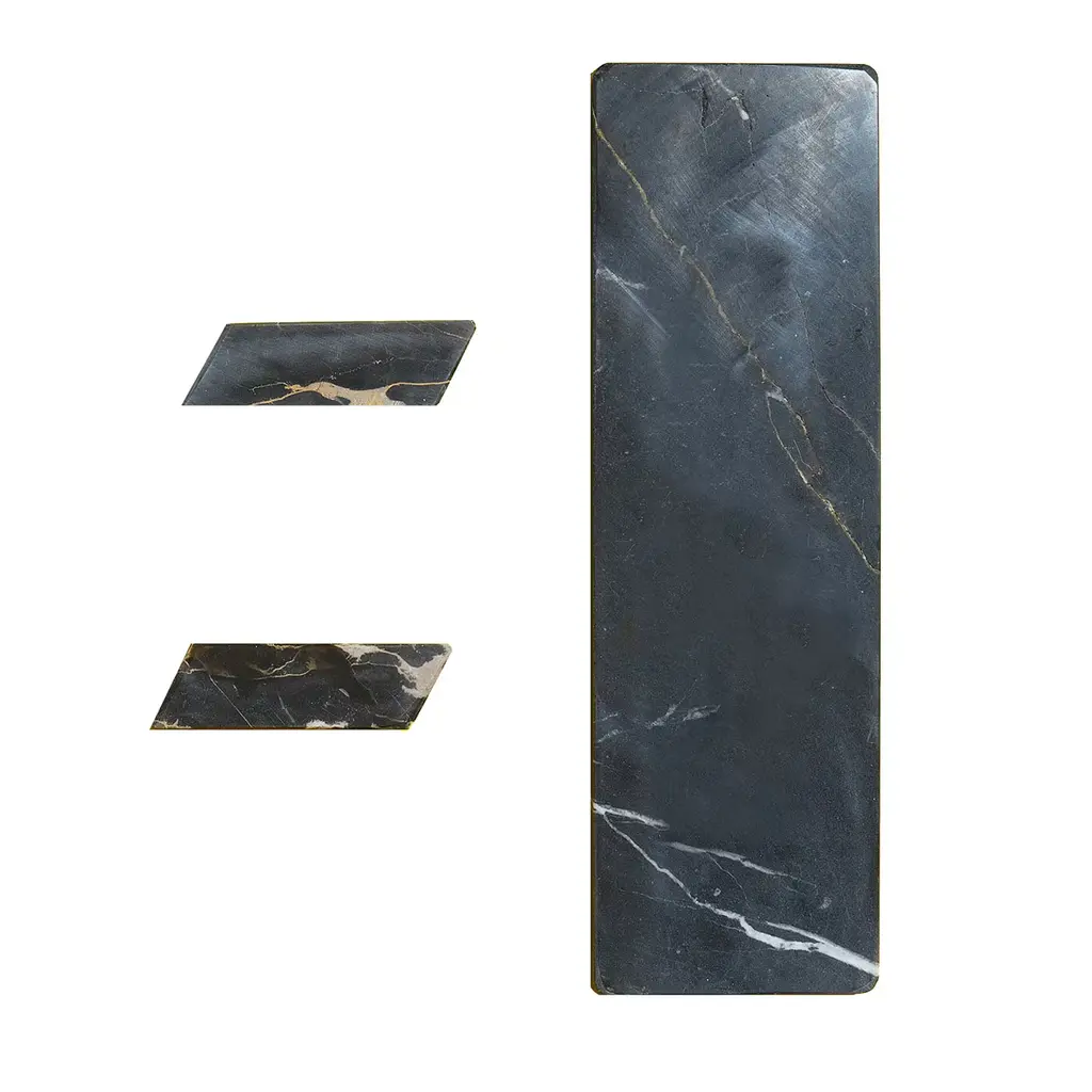 A breath-taking natural stone as Marquina black marble is what is needed to set a truly exclusive tone to contemporary tables. This sushi set comprised of a rectangular plate, two diagonally-cut cutlery rests, and a pair of wooden chopsticks will be a striking statement for Japanese-themed dinners, elevating your food with its warm yellow and golden traceries.