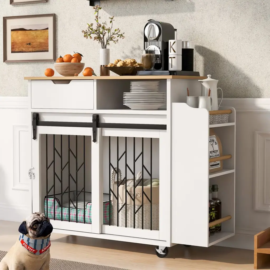 This innovative multi-functional furniture seamlessly combines a stylish kitchen island/end table with a cozy dog crate, designed to blend effortlessly into your home decor while providing a secure space for your pet.