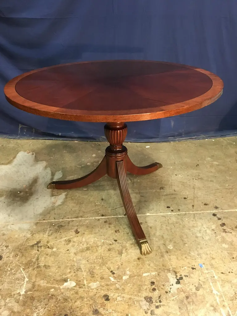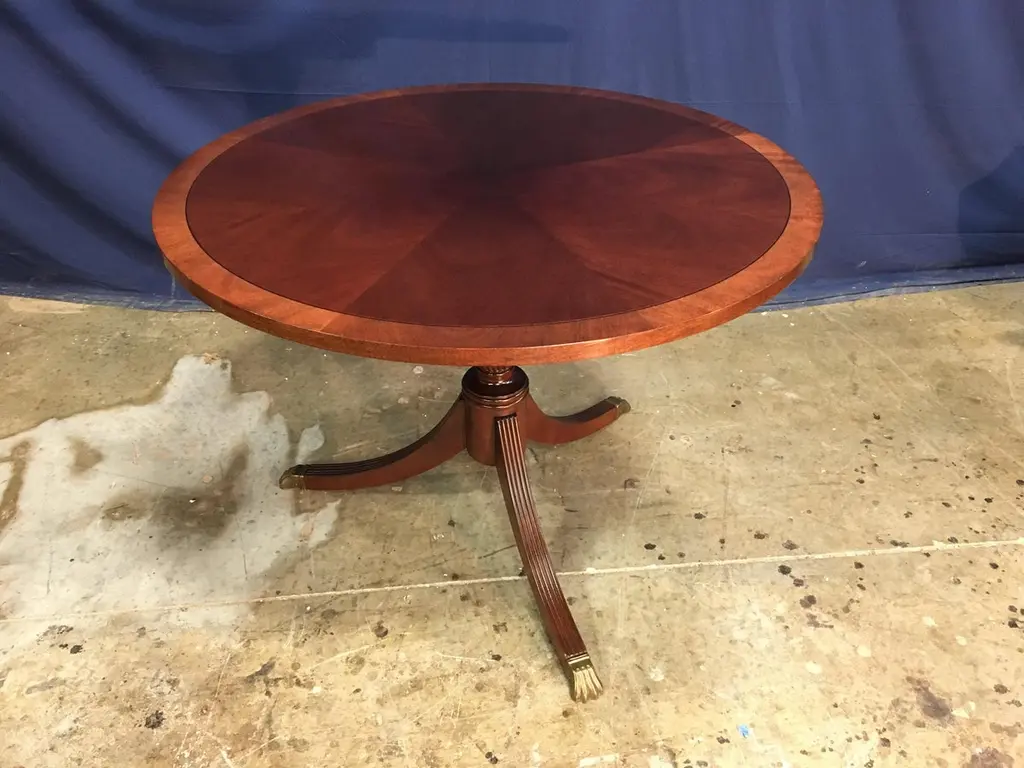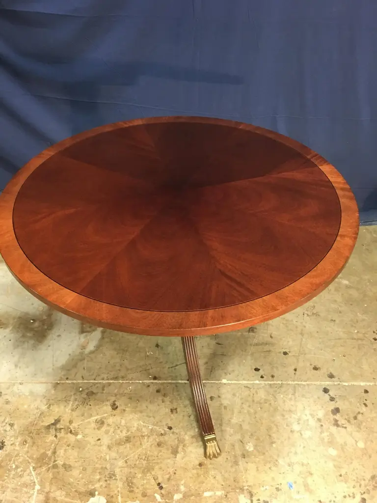This is made-to-order round traditional mahogany accent or foyer table made in the Leighton Hall shop. It features a field of radial cut cathedral mahogany with a contrasting mahogany border. It has a hand rubbed and polished semigloss finish. The pedestal has three fluted legs which terminate with antique brass lions paw feetDimensions: 42 in. diameter, 30 in. high. Optional finishes, pedestals and brass feet available.