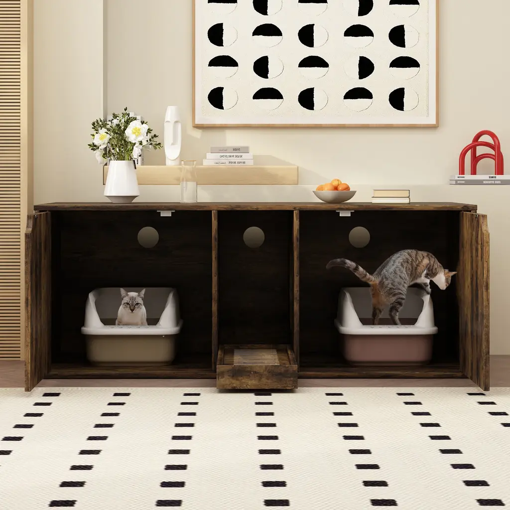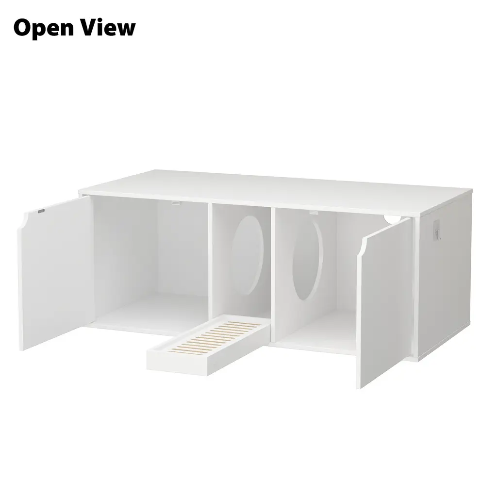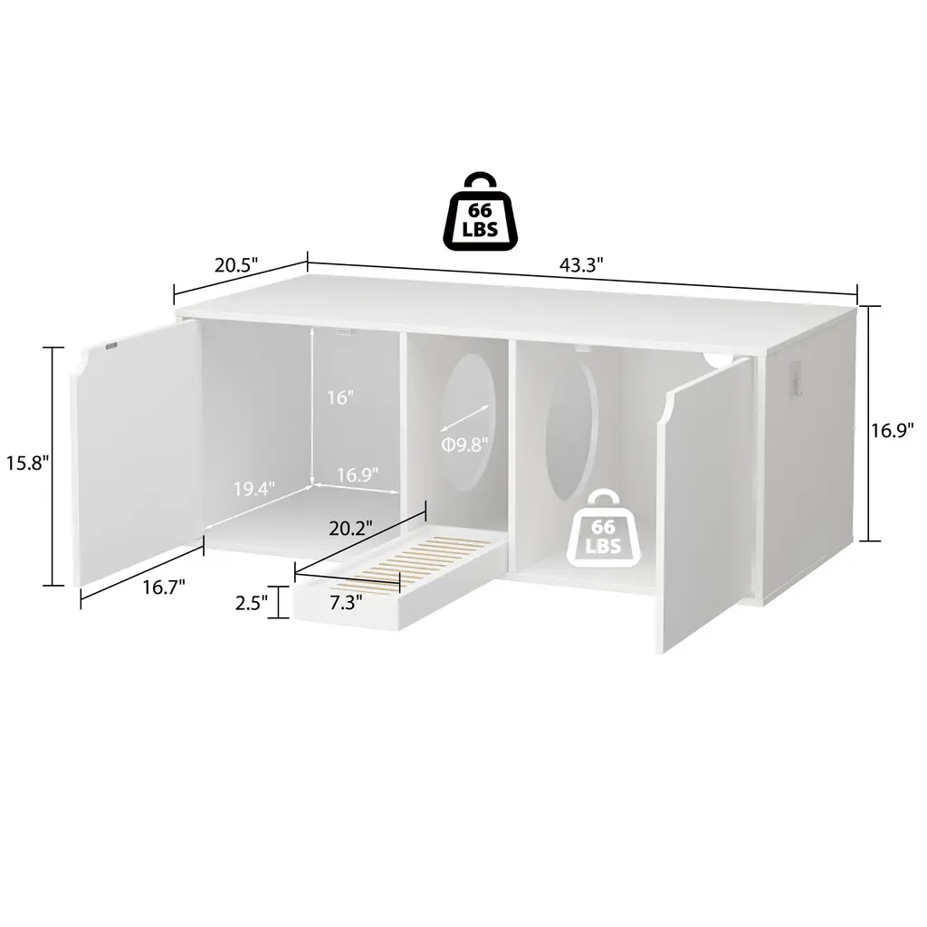Who are we?Simply put, we sell furniture but our mission is to create spaces that inspire. We believe that every space whether it's for home, work, or play should reflect you and bring joy.We are committed to providing high quality furniture. Use high cost performance materials for any kinds of home furniture. We spend most of our energy exploring more innovative design to provide high-end, modern and high quality products for customers. You'll have a visual enjoyment when you get home exhausted. Get our products and enjoy your life! ▼ Features ☑Our cat litter box enclosure ensures your cat litter box are not visible anymore, help the smell and offer a personal bathroom for your lovely cat. And it can collect the litter to prevent litter from traveling in your house. ☑Our cat cabinet is vary spacious and is made to accommodate 2 litter pans, has double door opening, each cat has its own toilet and privacy. And a cat litter catch hallway in the middle where the catch is placed for the kitties to wipe their feet on when they leave. ☑The interior space for cat litter box enclosure is 16.9"x19.4"x16"",suitable for most cat litter boxes, and the weight capacity of our hidden cat litter box furniture is 165lbs, sturdy as well as so you can even sit on it. ☑White wooden cat litter box enclosure furniture will fit almost home decors, it can also be used as a indoor cat hose, side table, cat washroom bench and nightstand. You can also stack 2 cat cabinets together to make your living room more tidy. ☑Our cat litter box enclosure is made of eco-friendly and premium wood has no smell, is very sturdy, and is extremely durable for long-time use. The wooden cat washroom features smooth paint, which is easy to clean and maintains a clean environment. ☑We will provide all the accessories needed for assembly and detailed instructions for the installation. ☑Note: No matter how good the product is, it will be damaged if it is immersed in water for a long time. Please try to keep the environment dry and clean up the water