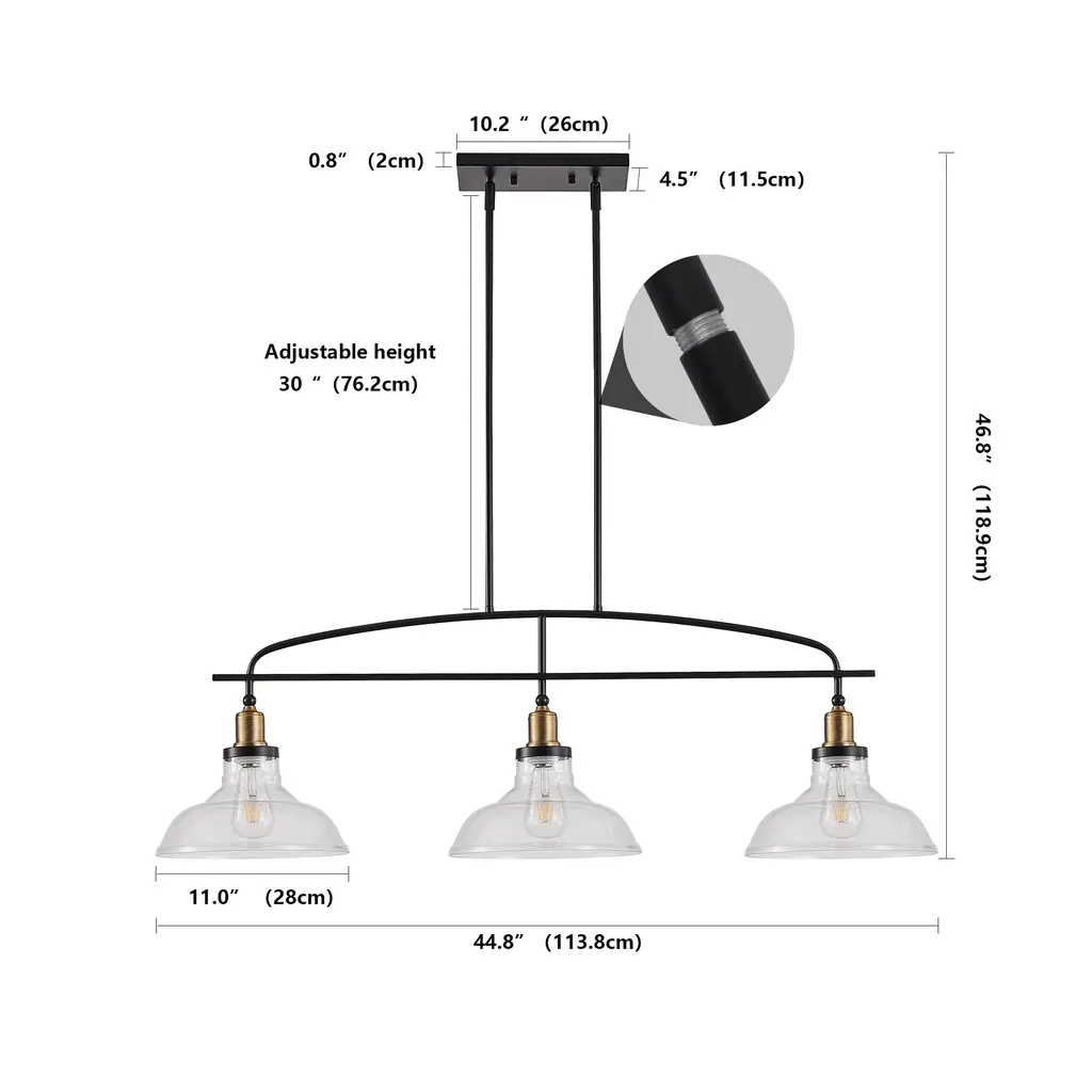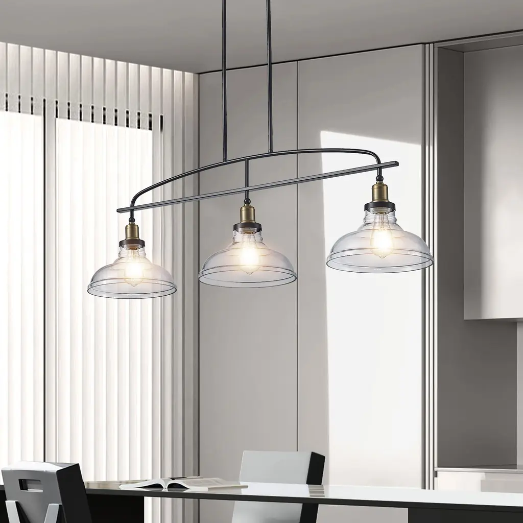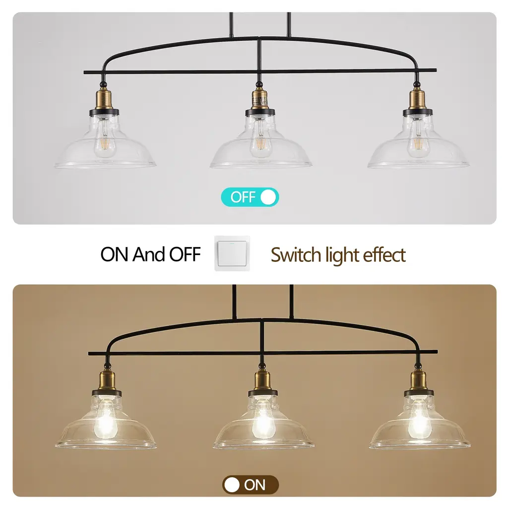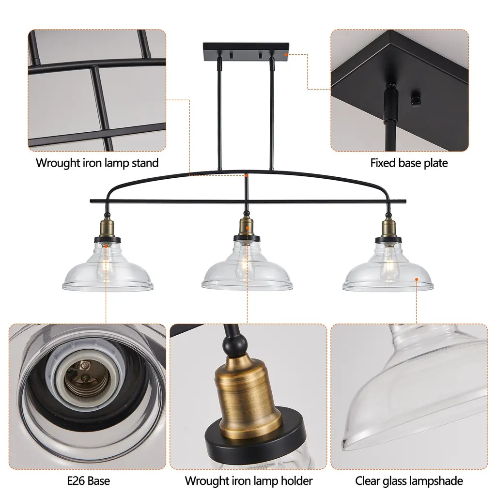 Industrial 3-Light Pendant Chandelier with Clear Glass Shades, Black Metal Frame, Adjustable HeightLighting up your home with classic industrial style, this three light pendant light features a minimalist black metal and transparent glass lampshade design, bringing a perfect combination of fashion and elegance.Adjustable height design, suitable for various scenarios such as kitchen island, dining room, living room, etc., easily creating a warm atmosphere.Compatible with multiple types of light bulbs, allowing you to freely choose the light source (bulbs need to be purchased separately).Easy to install and durable in quality, this is not only a lamp, but also the finishing touch of your home style!
