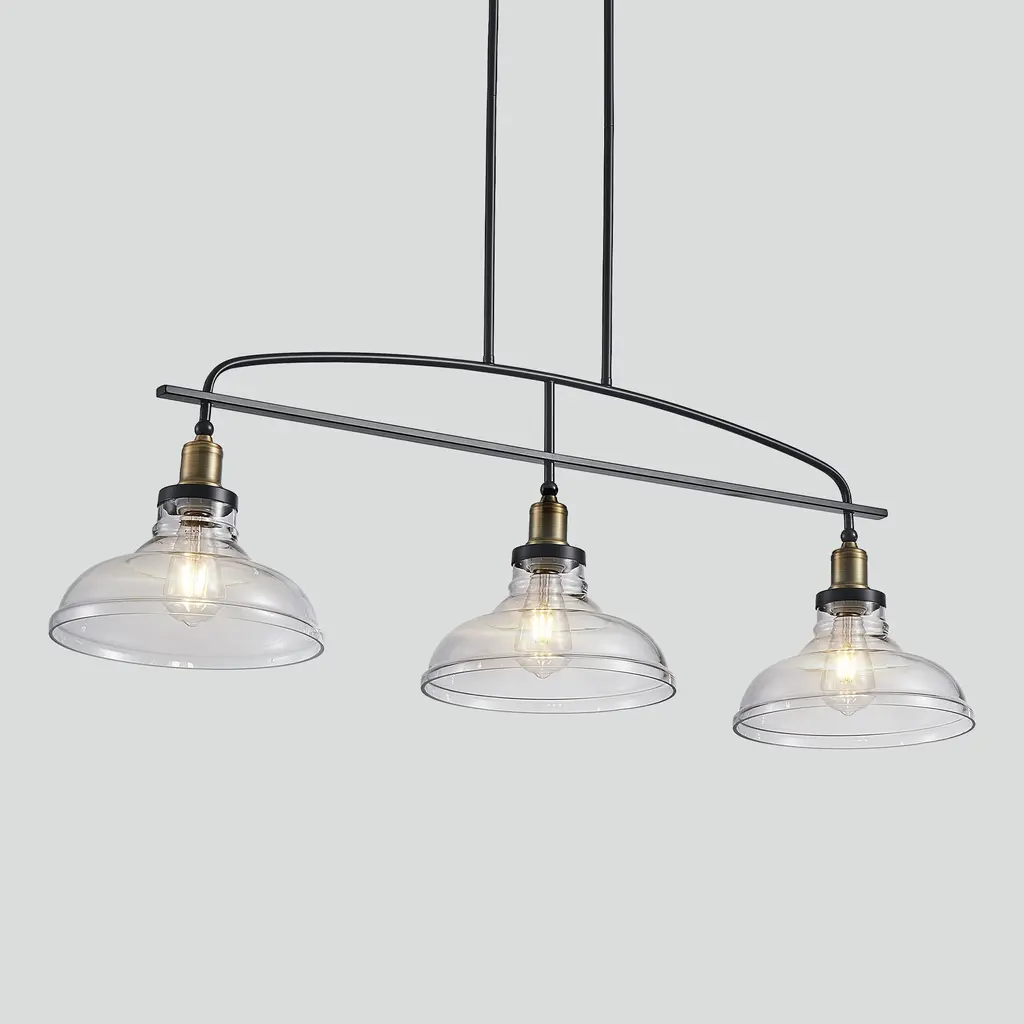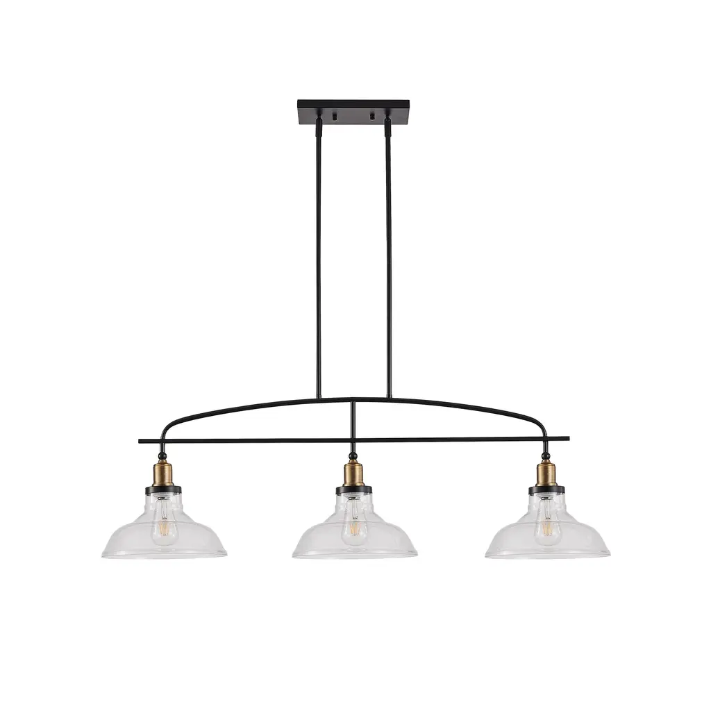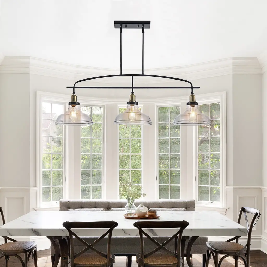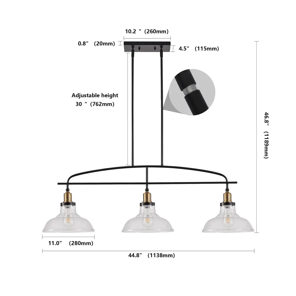 Industrial 3-Light Pendant Chandelier with Clear Glass Shades, Black Metal Frame, Adjustable HeightLighting up your home with classic industrial style, this three light pendant light features a minimalist black metal and transparent glass lampshade design, bringing a perfect combination of fashion and elegance.Adjustable height design, suitable for various scenarios such as kitchen island, dining room, living room, etc., easily creating a warm atmosphere.Compatible with multiple types of light bulbs, allowing you to freely choose the light source (bulbs need to be purchased separately).Easy to install and durable in quality, this is not only a lamp, but also the finishing touch of your home style!