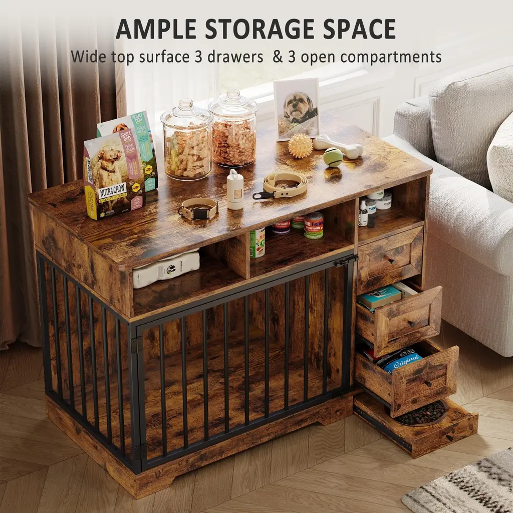 A Cozy Haven for Your Pet: Measuring 47.8x23.6x33.5 inches, this indoor dog crate is ideal for medium to large dogs, offering ample space for relaxation. Its spacious design allows your furry friend to lounge comfortably in an inviting environment A Safe Haven: Made from thick engineered wood, this decorative pet crate ensures durability and stability. Heavy-duty metal bars resist chewing and scratching, providing excellent ventilation for your dog's comfort and easy visibility for monitoring Dual Functionality: With three open and three closed drawers, this farmhouse dog crate furniture serves as both an end table and an entryway table. The drawers are perfect for organizing toys and pet essentials, keeping your home neat and stylish Elegant Feeding: This wooden dog crate features a hidden stainless steel bowl for easy cleaning, ensuring your dog stays hydrated in style. Its discreet design preserves your home's aesthetic while offering a convenient feeding solution for your pet Featuring a vintage brown wood grain tabletop and modern farmhouse design, this large dog crate adds rustic elegance to any room. It serves as a spacious kennel while enhancing your decor, making it a beautiful addition to your living space