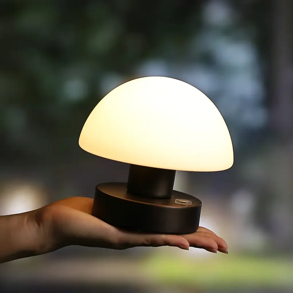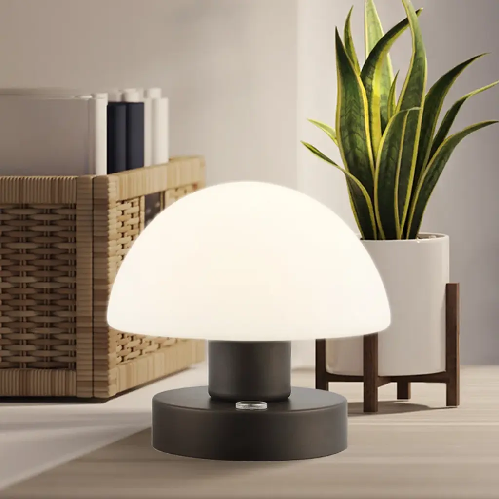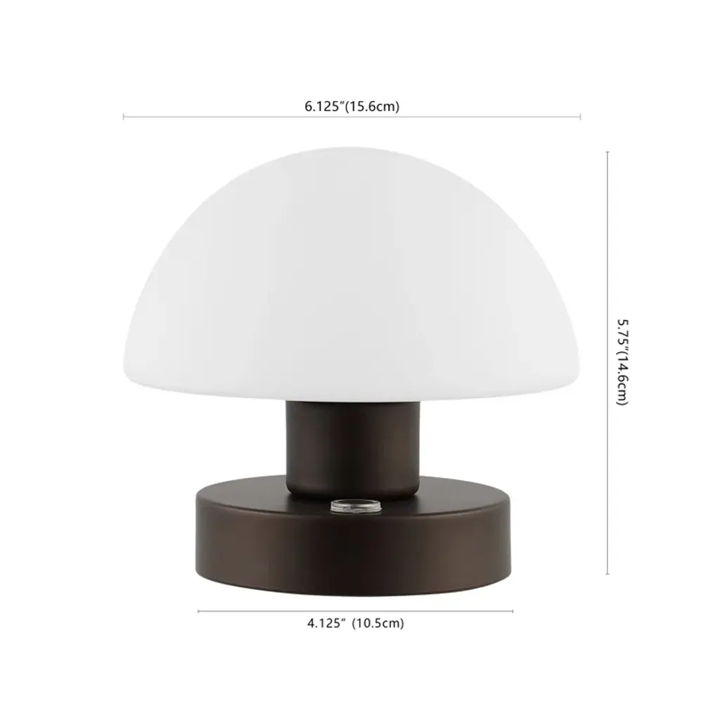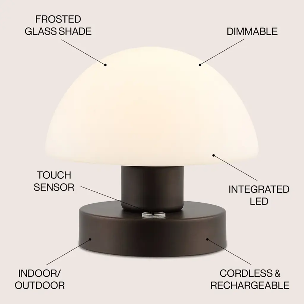Minimalist mushroom. A pared-back take on retro lighting styles, this desk lamp showcases a low-profile silhouette topped by a frosted glass dome shade. Cordless + rechargeable, it’s ready to light up your workspace, bedside table, or anywhere the evening takes you. Plus, this lamp is dimmable so you can set just the right mood.