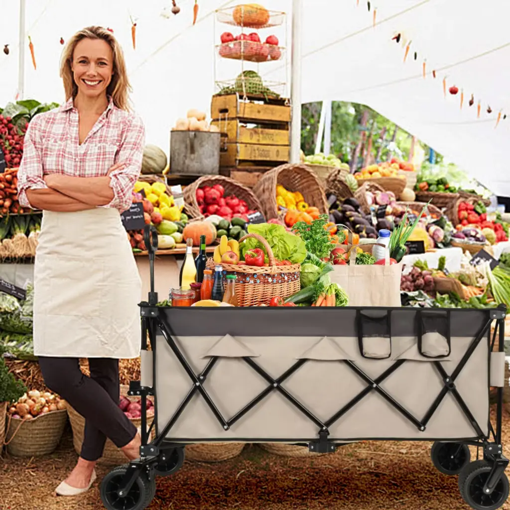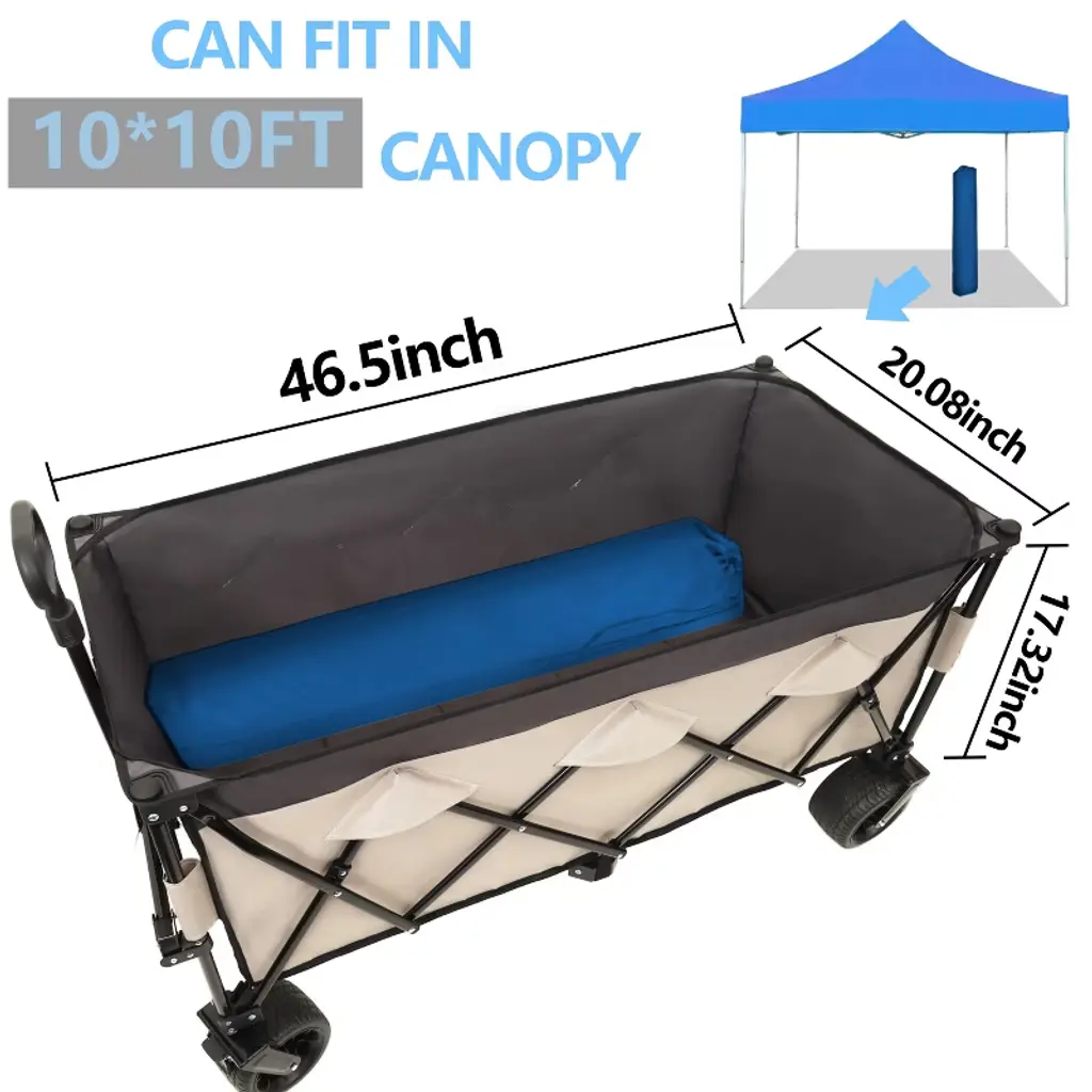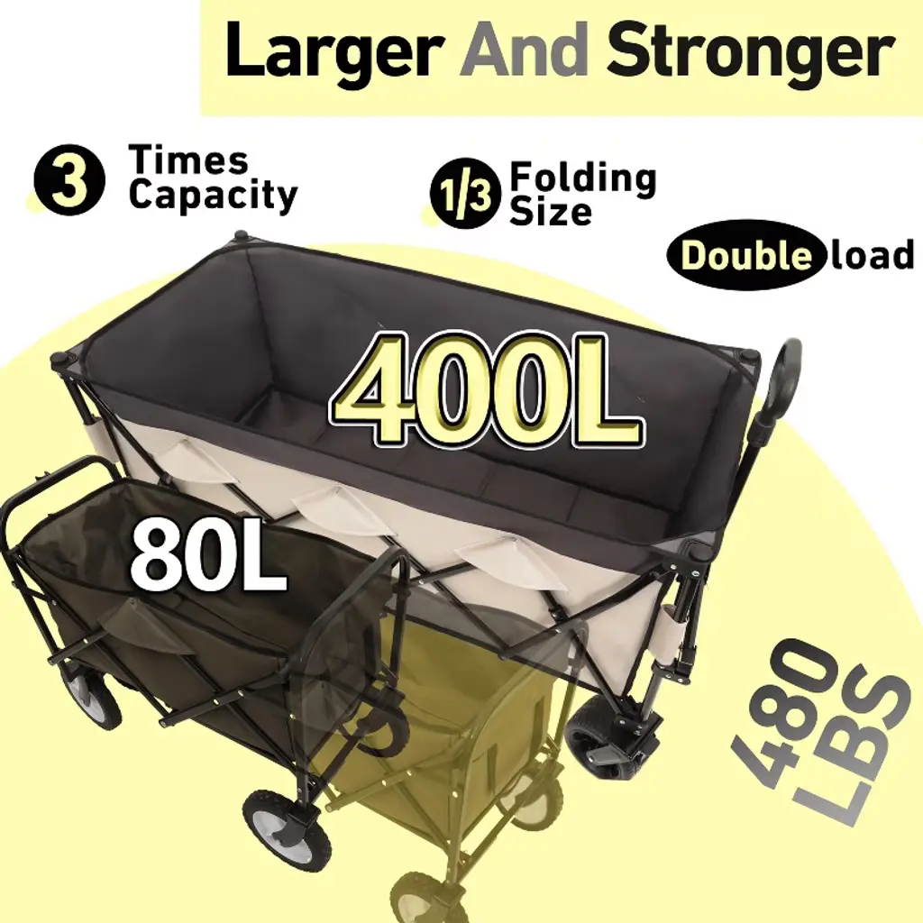 Upgraded 3X Mega Capacity¡¿44.3¡±L x 20¡±W x 17¡±H deep storage holds 3X MORE than standard wagons. Dual mesh cup holders secure drinks while hauling camping gear, tools, or bulk groceries.1:6 Space-Saving Fold Ratio ¨C Smallest & Largest¡¿Collapses to 1/6th its expanded size (beating 1:4 competitors!) for car trunk/garage storage. Includes a waterproof carry-on bag for portability.Patented Ultra-Stable 480lbs Frame¡¿20% thicker steel pipes and reinforced joints create unmatched stability. 480lbs capacity handles heavy-duty loads like construction materials or outdoor gear.7¡± All-Terrain Wheels + Brakes¡¿¦µ7¡± puncture-proof wheels with anti-slip treads conquer grass, gravel, or mud. Built-in brakes ensure control on slopes.1-Second One-Hand Folding ¨C No Assembly¡¿Sets up instantly and folds to mini size single-handedly. Perfect for seniors, parents, or urgent errands.