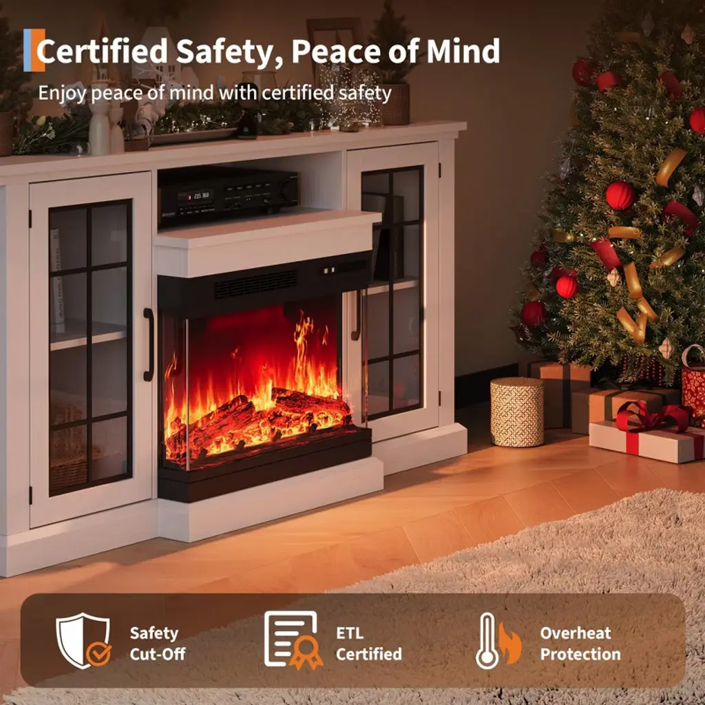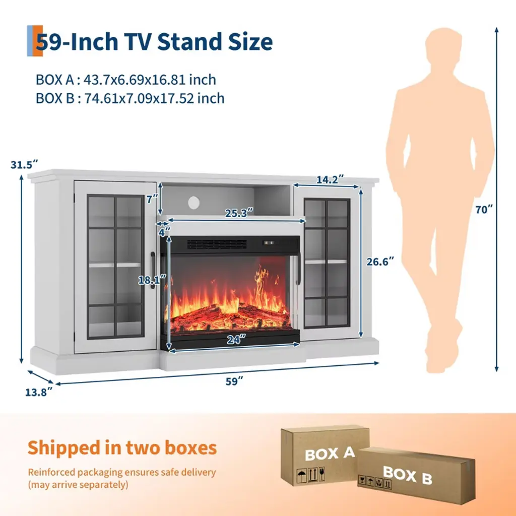 Fireplace TV Stand, 59" Fireplace TV Stand with 3-Sided Glass - Adjustable Flame Electric Fireplace, Modern Entertainment Center for TVs Up to 65", Farmhouse Console Table?? Farmhouse Elegance Meets Modern DisplayElevate your living space with this exquisite fireplace TV stand that masterfully blends rustic charm with contemporary functionality. Featuring stylish farmhouse-inspired glass doors, this cabinet adds a refined aesthetic while offering a glimpse into your curated storage. The versatile design complements any setting, from modern lofts to cozy cabins, while providing robust support for televisions up to 65 inches. The harmonious fusion of traditional elegance and modern utility creates a focal point that enhances your decor while serving practical entertainment needs.?? Immersive 3-Sided Fireplace ExperienceExperience breathtaking panoramic flame views with the innovative 3-sided glass fireplace design that creates an immersive ambient experience. This TV stand features 12 captivating backlight colors, 12 dynamic LED strip colors, and 5 adjustable flame brightness levels for complete customization of your home entertainment environment. The multi-dimensional viewing experience transforms your living space into a vibrant entertainment hub, providing a stunning visual centerpiece that can be tailored to match any mood or occasion with effortless precision.??? Durable Craftsmanship & Structural IntegrityCrafted from premium PB and MDF board materials, this TV stand with fireplace combines exceptional strength with long-term stability. The solid construction ensures safe support for your television and decorative items while maintaining its structural integrity through years of use. The robust materials and precision engineering create a reliable foundation that stands up to daily demands while serving as a striking centerpiece in your living room setup. The attention to detail in construction guarantees both aesthetic appeal and practical durability.?? Smart Storage for Organized LivingMaximize your space organization with the intelligent combination of open shelving and concealed cabinets that provide versatile storage solutions. The generous 59-inch wide tabletop accommodates televisions up to 65 inches while the thoughtfully designed compartments house media devices, books, and decorative items. This strategic storage approach maintains a tidy, stylish environment while ensuring all your entertainment essentials remain accessible yet discreetly organized. The balanced layout eliminates clutter while enhancing the overall functionality of your living space.?? Hassle-Free Assembly ProcessEnjoy a straightforward setup experience with comprehensive step-by-step illustrated instructions and clearly labeled parts that streamline assembly. Designed with user convenience as a priority, this fireplace TV stand includes all necessary hardware for quick and stress-free installation. Simply unpack the components, follow the intuitive guide, and transform your packaged items into an elegant entertainment center without complications. The logical design and clear documentation ensure you can quickly begin enjoying your new focal point furniture piece.?? Technical Specifications: Product Dimensions: 63.98"D x 9.84"W x 21.65"H TV Capacity: Up to 65 inches Material: Engineered Wood (Premium PB & MDF Board) Finish Type: Polished Installation Type: Freestanding Color: White Item Weight: 143.08 Pounds Special Feature: Adjustable Flame Fireplace Type: 3-Sided Glass Electric Fireplace Lighting Options: 12 Backlight Colors, 12 LED Strip Colors Flame Settings: 5 Adjustable Brightness Levels Included Components: Fireplace TV Stand, All Hardware Assembly Required: Yes ? Key Product Features:? 3-sided fireplace - panoramic glass viewing from multiple angles? Adjustable lighting - 12 backlight colors + 12 LED strip colors