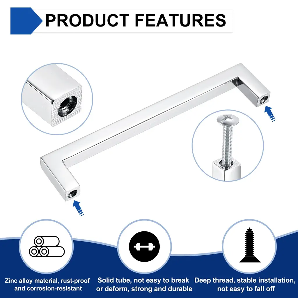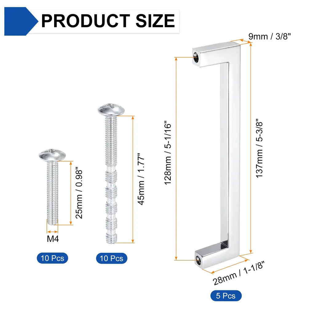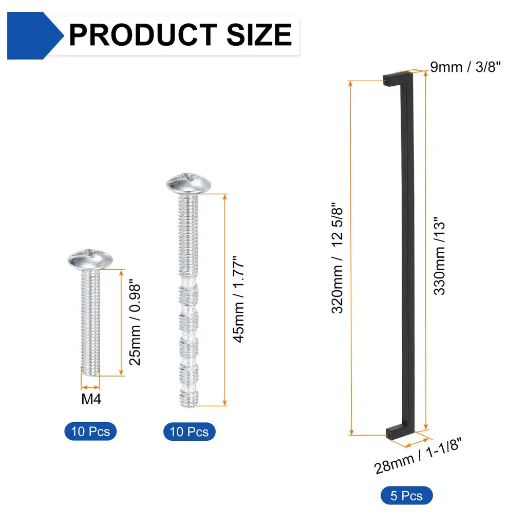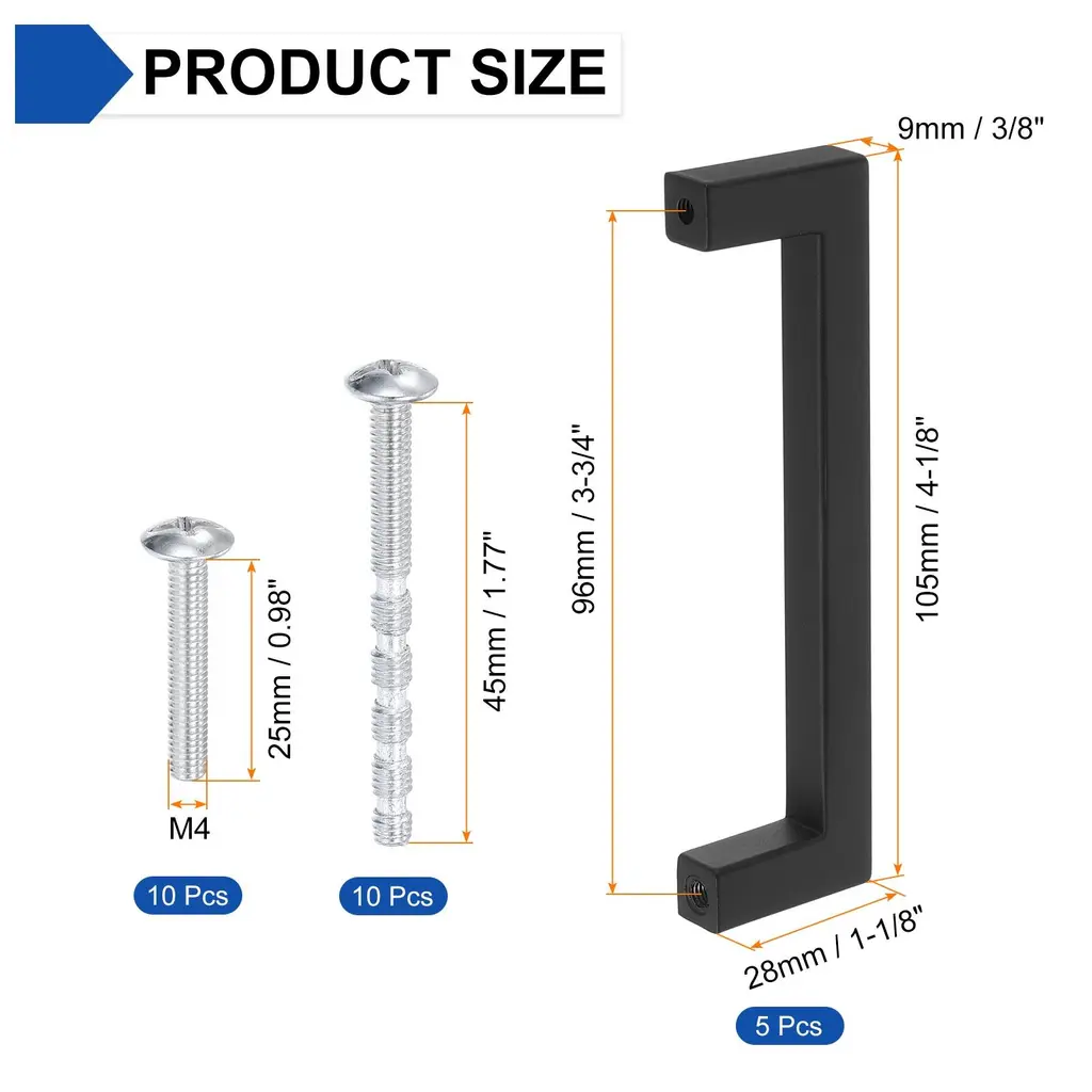 Description[Material] - Our drawer bar pulls are made of zinc alloy, they are solid tube structure, which is more robust, durable and corrosion-resistant, easy to use and has a long service life.[Slim Square Design] - The cabinets handle with a slim square appearance, its simple and modern design is suited for farmhouse, vintage, traditional and transitional styles. These handles will give your cabinets a clean and tidy look, easily enhancing the elegance of your cabinets doors and drawers.[Deep Hole Thread Design] - These square cabinets pulls have a thick solid base, which is not easy to break and deform. The deep threads allow the screws to bite more tightly, making the handle and the cabinets door heel fit together and not easy to fall off, making it easy to pull out the drawer.[Wide Application] - The Kitchen Cabinets Handles are great furniture hardware accessories, suitable for different styles of furniture and rooms. Such as kitchen cabinets, drawers, cupboards, wardrobes, bedside tables, etc.SpecificationMaterial: Zinc AlloyScrew-hole Center: 3 3/4 inch(96mm)Overall Length: 4 1/8 inch(105mm)Width: 3/8 inch(9mm)Height: 1 1/8 inch(28mm)Hole Thread Specifications: M4Color: BlackPackage Includes5pcs x Square Drawer Handles10pcs x 25mm Screws10pcs x 45mm Screws