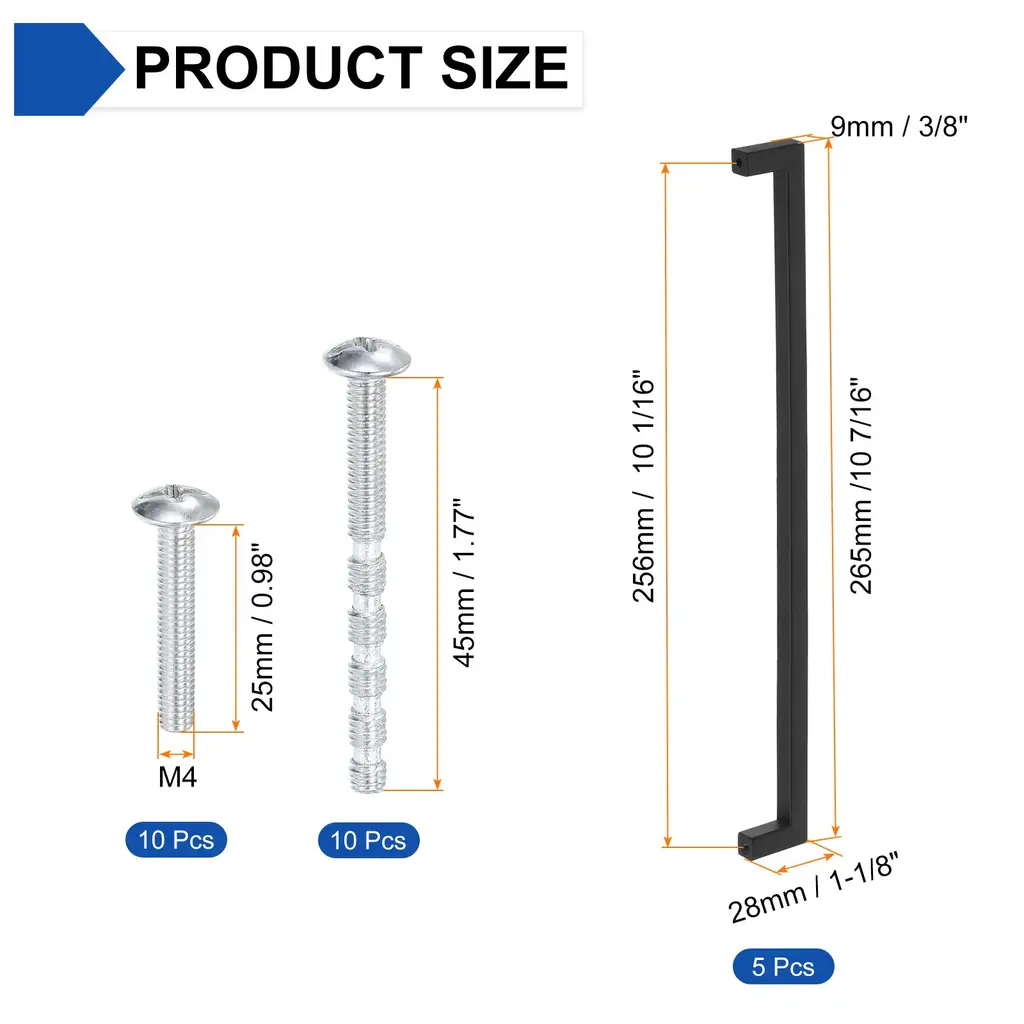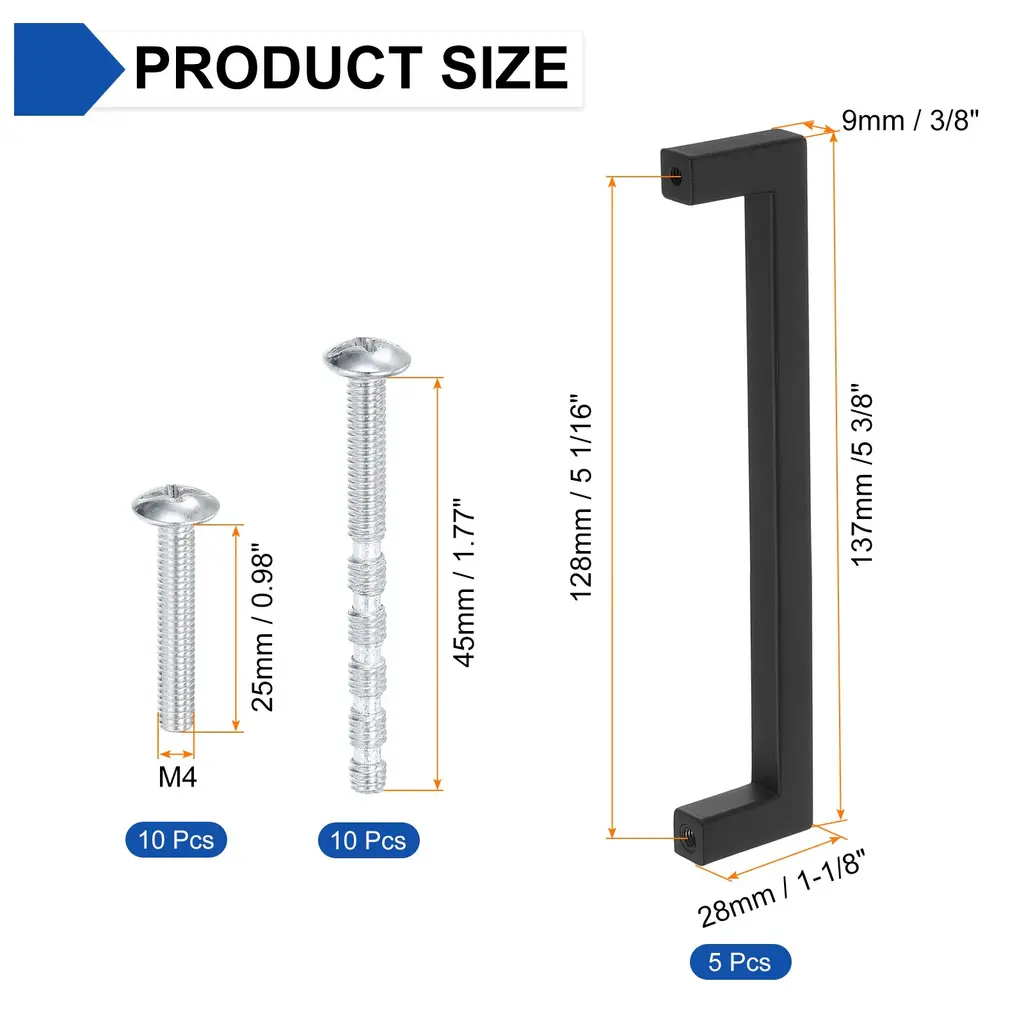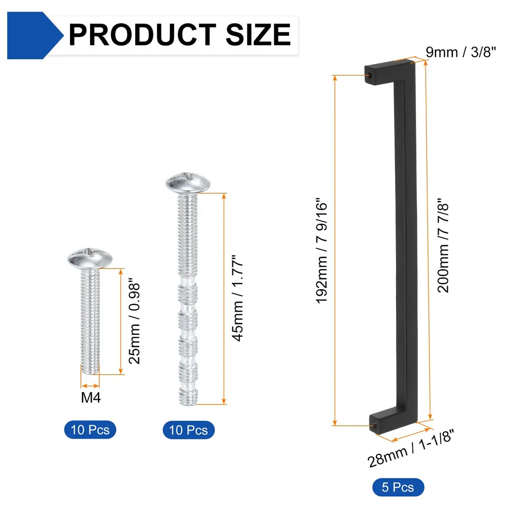 Description[Material] - Our drawer bar pulls are made of zinc alloy, they are solid tube structure, which is more robust, durable and corrosion-resistant, easy to use and has a long service life.[Slim Square Design] - The cabinets handle with a slim square appearance, its simple and modern design is suited for farmhouse, vintage, traditional and transitional styles. These handles will give your cabinets a clean and tidy look, easily enhancing the elegance of your cabinets doors and drawers.[Deep Hole Thread Design] - These square cabinets pulls have a thick solid base, which is not easy to break and deform. The deep threads allow the screws to bite more tightly, making the handle and the cabinets door heel fit together and not easy to fall off, making it easy to pull out the drawer.[Wide Application] - The Kitchen Cabinets Handles are great furniture hardware accessories, suitable for different styles of furniture and rooms. Such as kitchen cabinets, drawers, cupboards, wardrobes, bedside tables, etc.SpecificationMaterial: Zinc AlloyScrew-hole Center: 3 3/4 inch(96mm)Overall Length: 4 1/8 inch(105mm)Width: 3/8 inch(9mm)Height: 1 1/8 inch(28mm)Hole Thread Specifications: M4Color: BlackPackage Includes5pcs x Square Drawer Handles10pcs x 25mm Screws10pcs x 45mm Screws